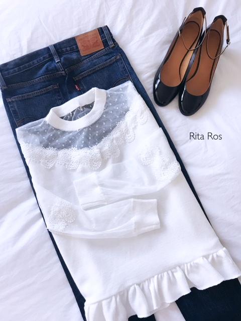 Jersey de punto manga larga con encaje en mangas, escote y espalda y detalle de volante en cintura. Una prenda con un encanto especial.