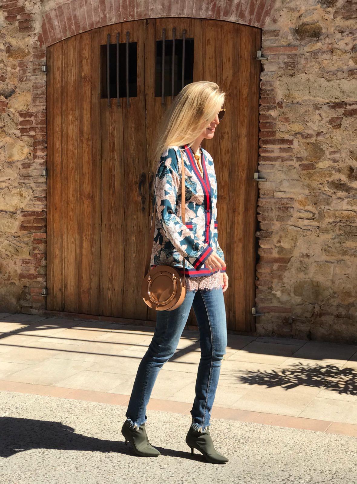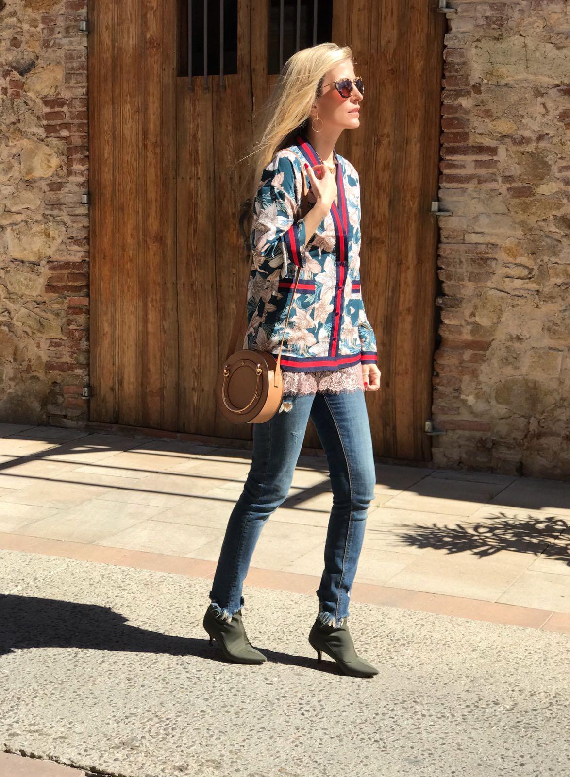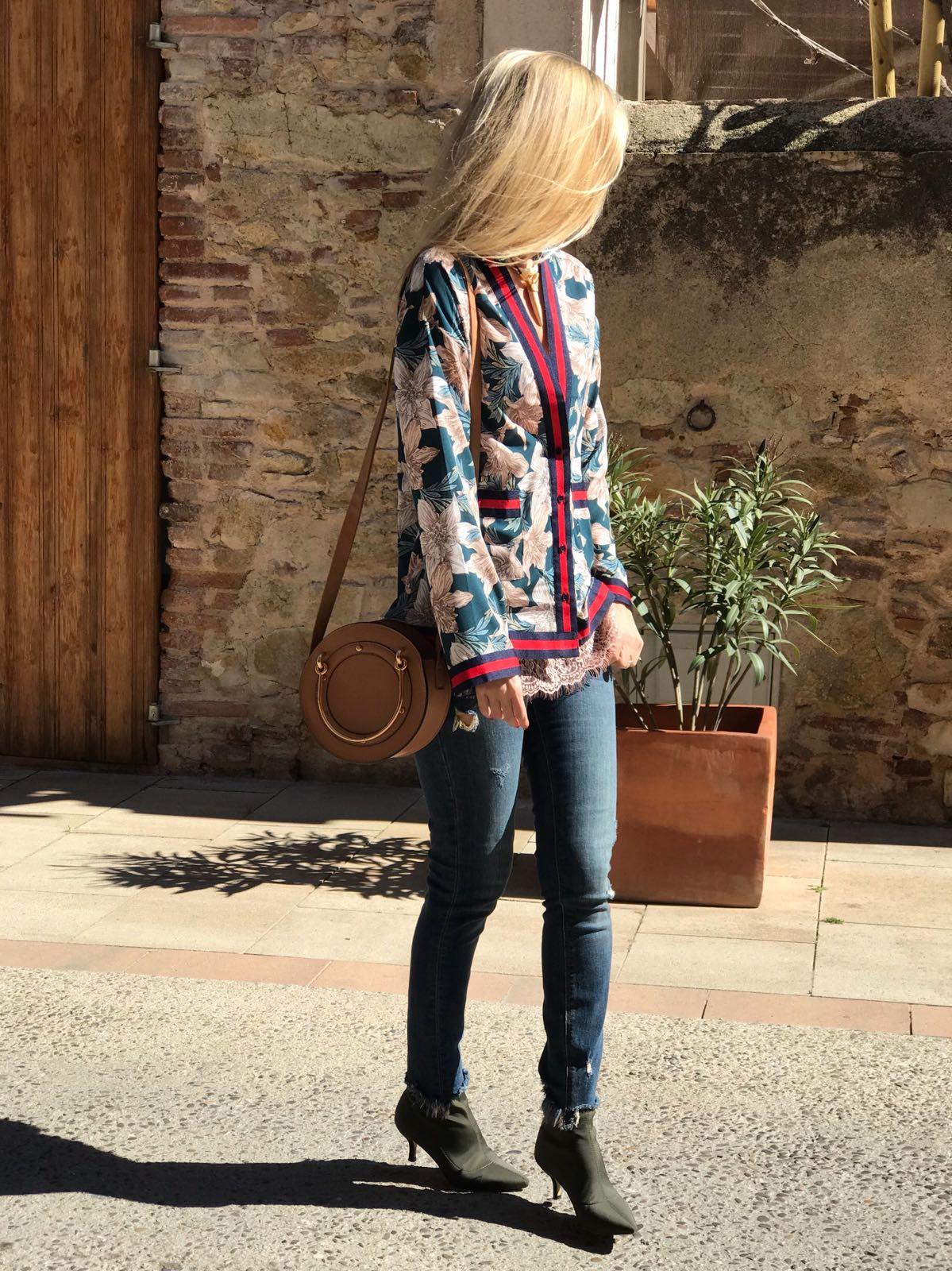 Americana fluida con precioso estampado de flores y detalle de rallas en solapa, bolsillos y puños.