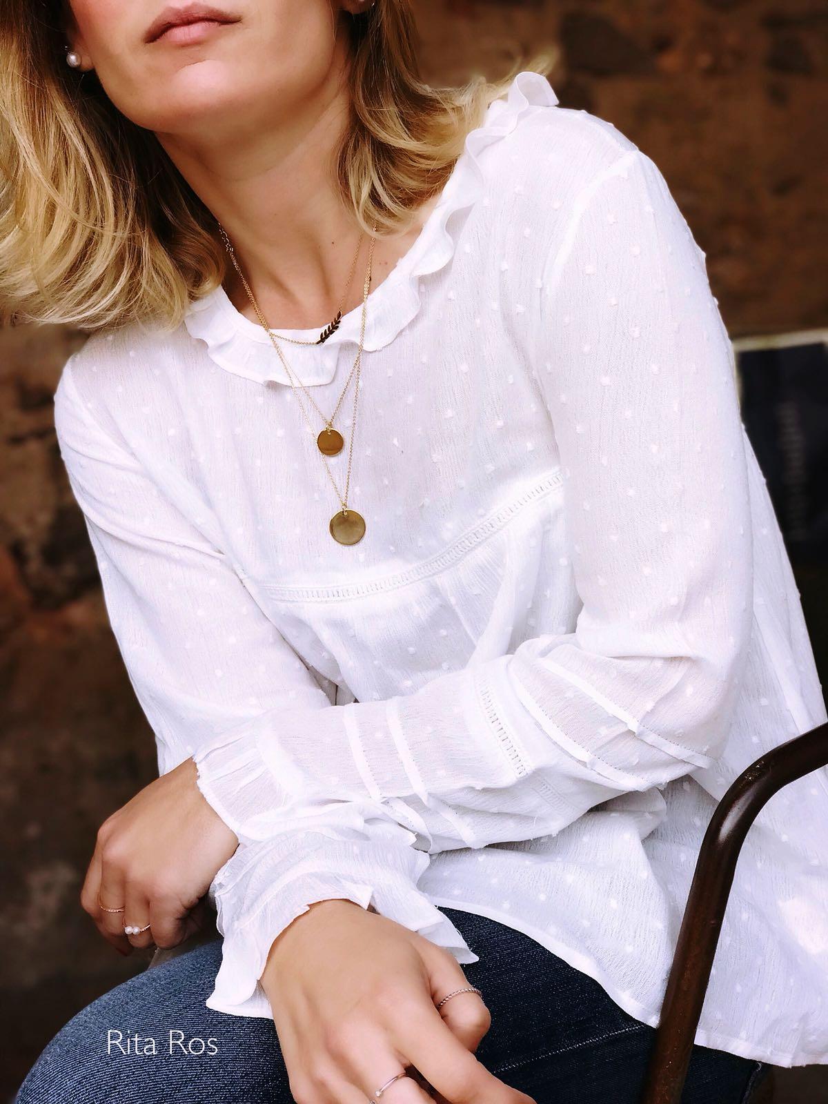 Blusa blanca de tejido tipo plumeti, manga larga y cuello redondo acabado en volantito.