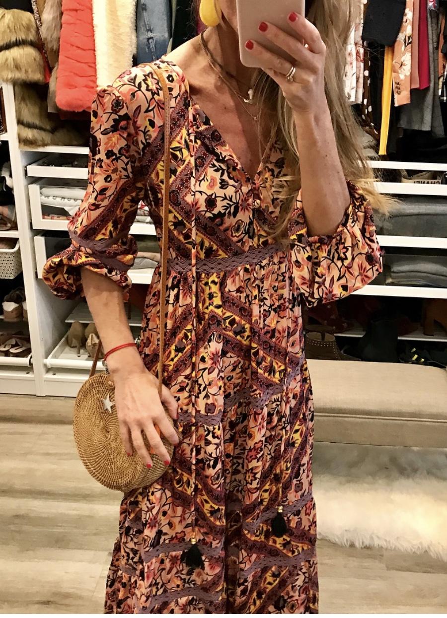 Vestido largo fluido, estampado de flores, cuello redondo anudado con cinta acabada en pompón y detalle bordado en cintura, mangas y falda.
