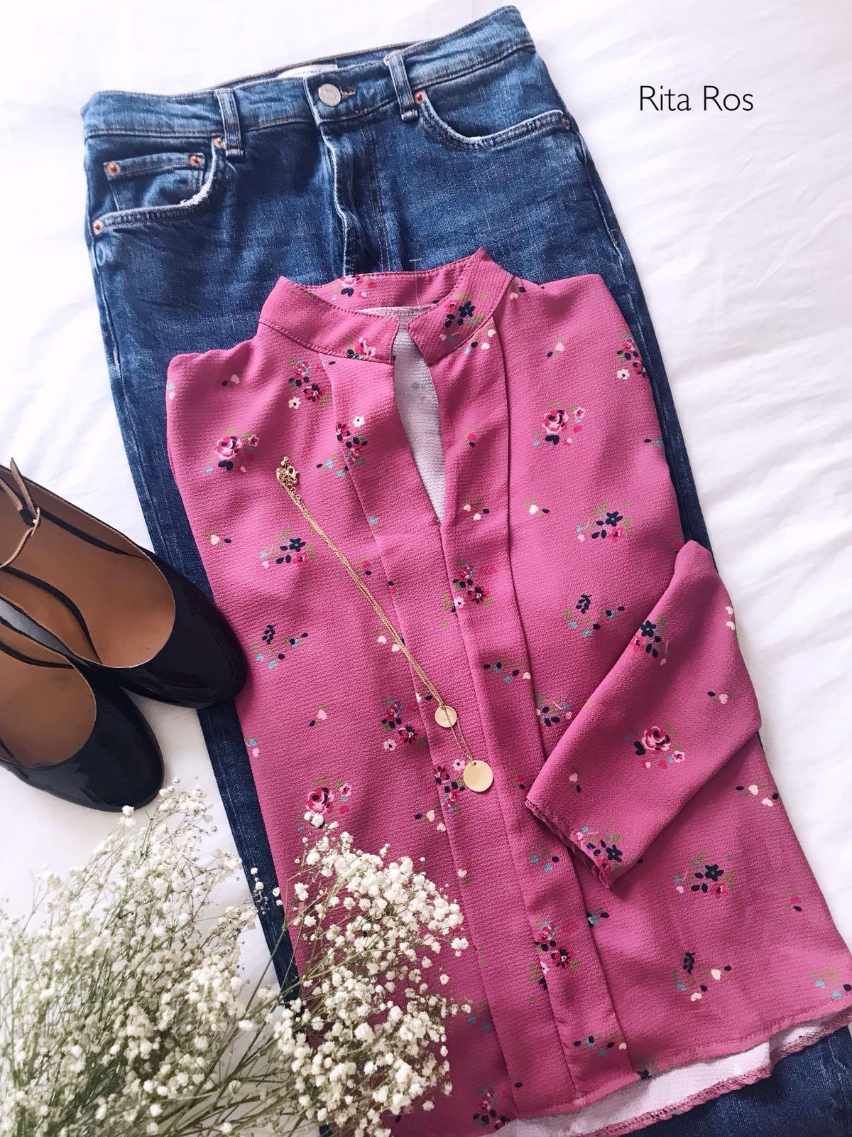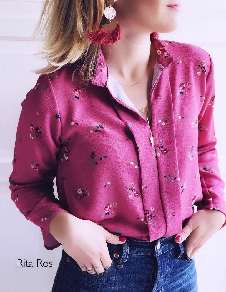 Blusa de manga larga y cuello mao estampada de flores sobre fondo blanco. Escote abierto y acabado en pico y detalle plisado.