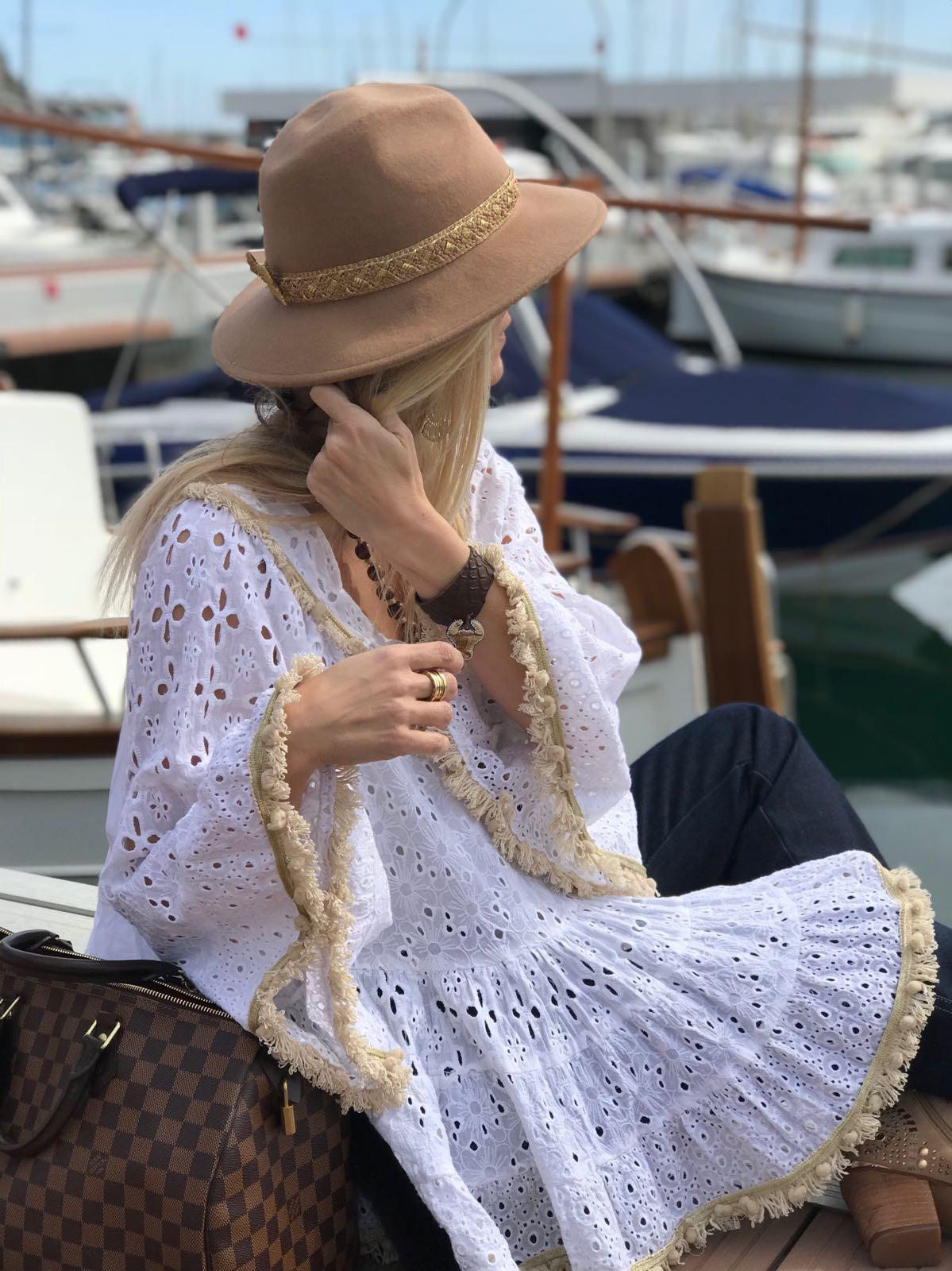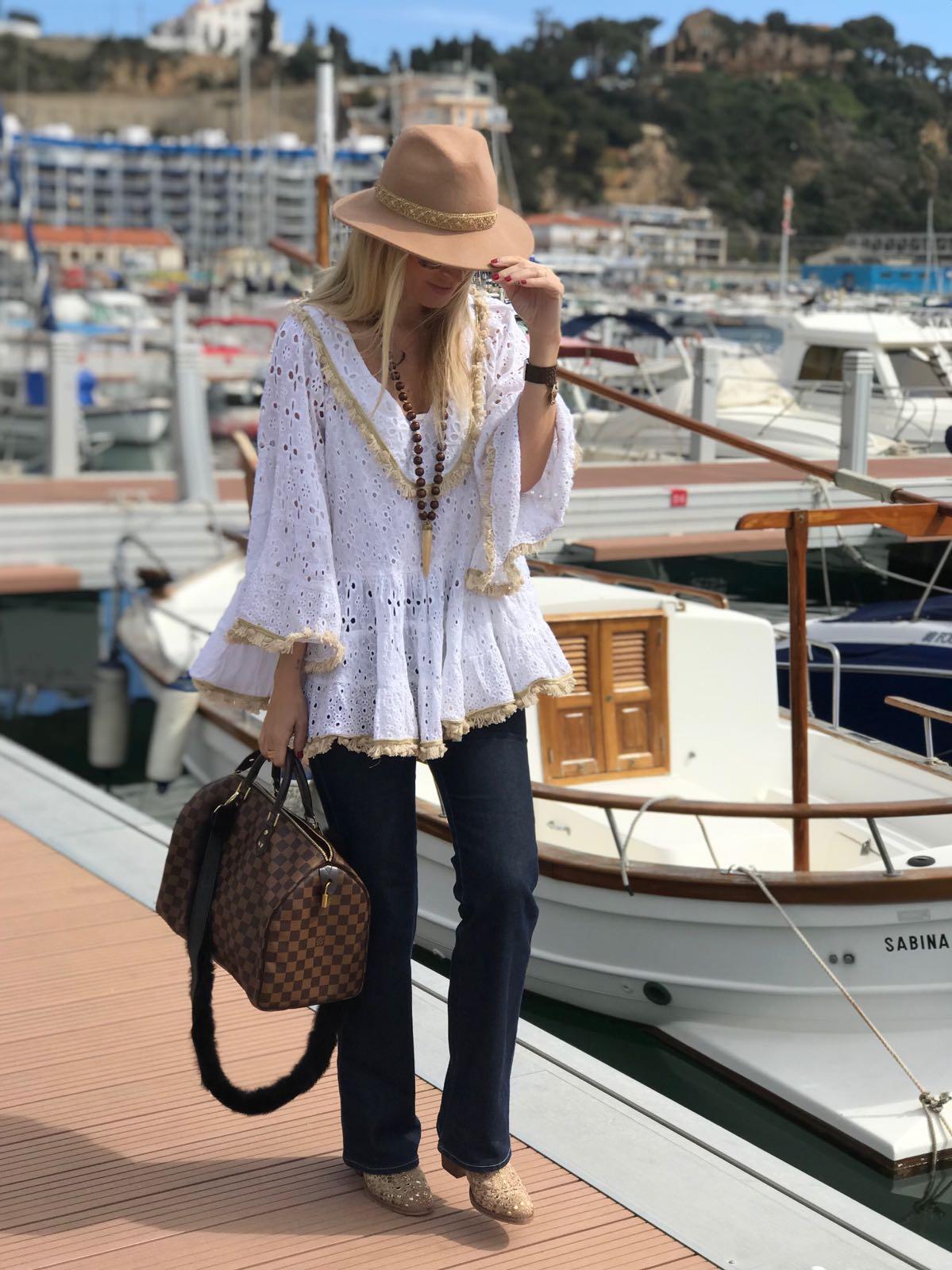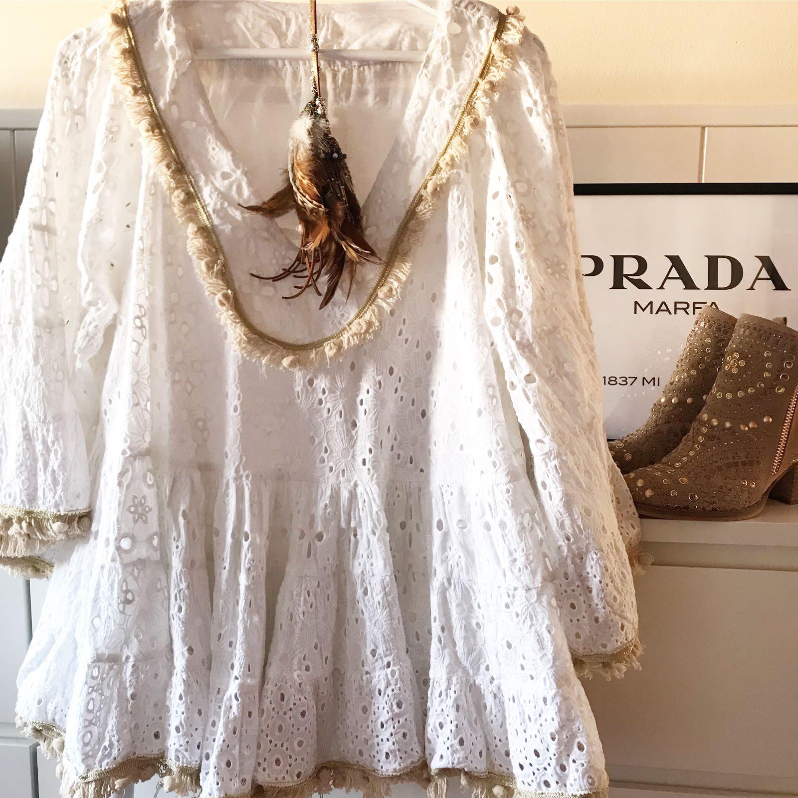 Blusa bordada de estilo boho con manga ancha acampanada y escote en pico. Ribetes acabados en flecos color beige.