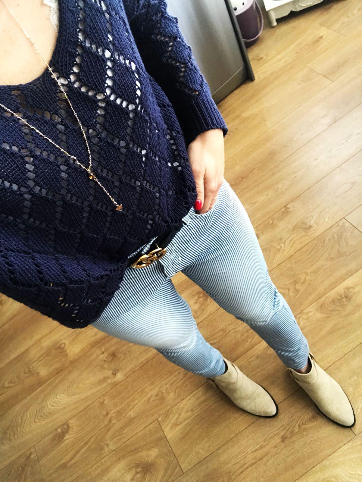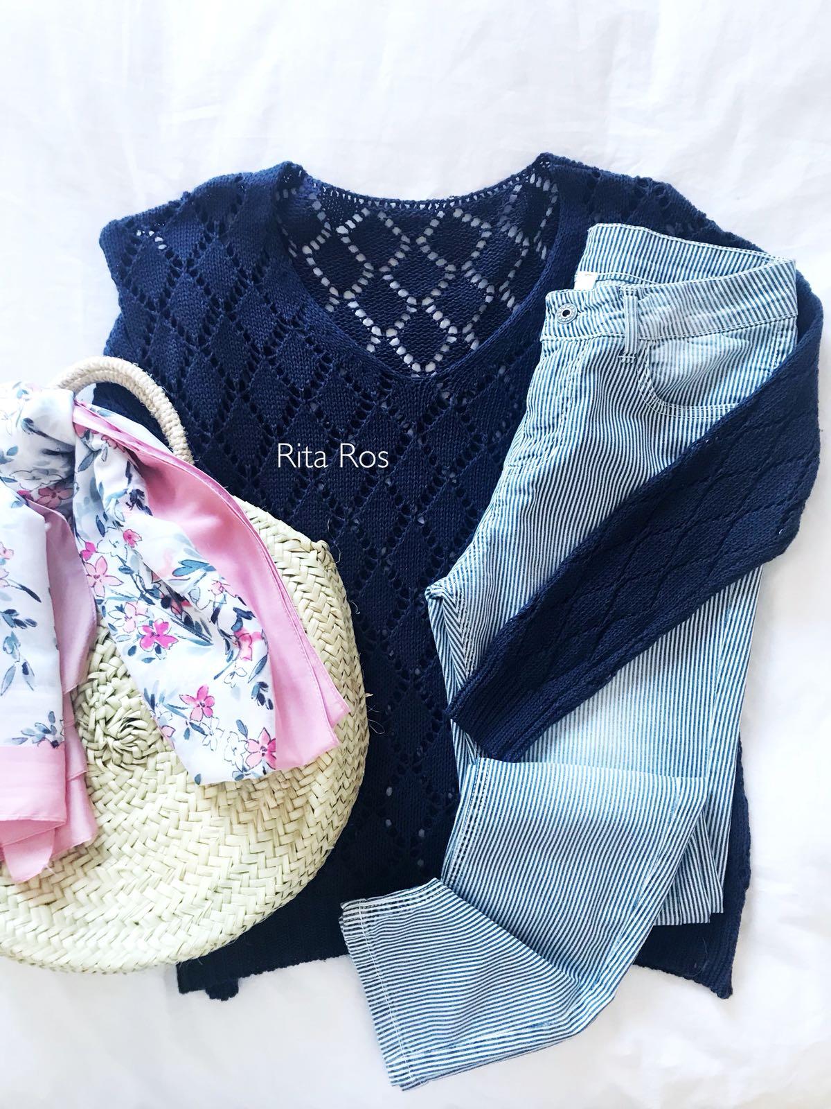 Pantalón rayas tipo pitillo y de tiro medio. Cinco bolsillos, cierre con cremallera y botón.