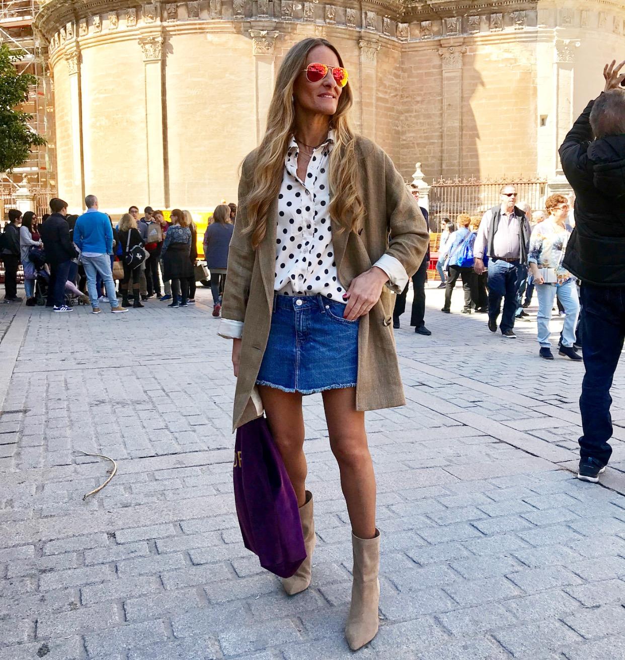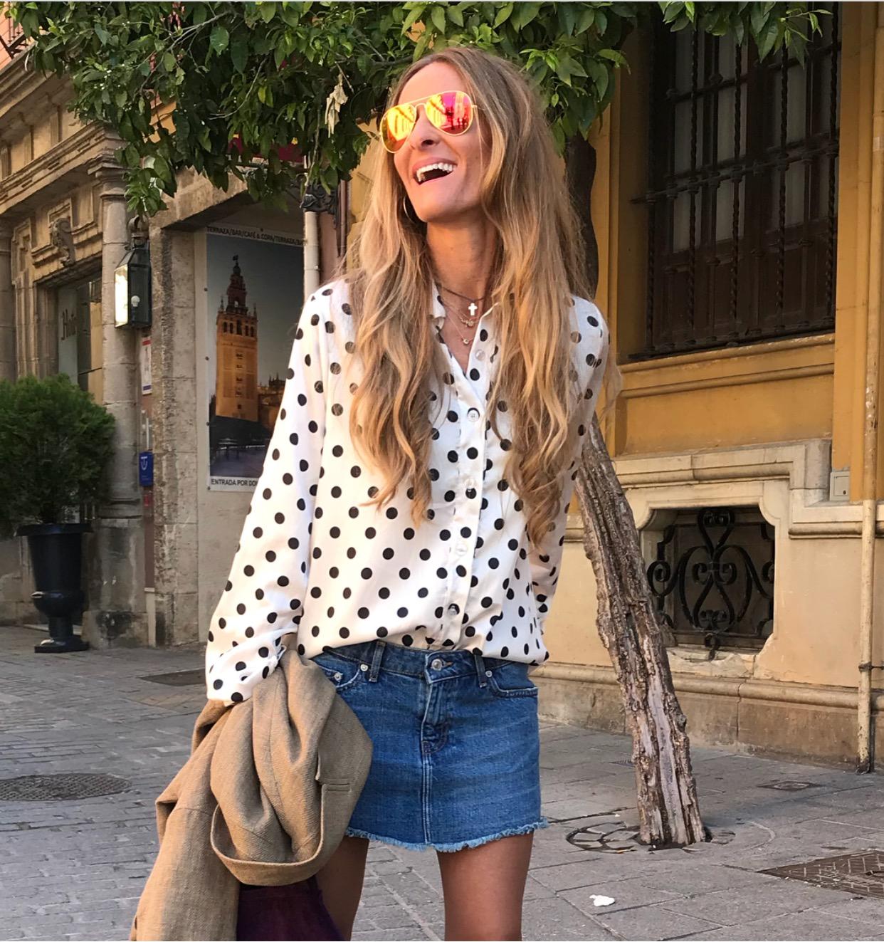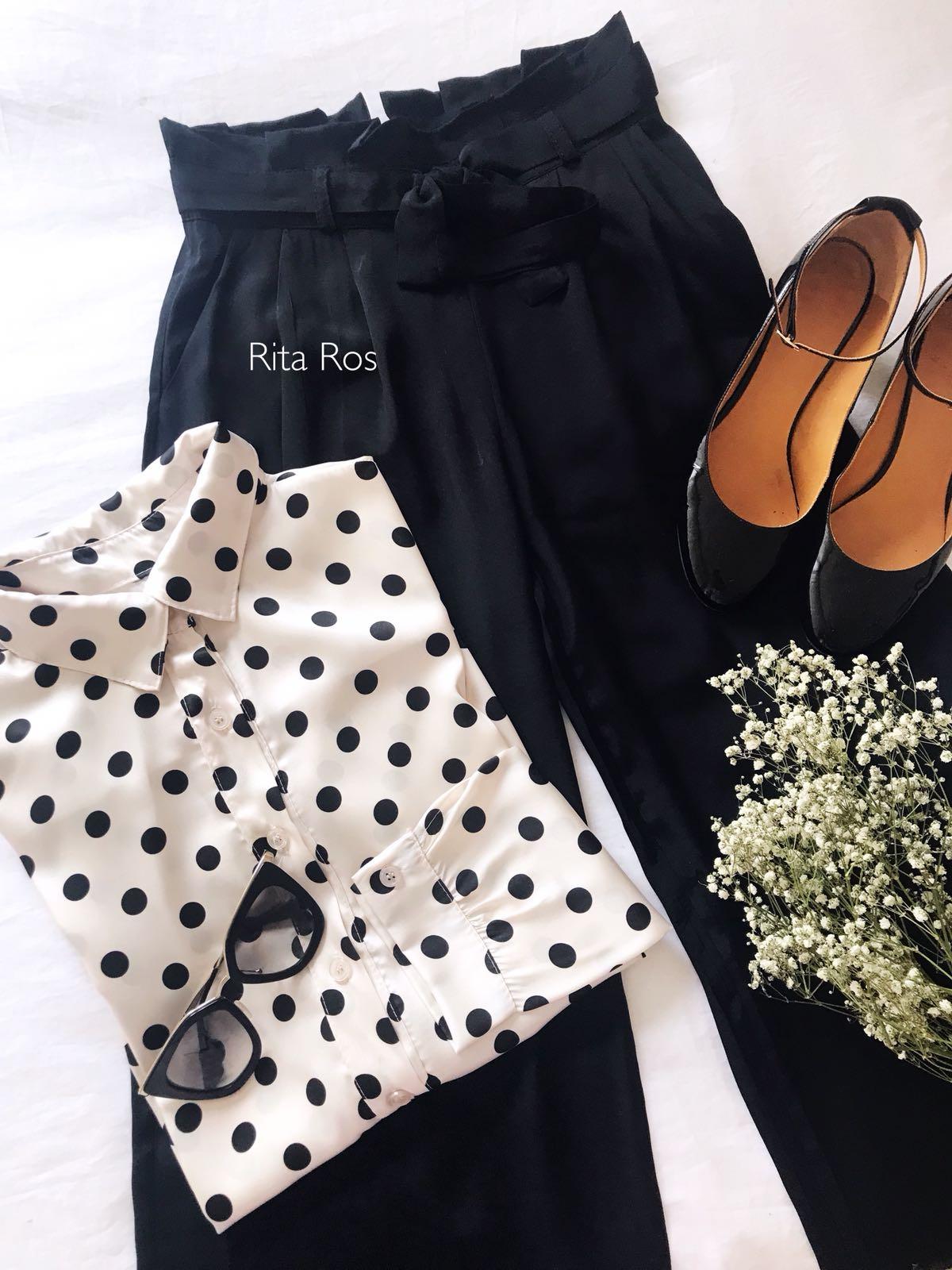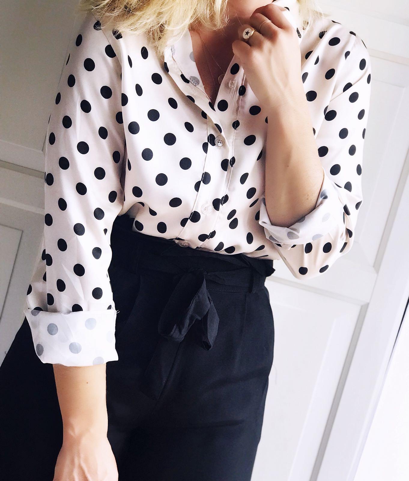 Blusa de manga larga estampada de lunares color negro sobre fondo beige.