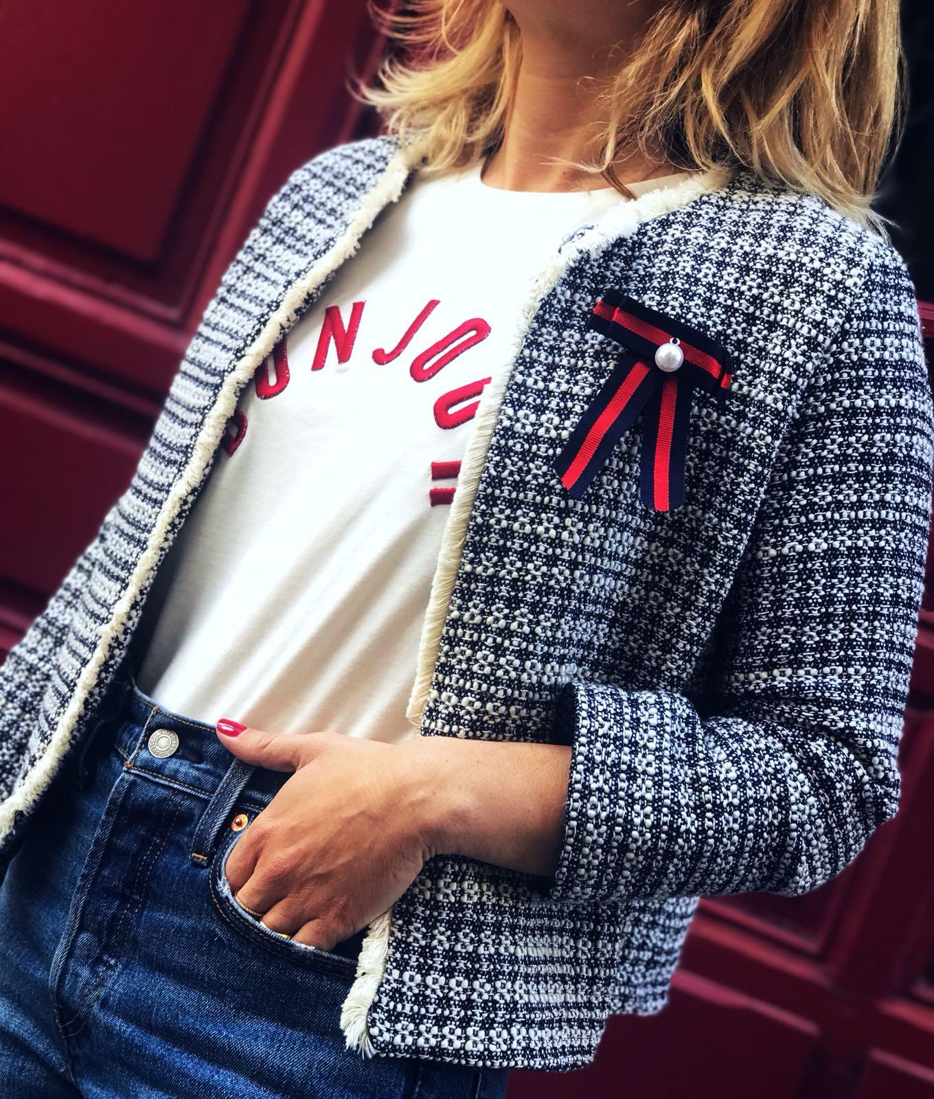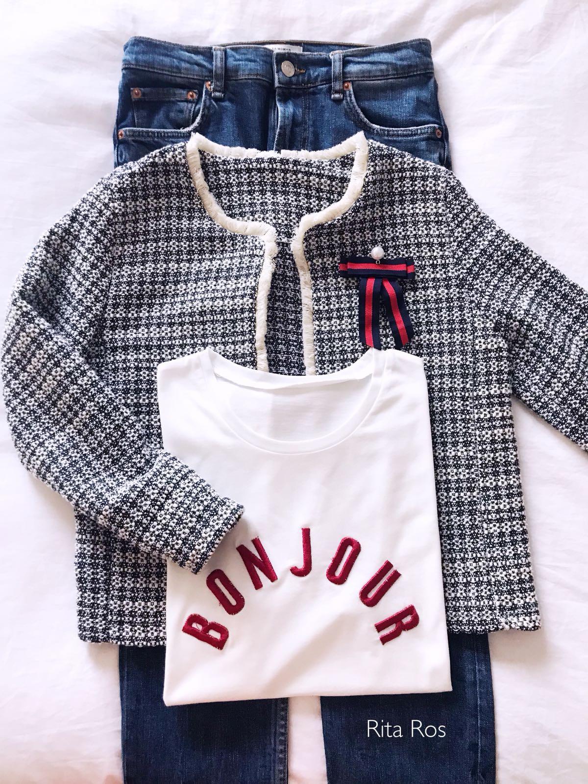 Camiseta blanca, manga corta y cuello redondo con detalle letras bordadas en color rojo. La hemos combinado con nuestra chaqueta Audrey tipo chanelera y la combinación es perfecta.