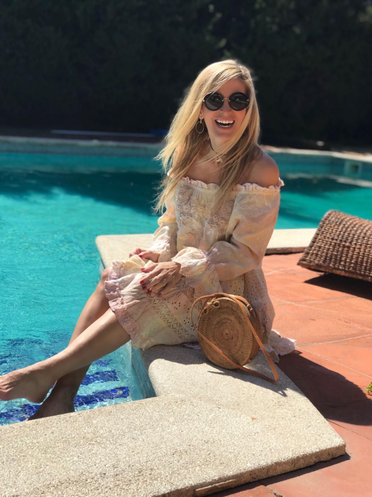 Vestido corto de estilo boho desteñido, escote elástico con hombros descubiertos, detalles en bordado y acabado volantes en mangas y bajo.