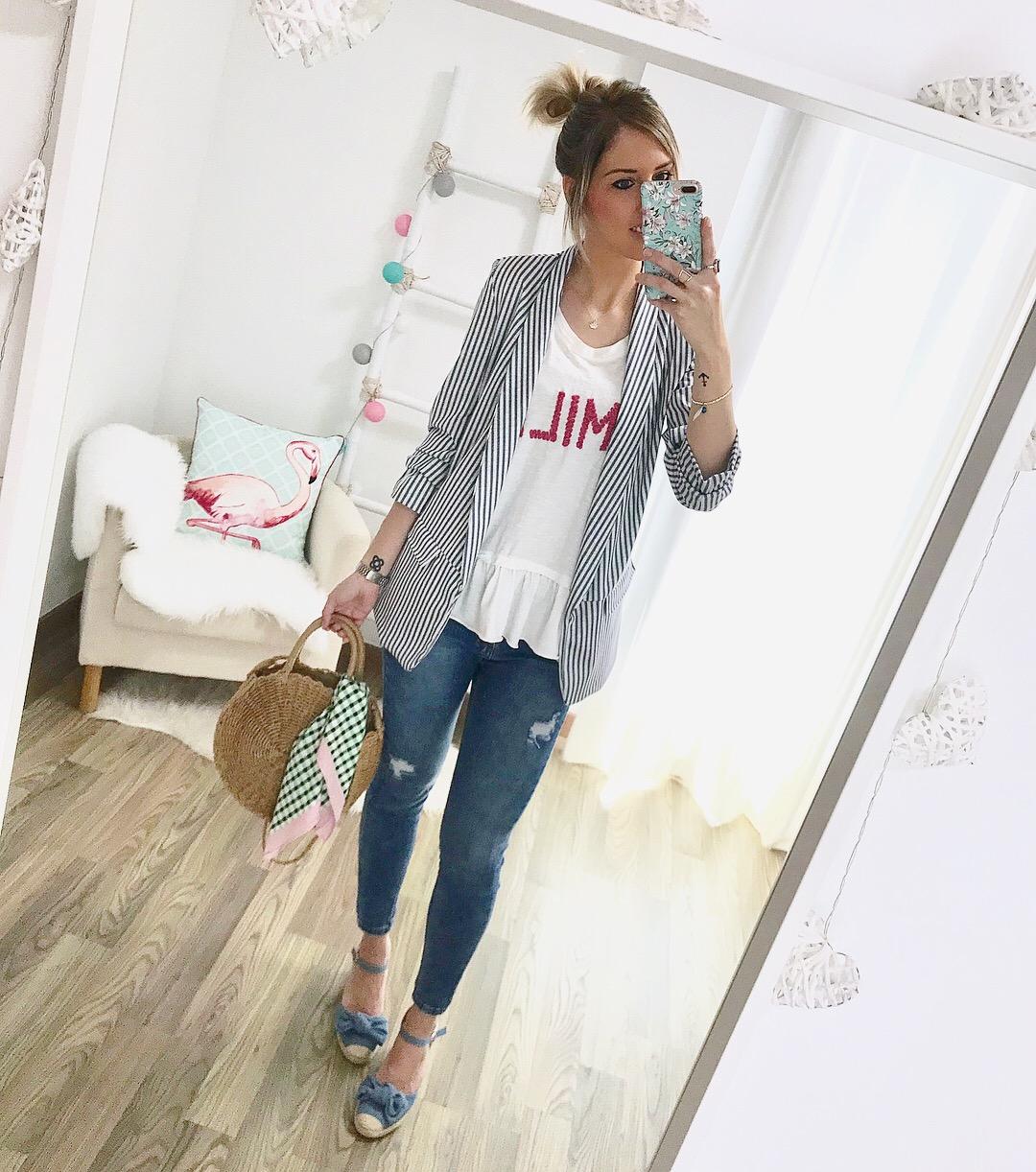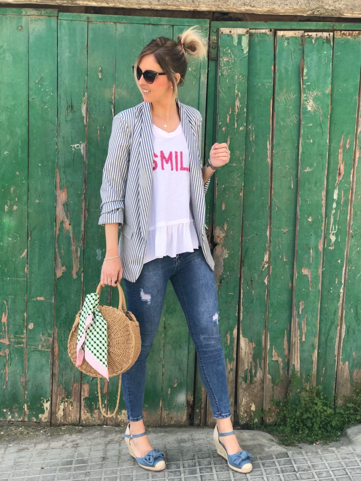 Americana de rayas azul y blancas súper cómoda con cuello tipo smoking y manga larga fruncida.