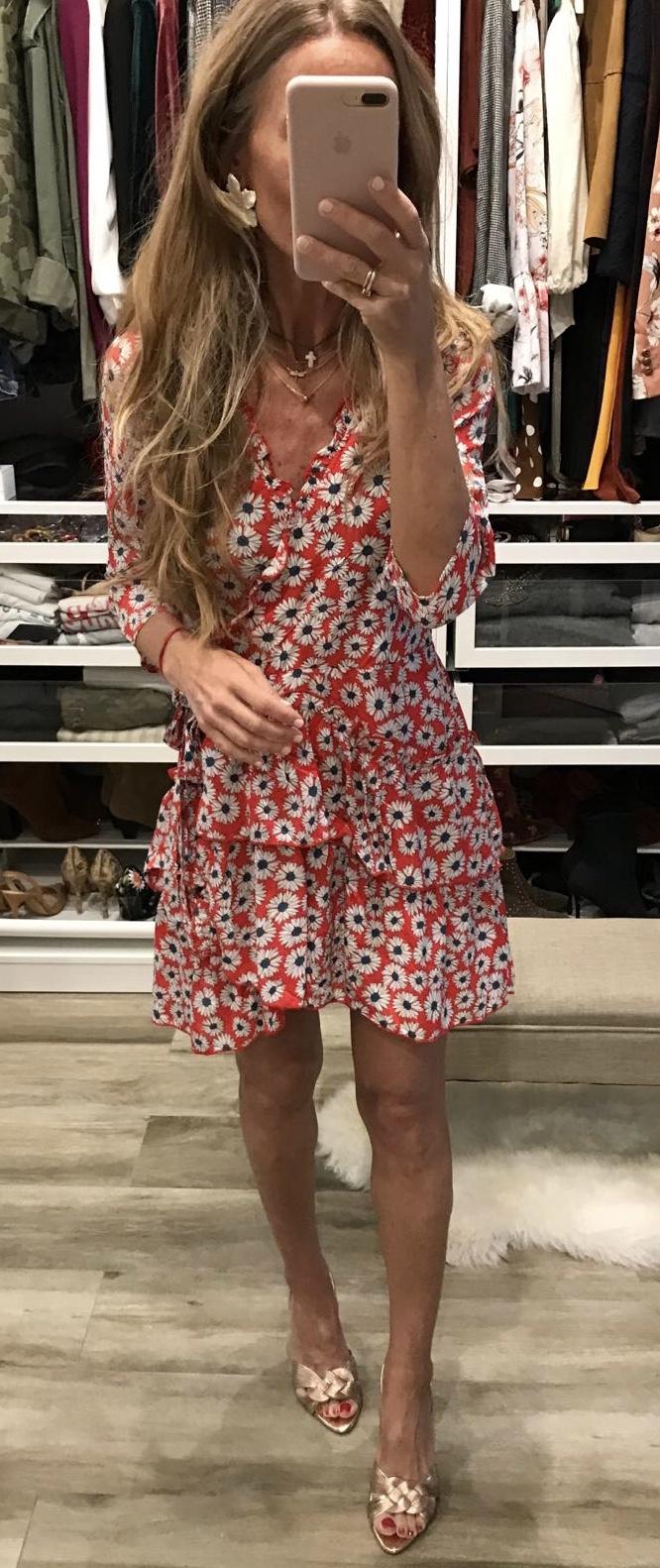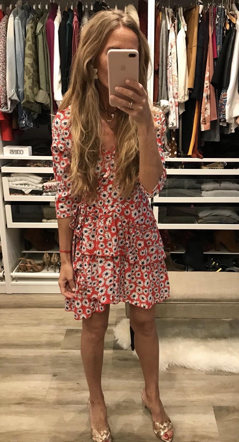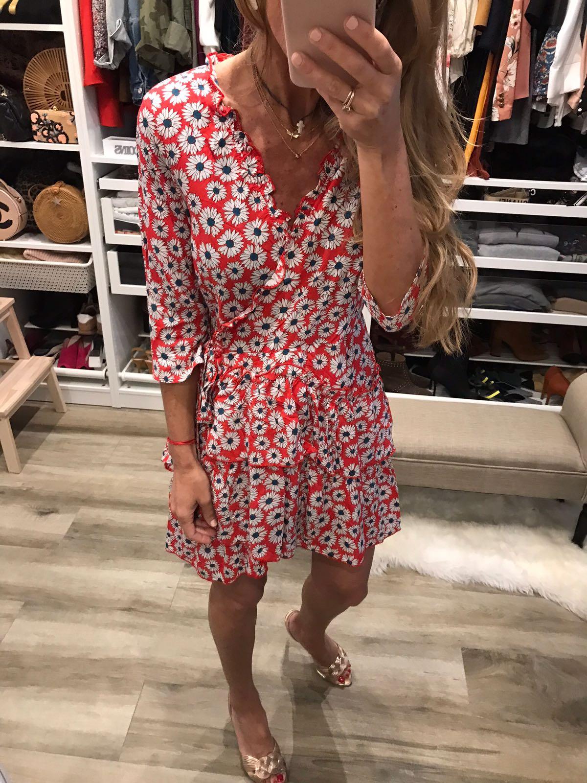 Vestido corto estampado de flores, manga 3/4, escote cruzado y detalle de volantes en escote y bajo. Un vestido con un corte muy favorecedor.