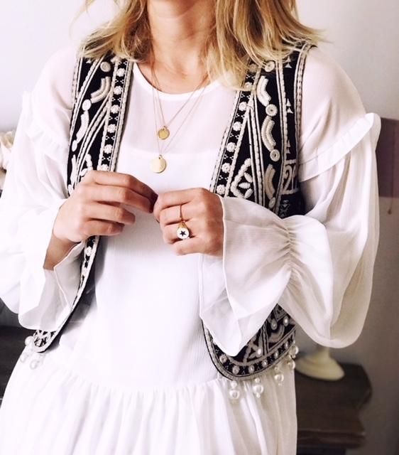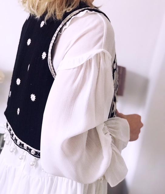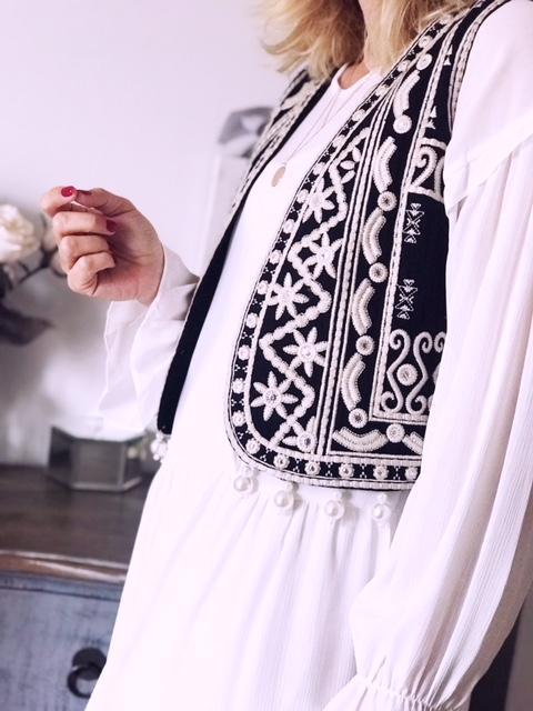 Chaleco color negro bordado y detalle perlas en el bajo.