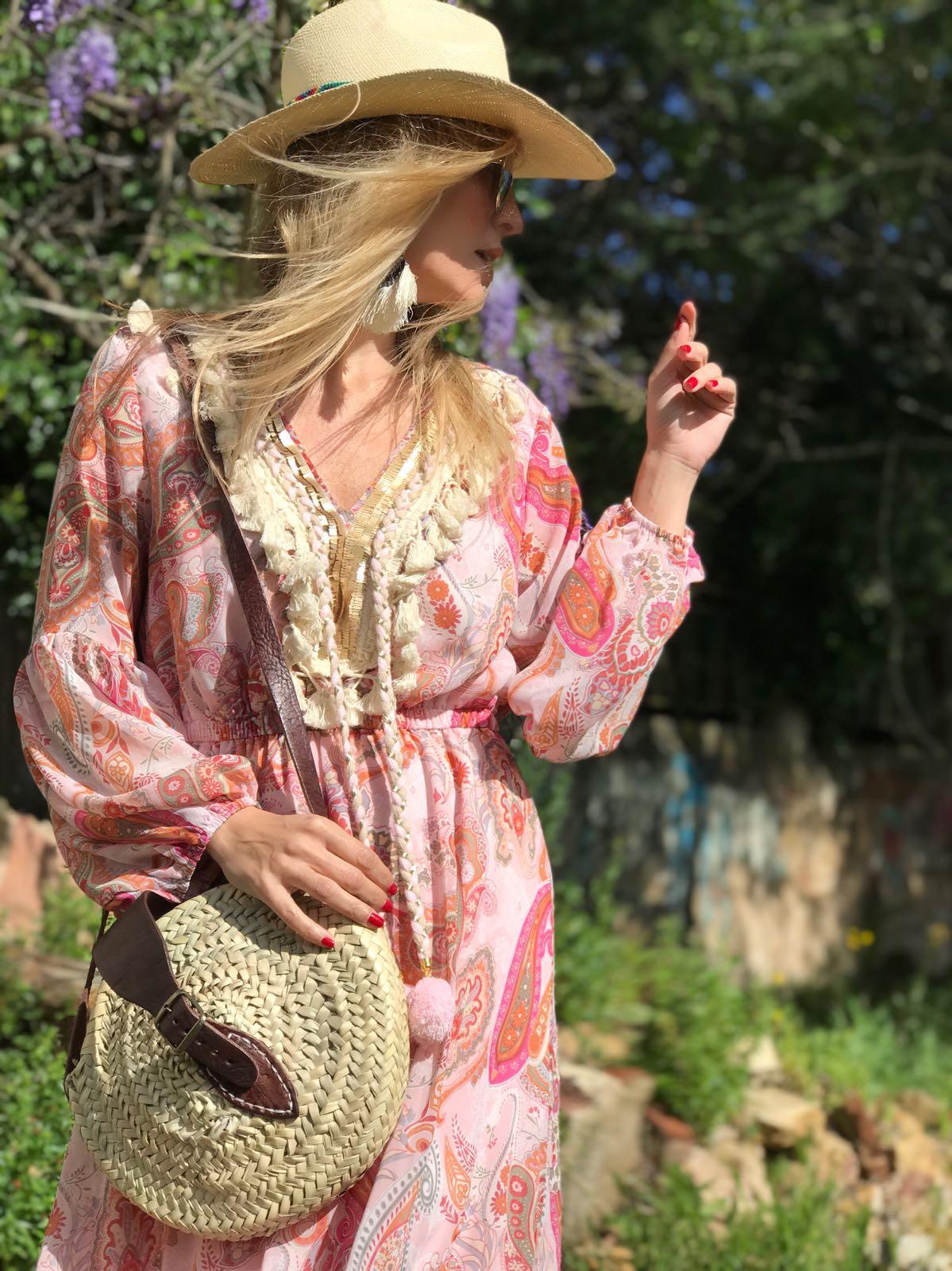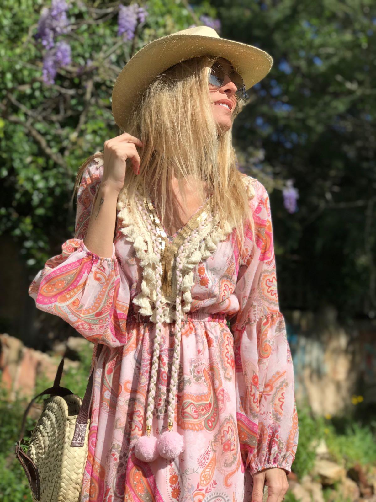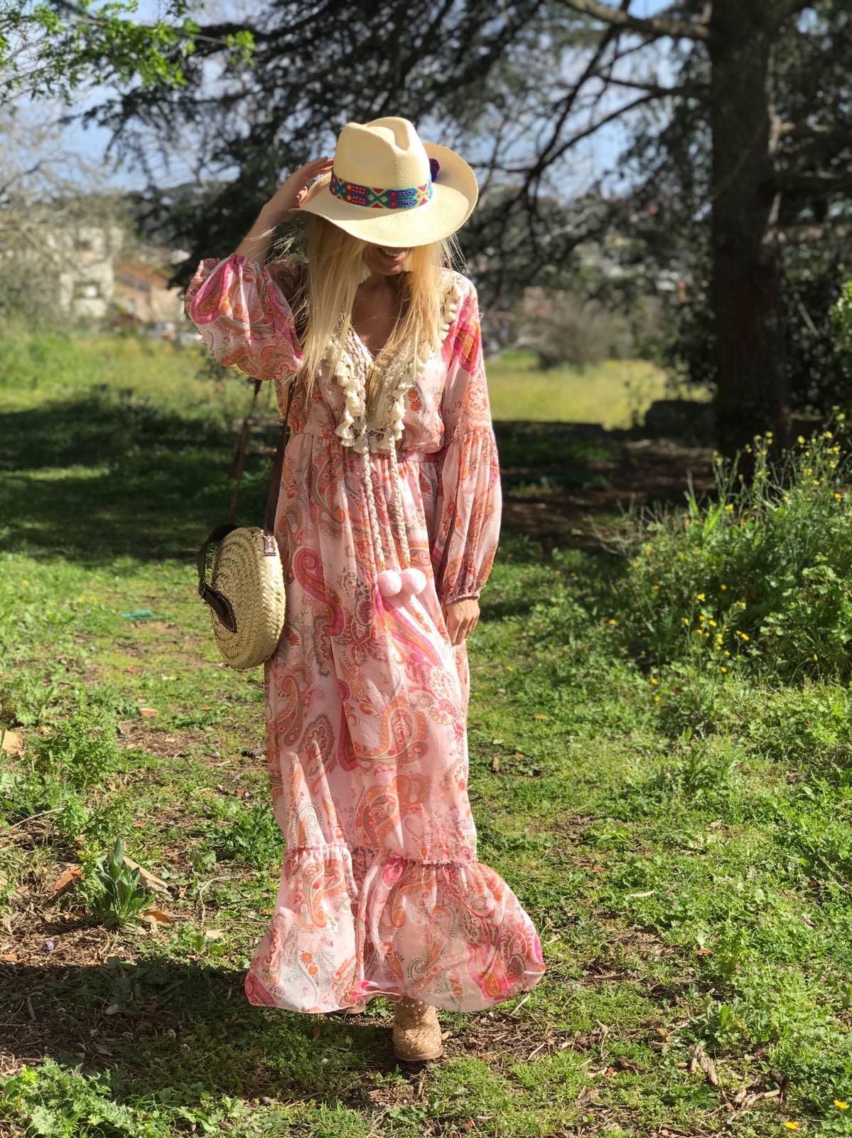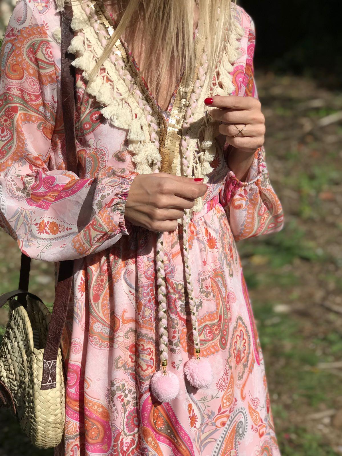 Vestido largo estampado, manga larga y escote en pico con detalle bordado y pompones. Una maravilla de vestido súper elegante de aire romántico lleno de detalles.