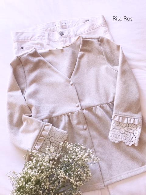 Chaqueta corta fruncida en cintura, escote en pico y mangas acabadas en bordado. Una chaqueta preciosa ideal para entretiempo.