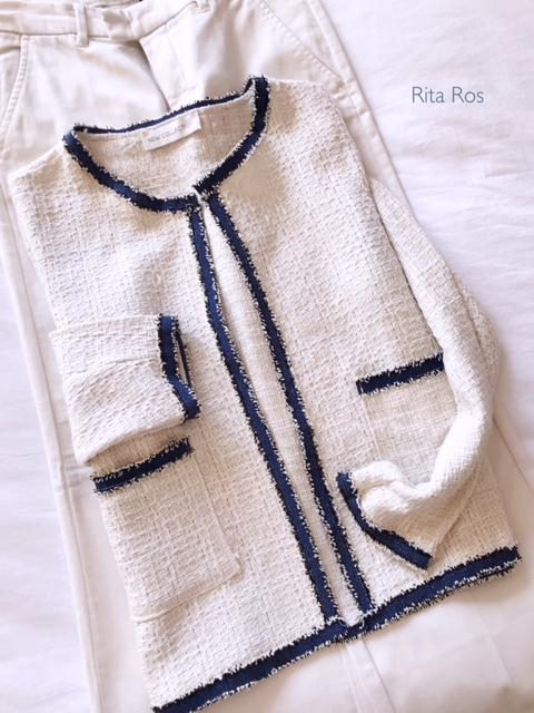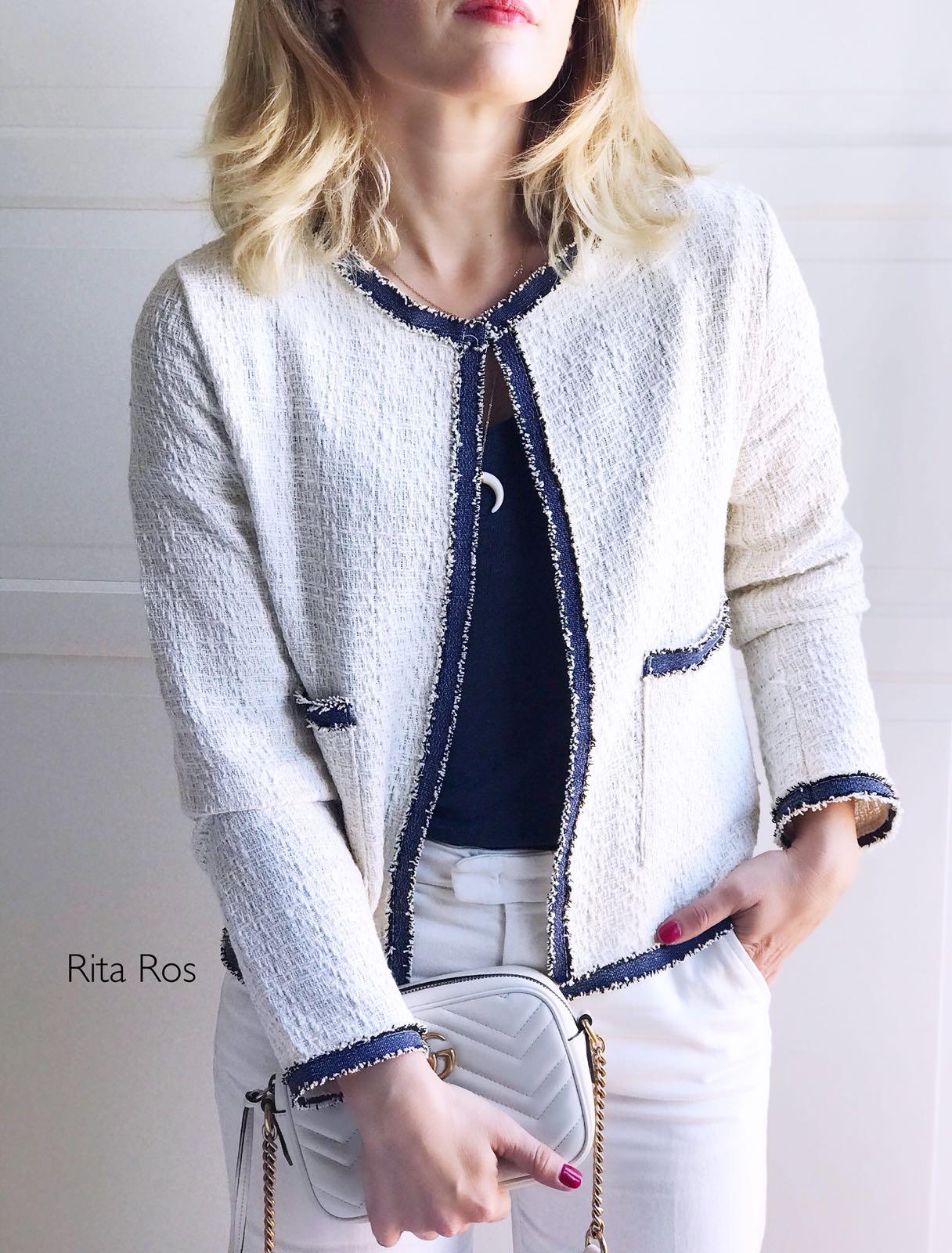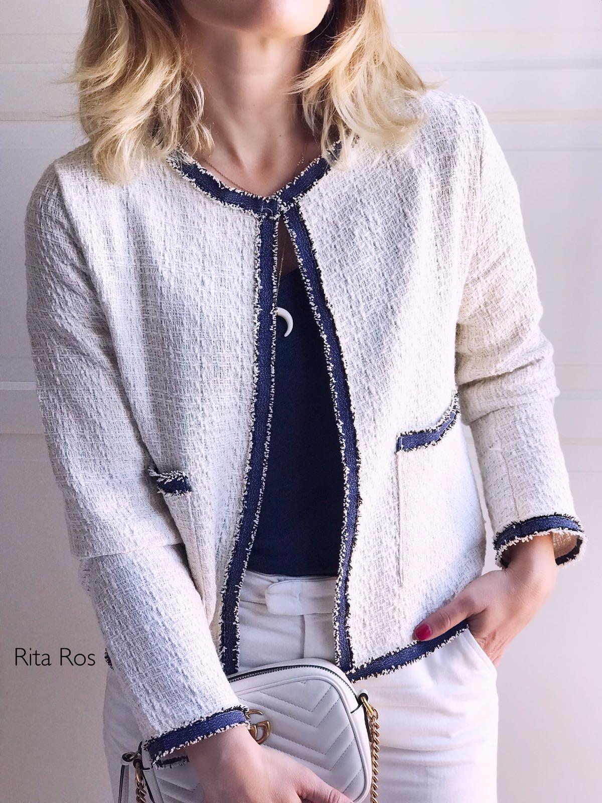 Chaqueta tipo chanelera en color beige claro con detalle tejano en cuello, ribete, mangas y bolsillos.
