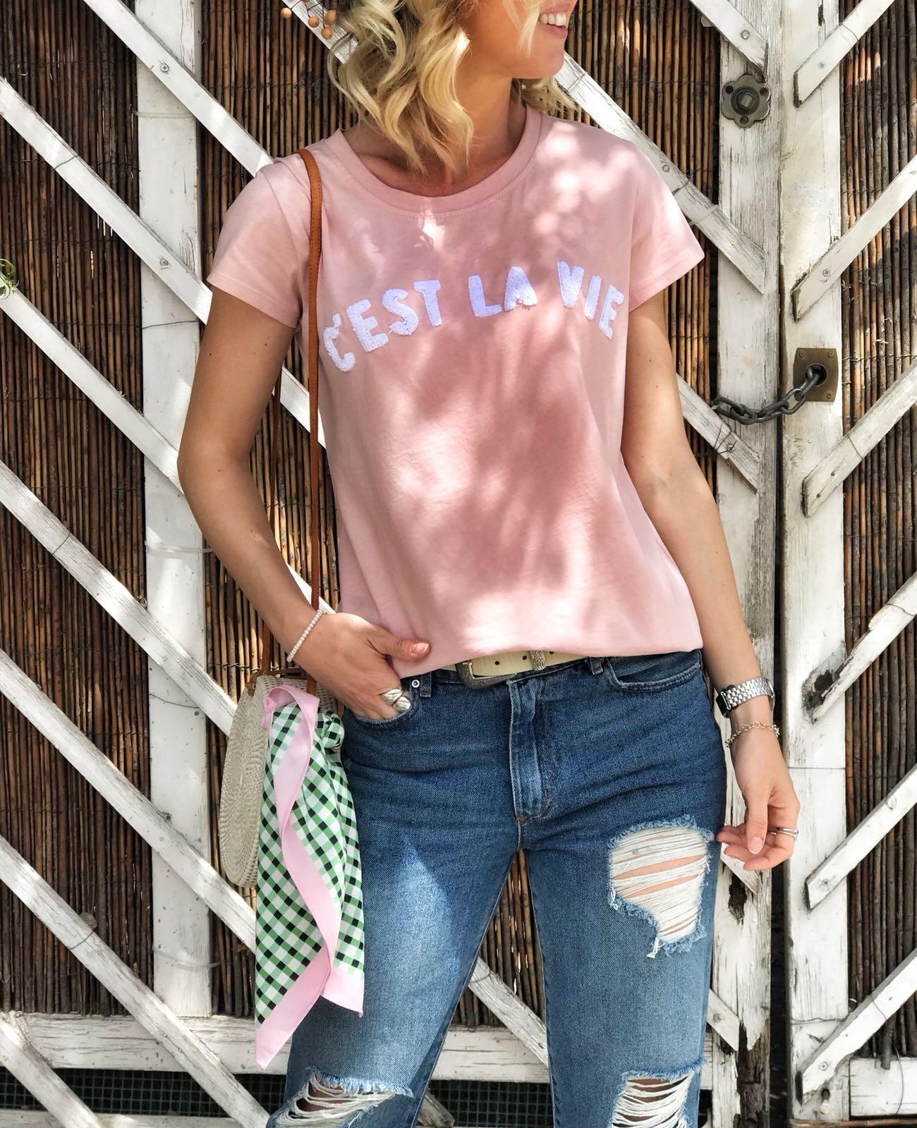 Camiseta básica con detalle letras bordadas en tono rosado. Una básica súper cómoda que podrás llevar a diario