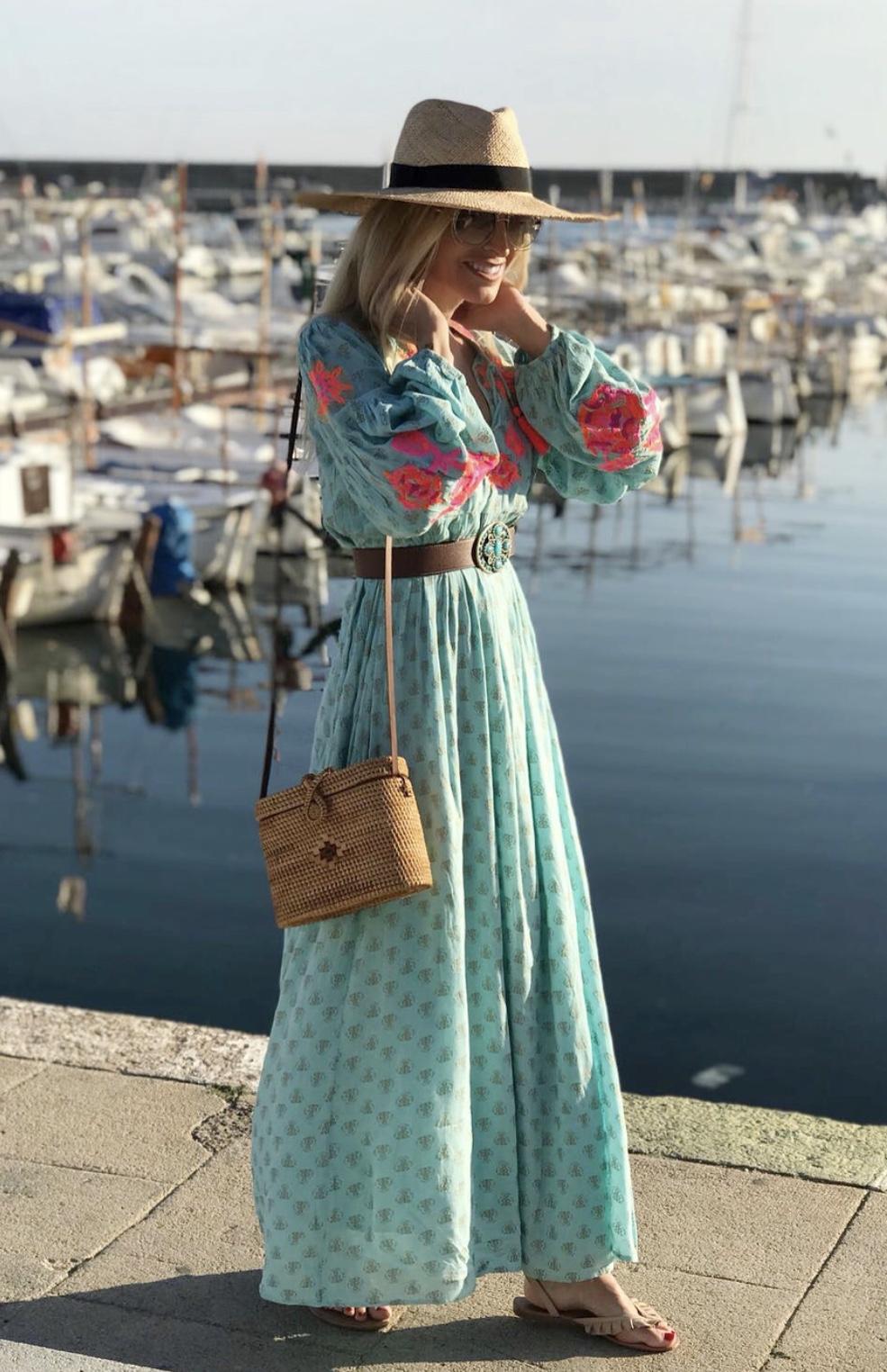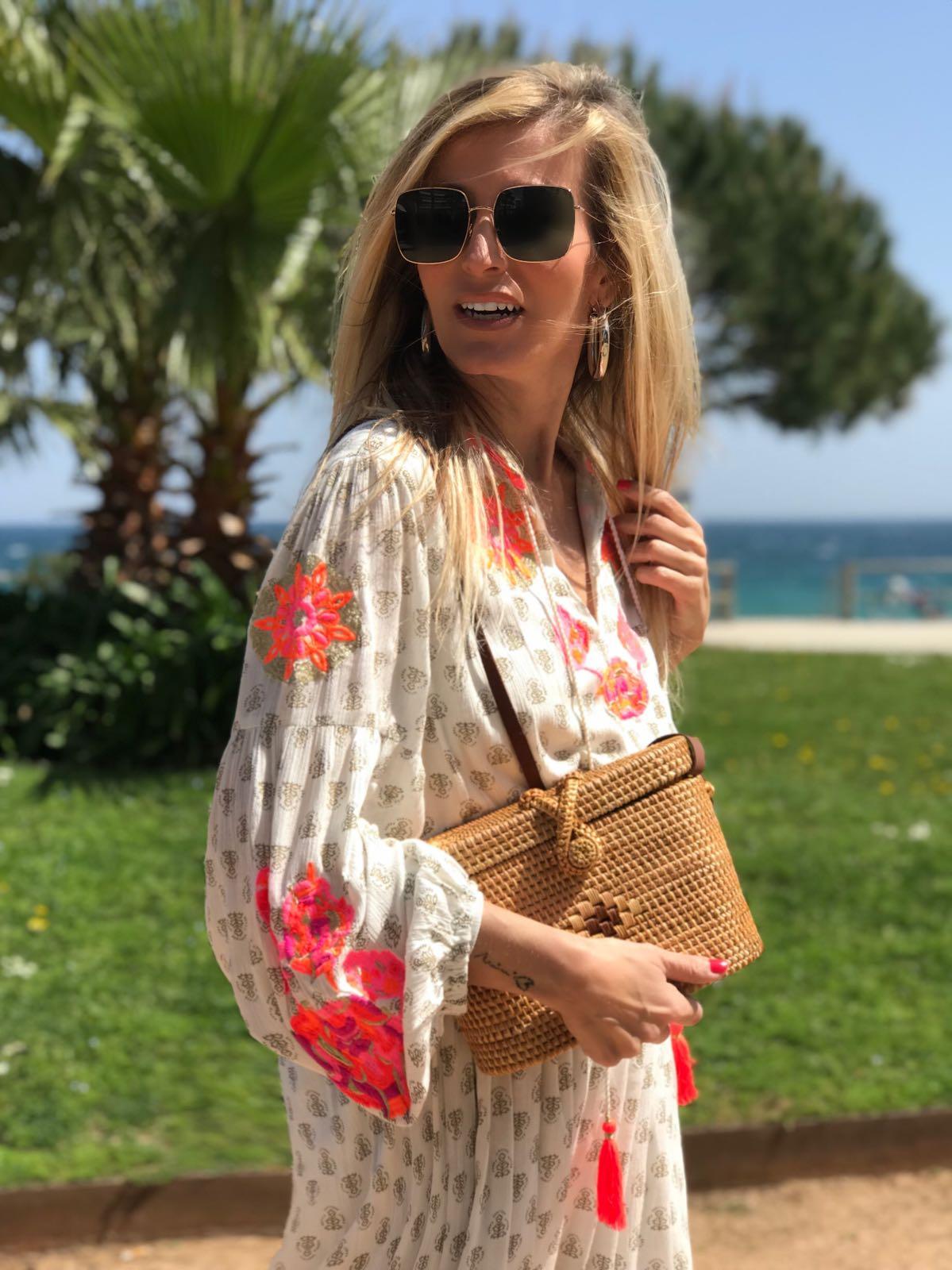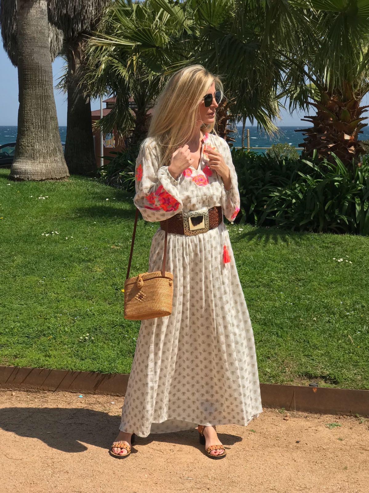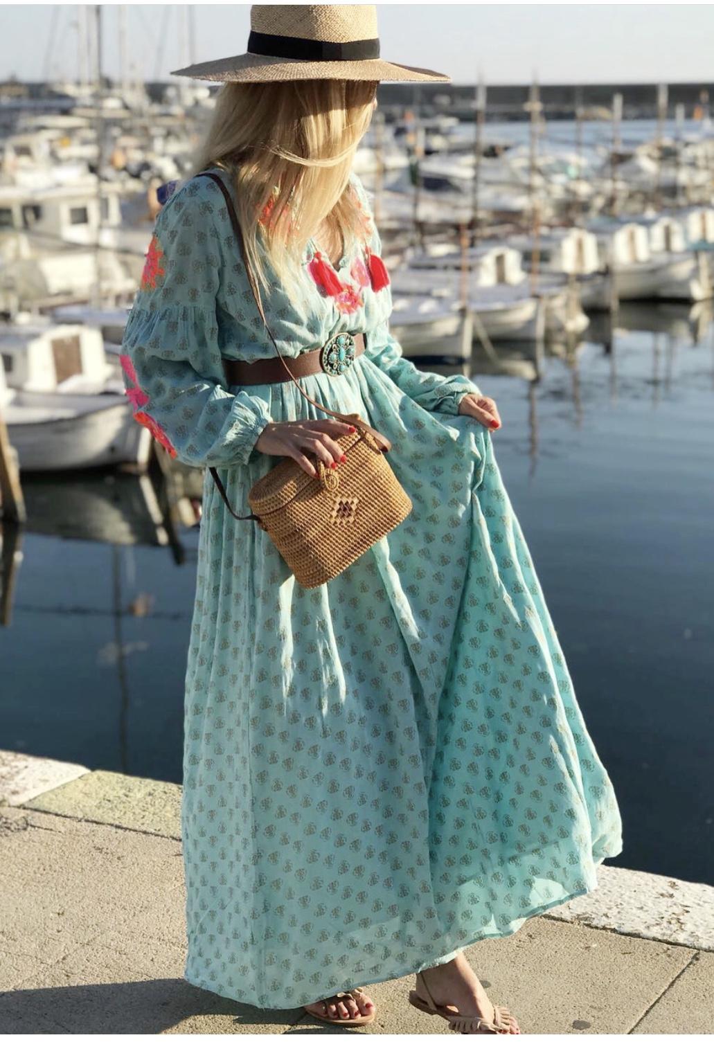 Vestido largo amplio estampado de flores, cuello abierto en pico y detalle de cordón acabado con borlas. Un vestido lleno de preciosos detalles con un tejido maravilloso.