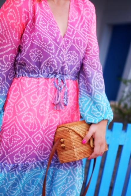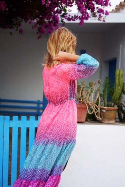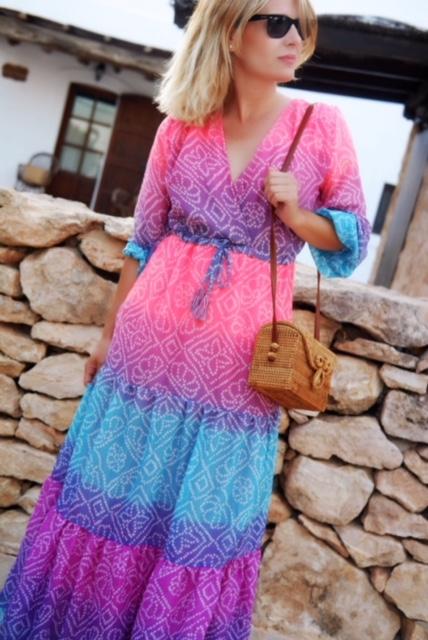 Vestido largo de estilo boho, estampado de colores. Manga larga, escote cruzado y cintura con crdón para anudar. Simplemente maravilloso!