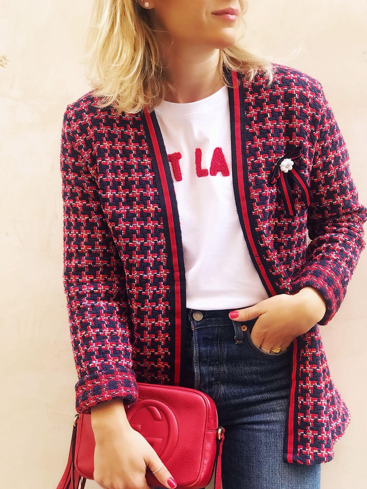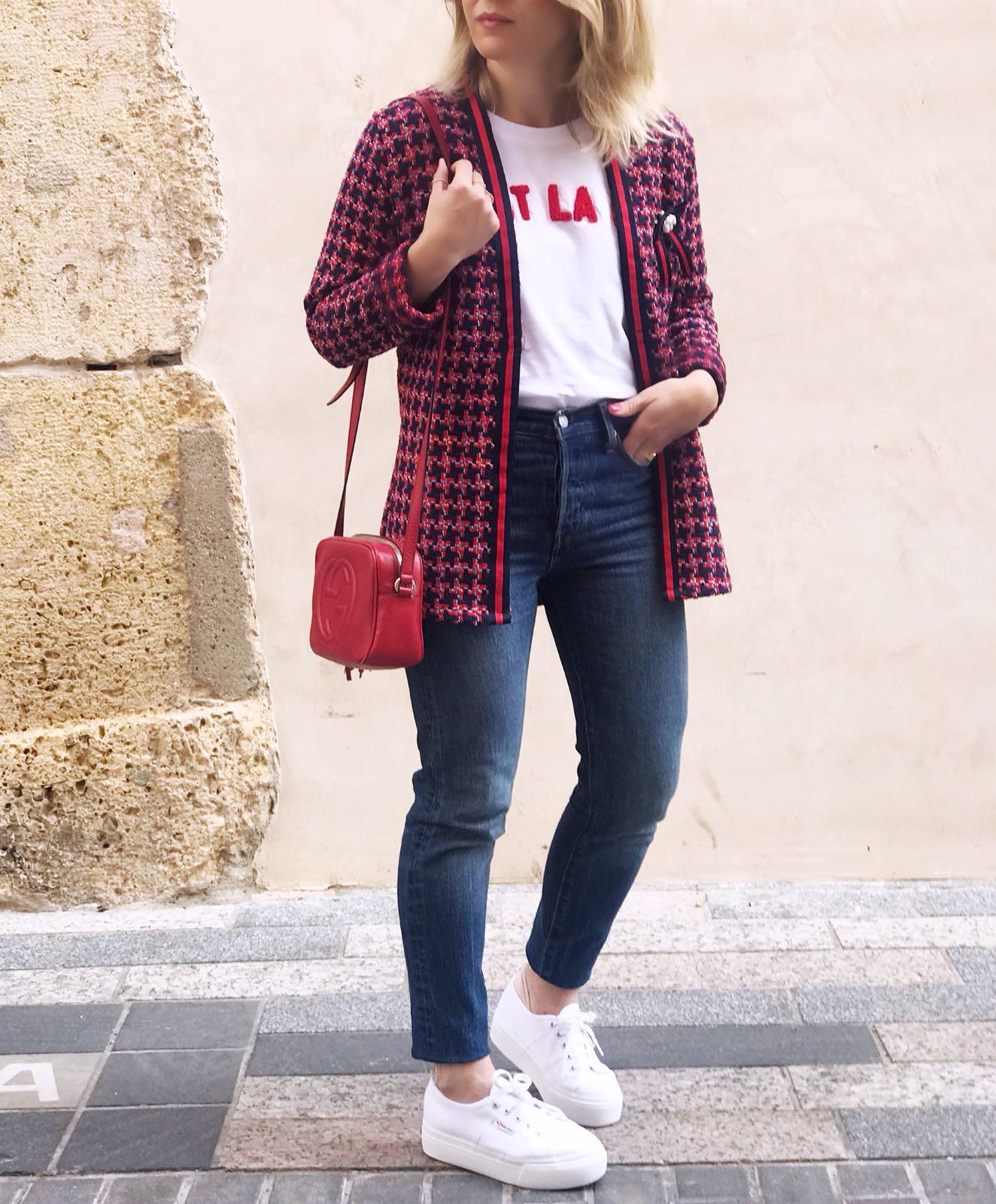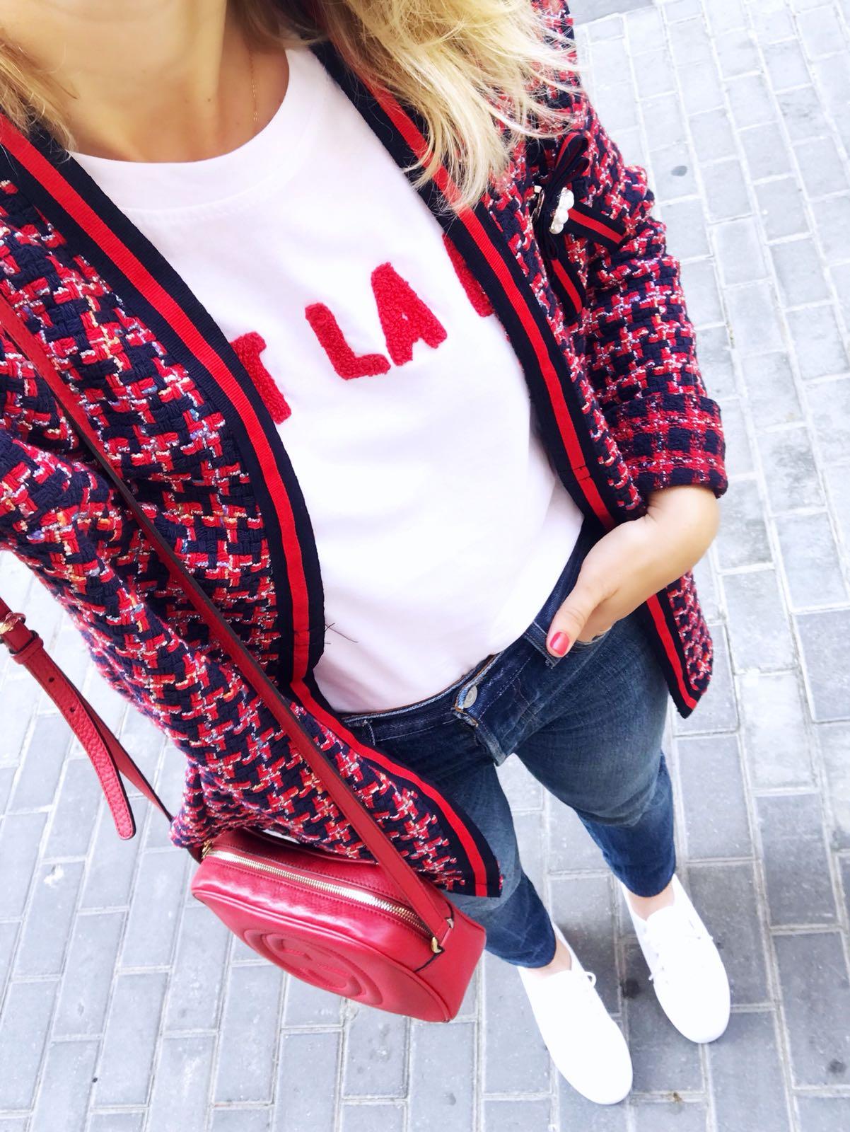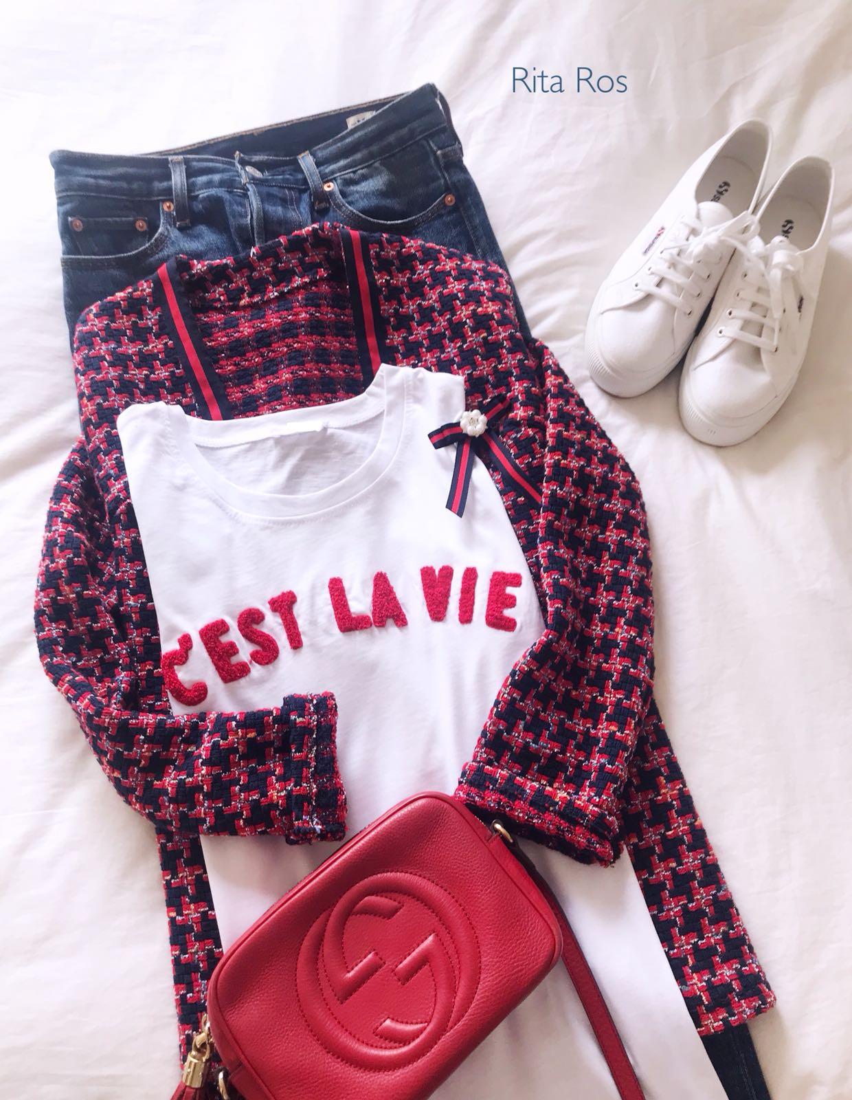 La hemos combinado con unos jeans y nuestra camiseta C’est la Vie con letras en color rojo y la combinación nos encanta.