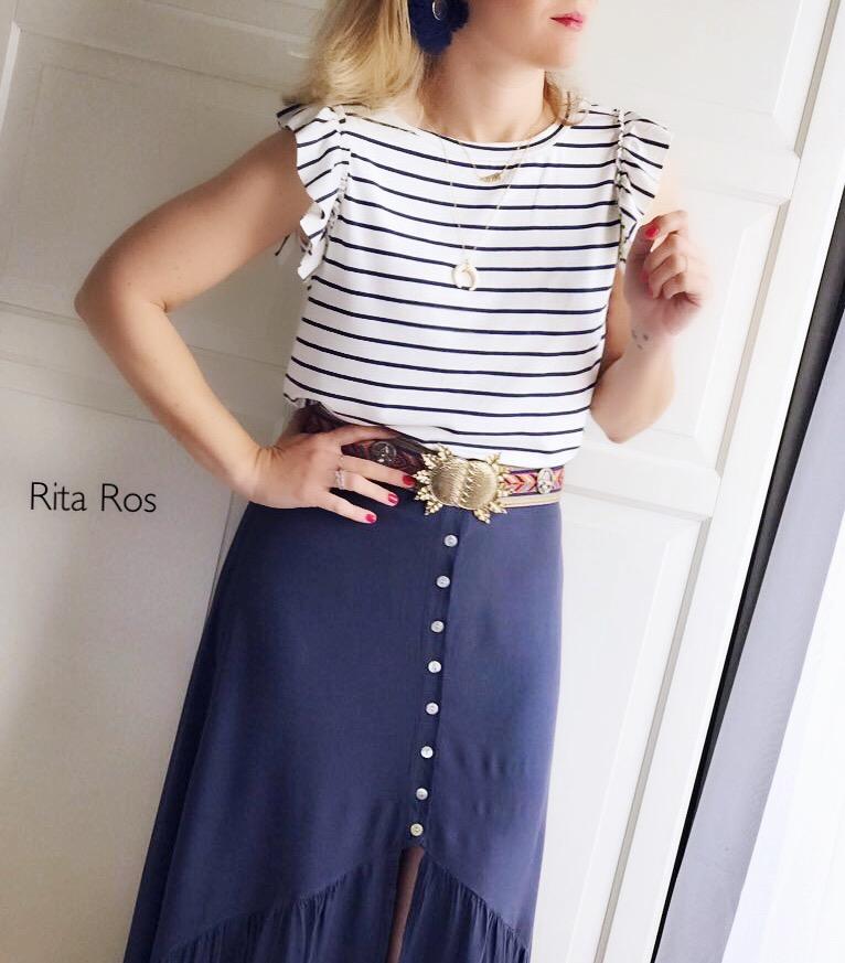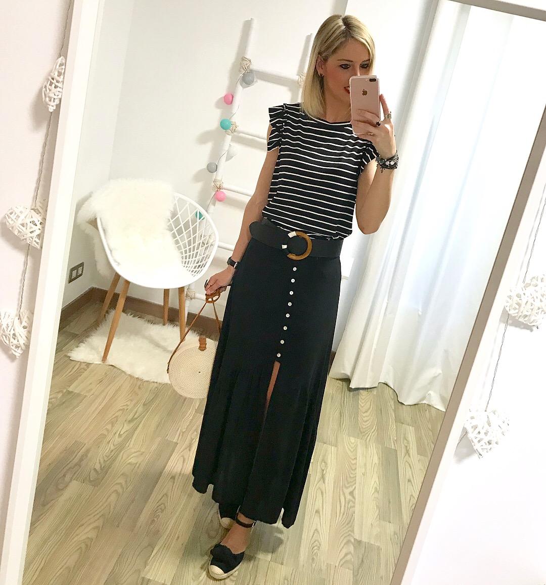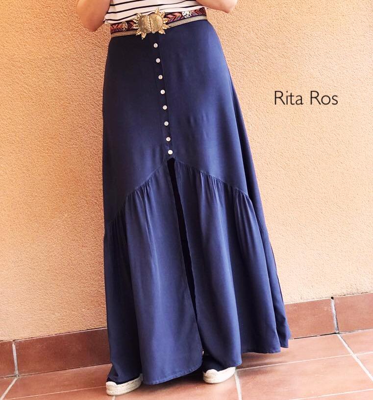 Falda larga cerrada con botones y abierta hasta abajo con detalle volante. La hemos combinado con nuestra camiseta Navy y la combinación es perfecta.