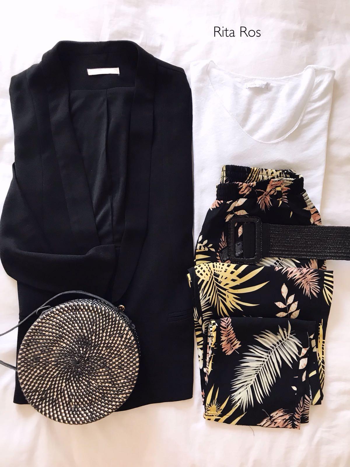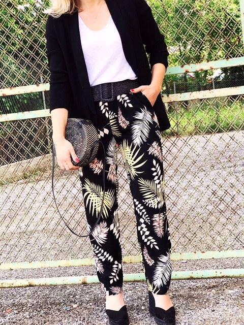 Pantalón largo ancho estampado sobre fondo negro.