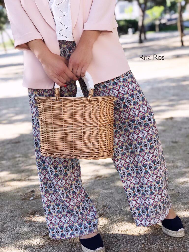 Pantalón largo ancho estampado con una caída preciosa. Lo hemos combinado con nuestra americana Allie rosa suave y nuestro top de tirantes troquelado y queda genial.