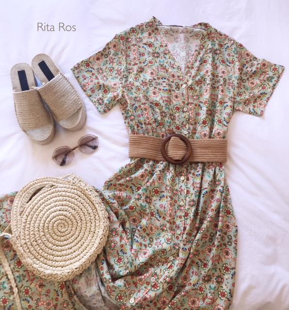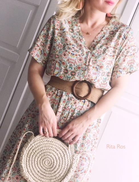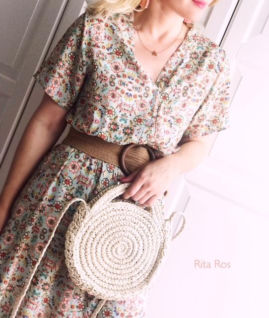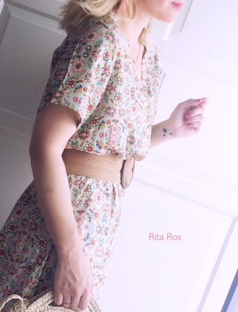Vestido largo de manga corta y cuello de pico, estampado de flores. El tejido tiene una caída preciosa.