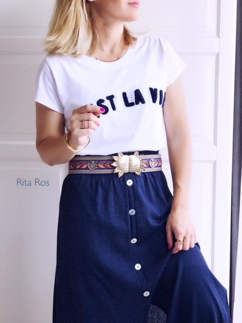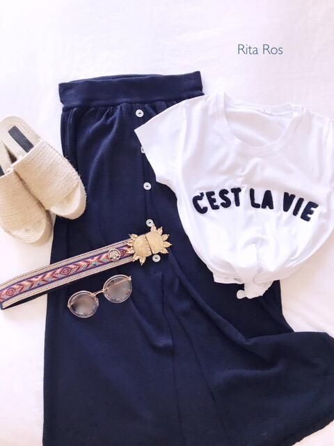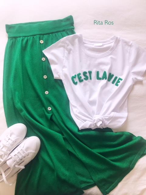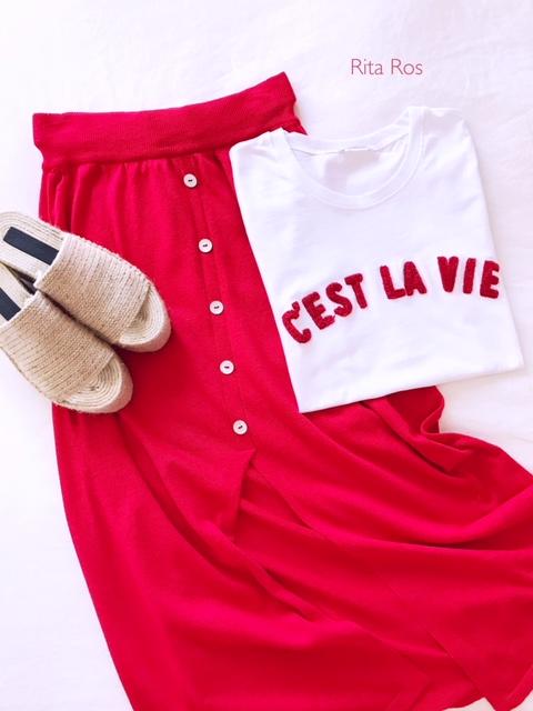 Falda larga de punto abotonada por delante y detalle apertura en frontal y laterales. La hemos combinado con nuestra camiseta navy color camel y el look es ideal.