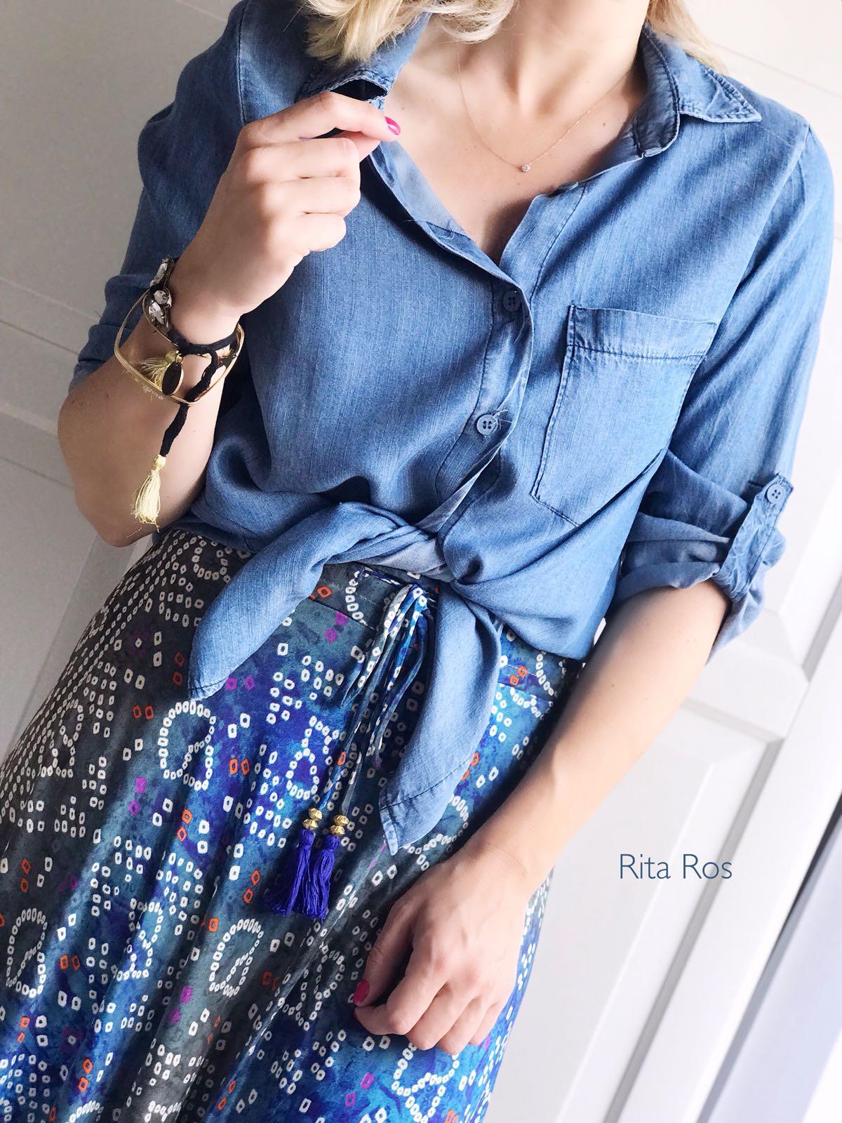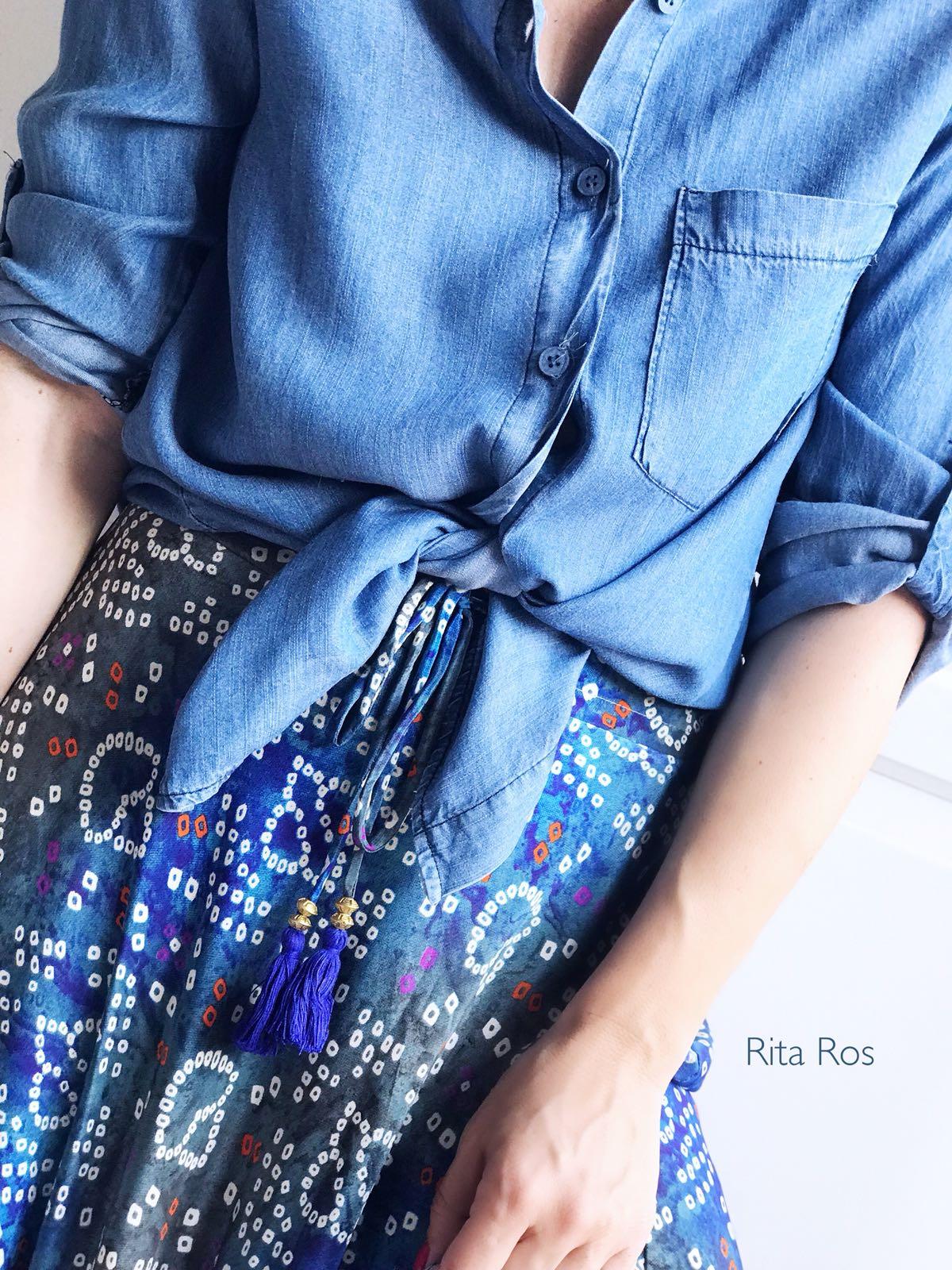 Camisa tejana manga larga, con una caída preciosa. La hemos combinado con nuestra falda Summer en tonos azules y la combinación es perfecta.
