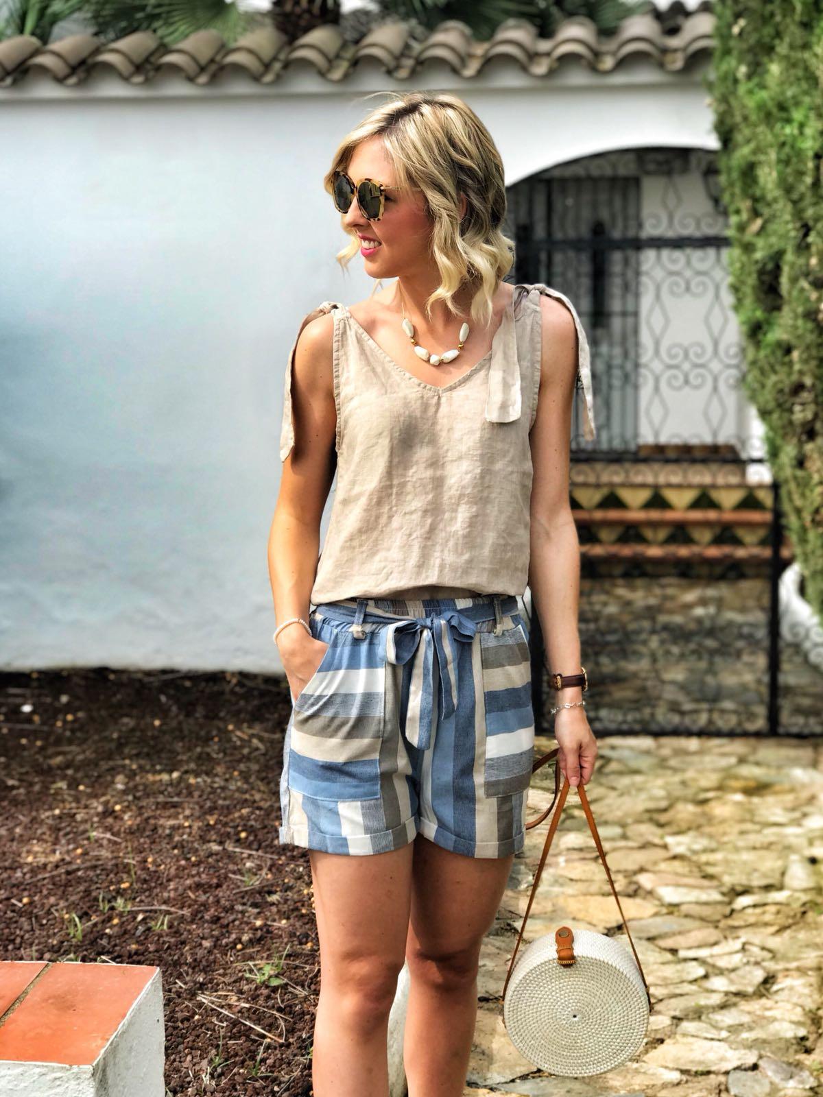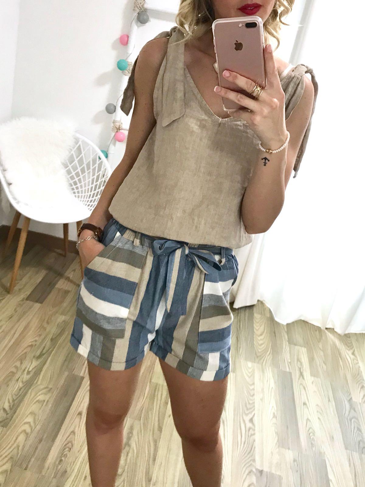 Top de lino con escote en pico y detalle lazo en hombros, combínalo con nuestro short de rayas de lino y la combinación es ideal.