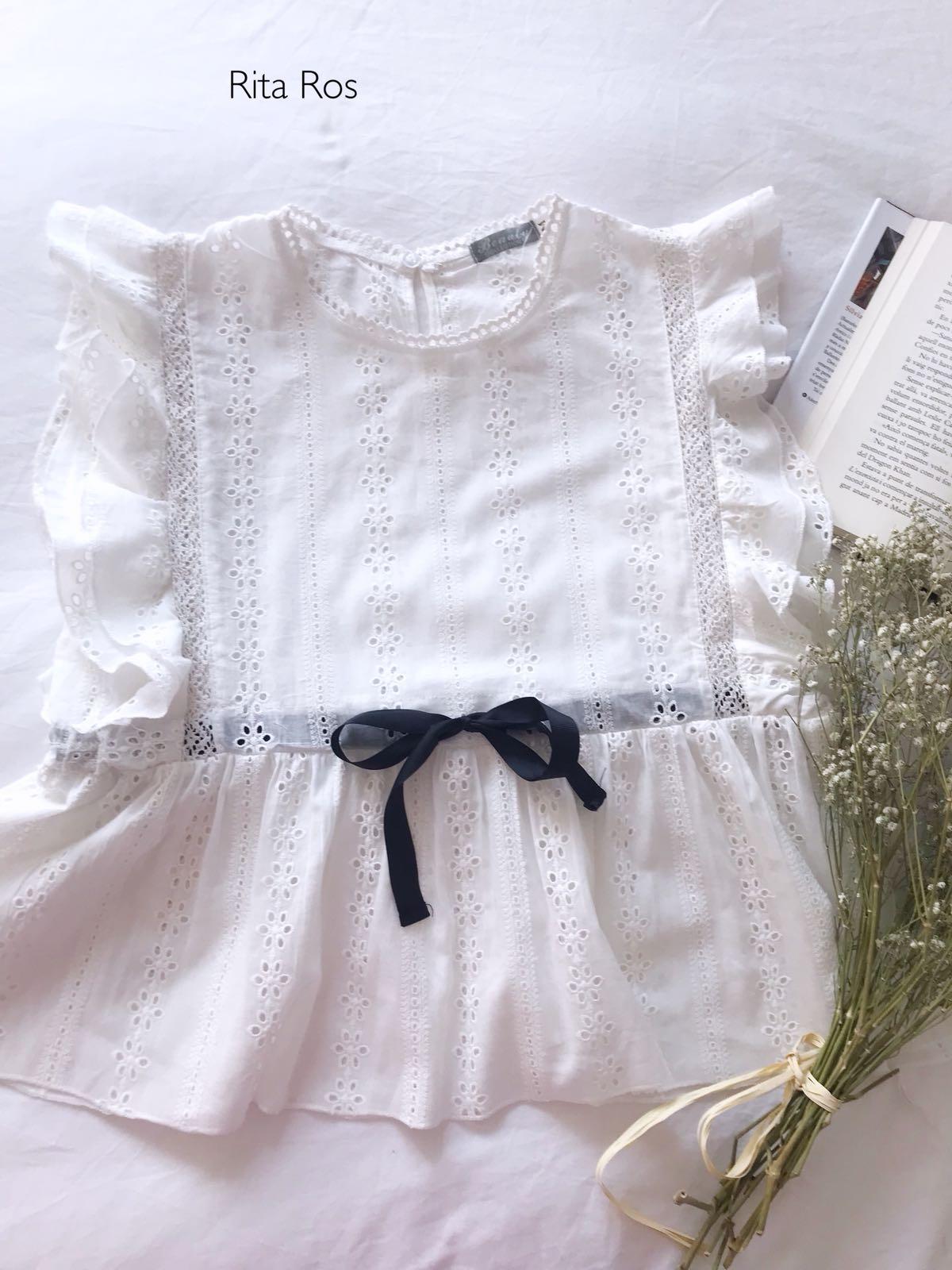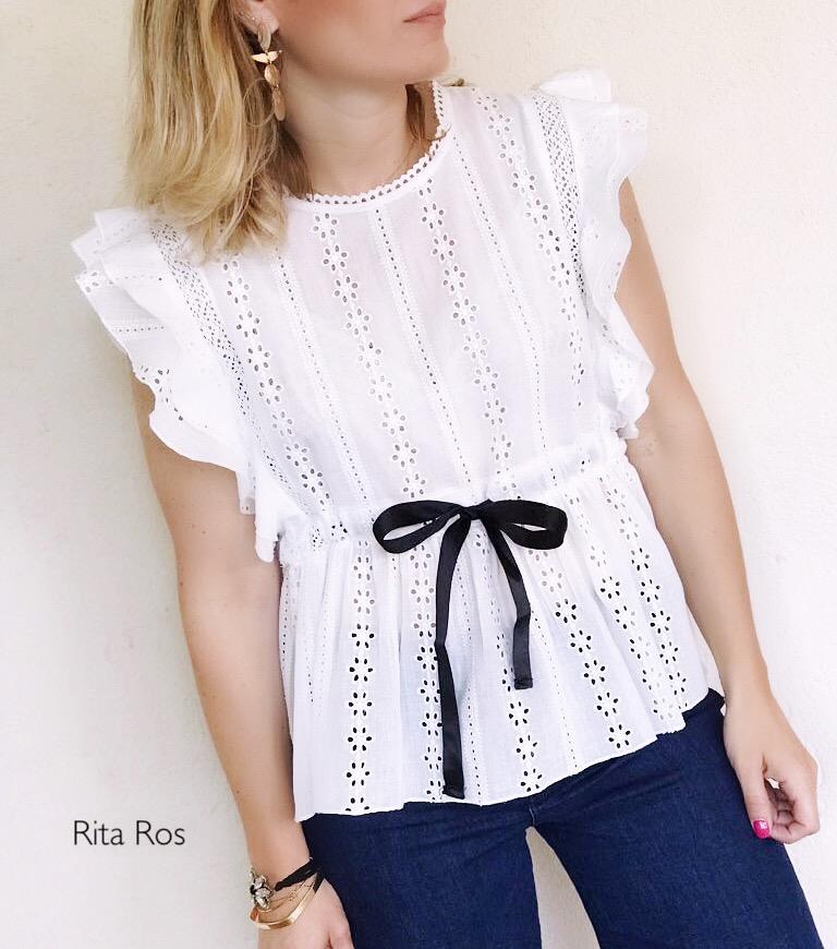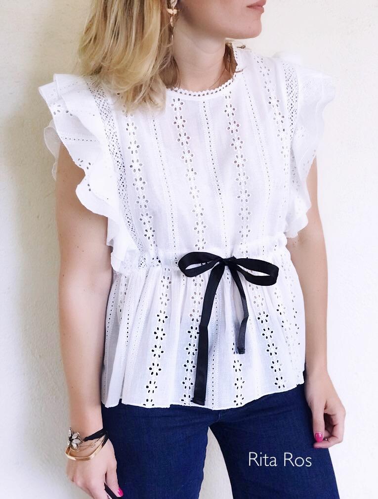 Preciosa blusa troquelada con volantes en hombros y detalle lazo en cintura. Una blusa muy femenina con mucho encanto.