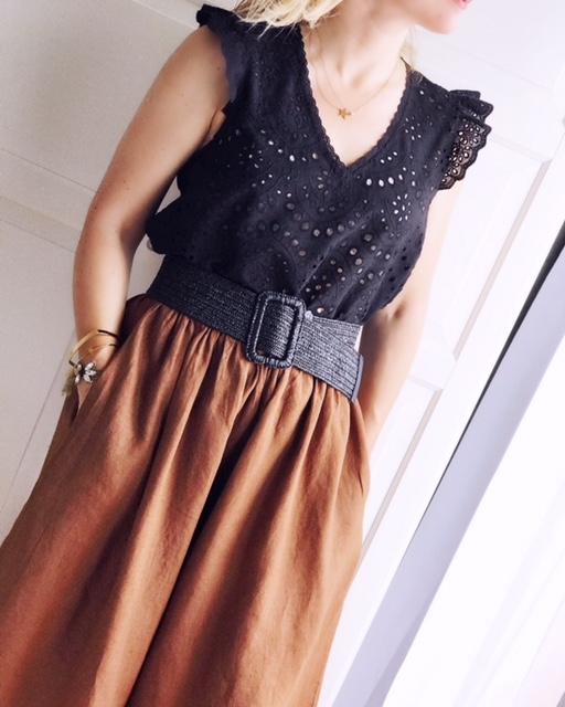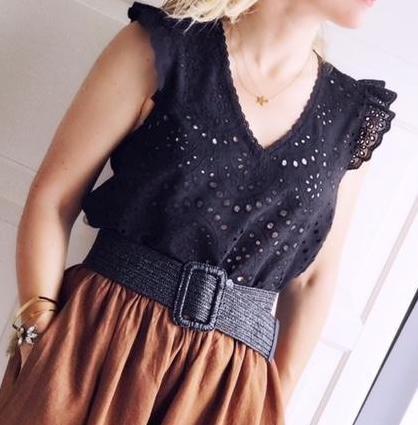 Blusa troquelada de escote pico y detalle volante en hombros. La hemos combinado con nuestro pantalón palazzo de lino color camel y nos encanta como queda la combinación.
