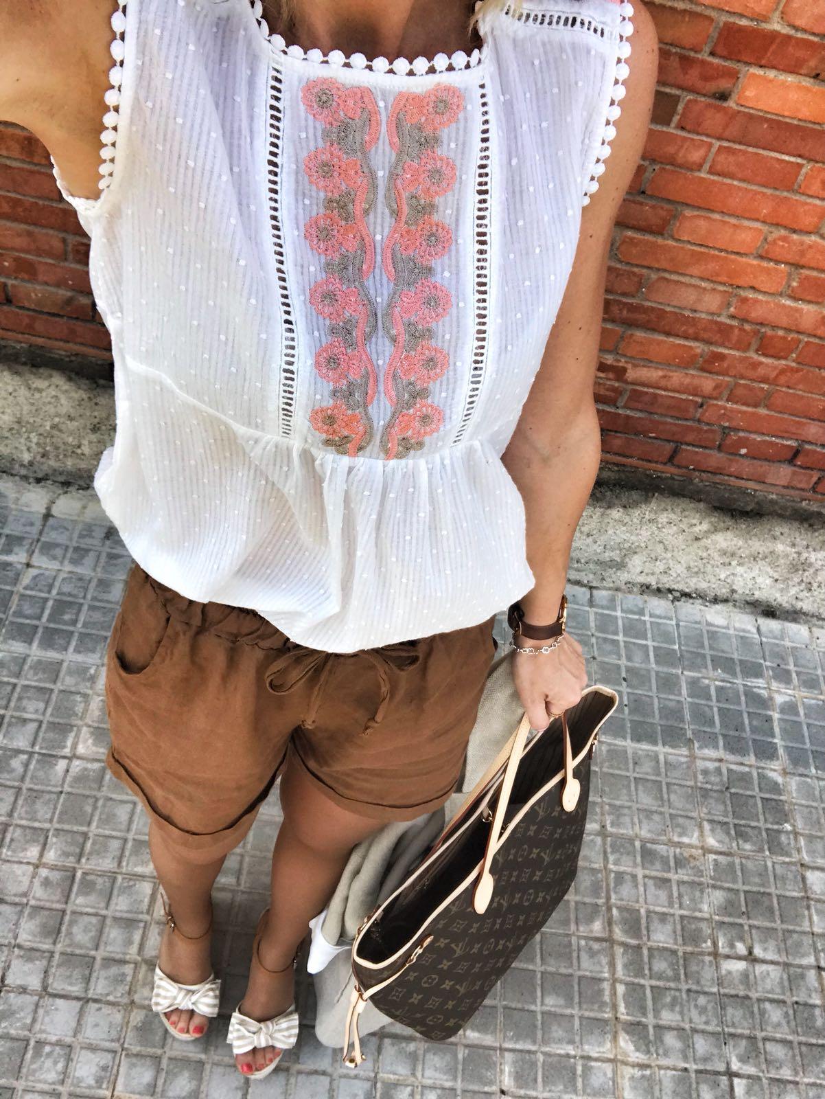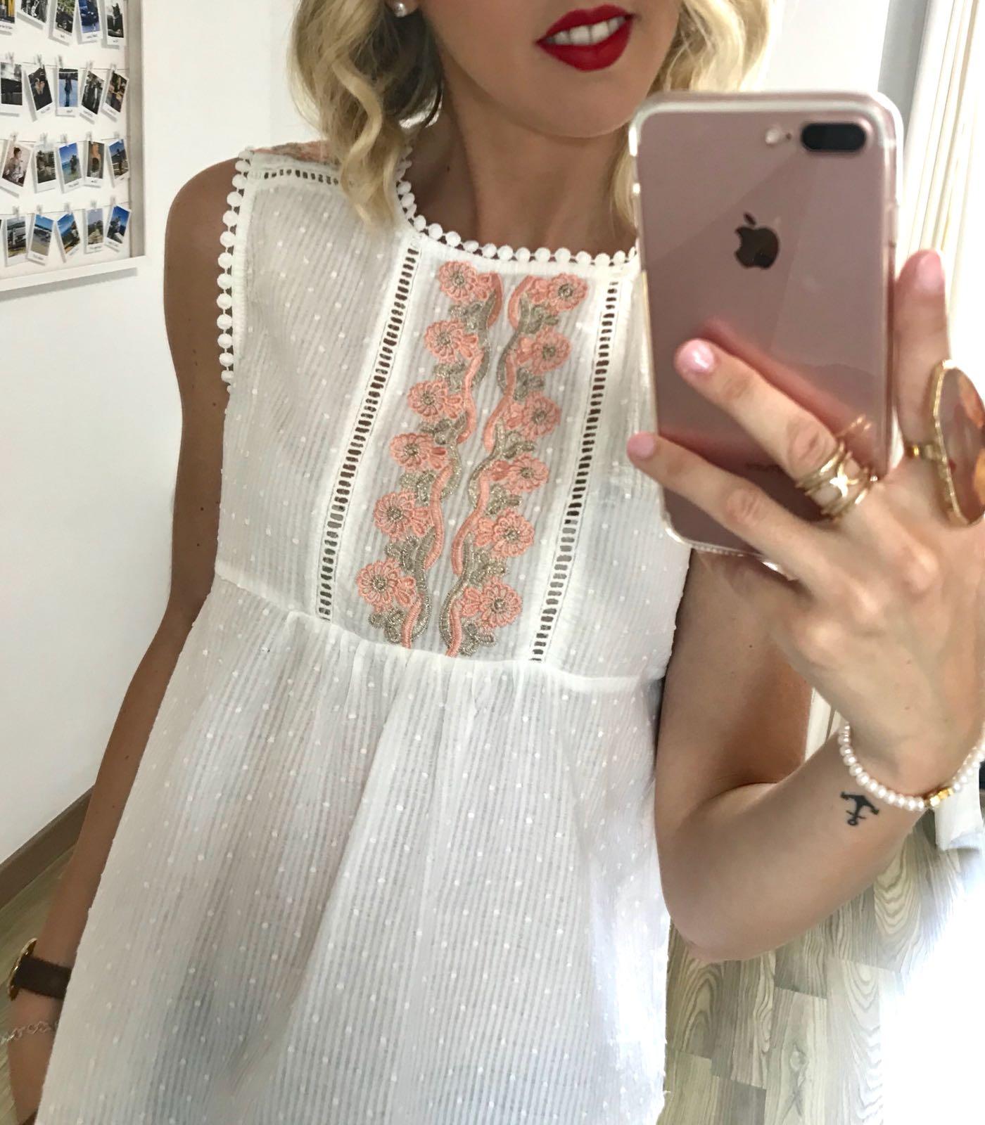 Preciosa blusa plumetti, sin mangas, cuello redondo y detalle de flores bordadas en hombros y frontal.