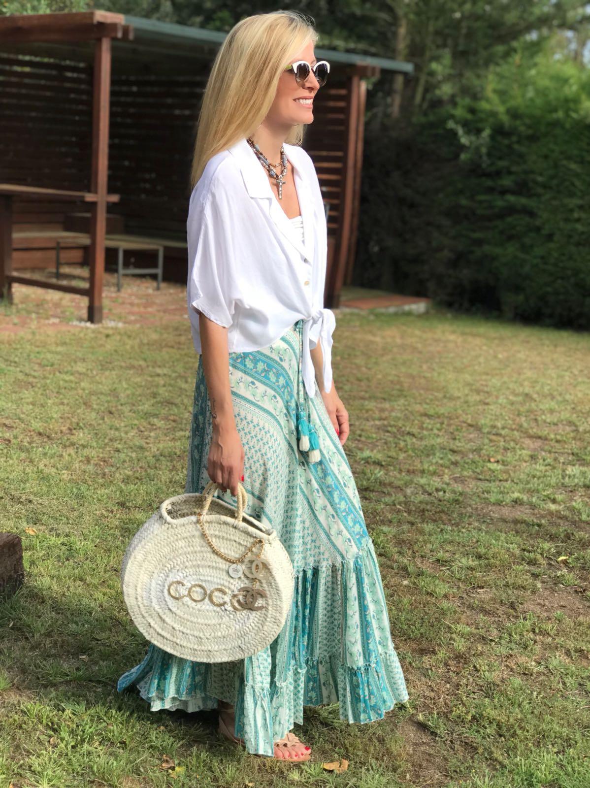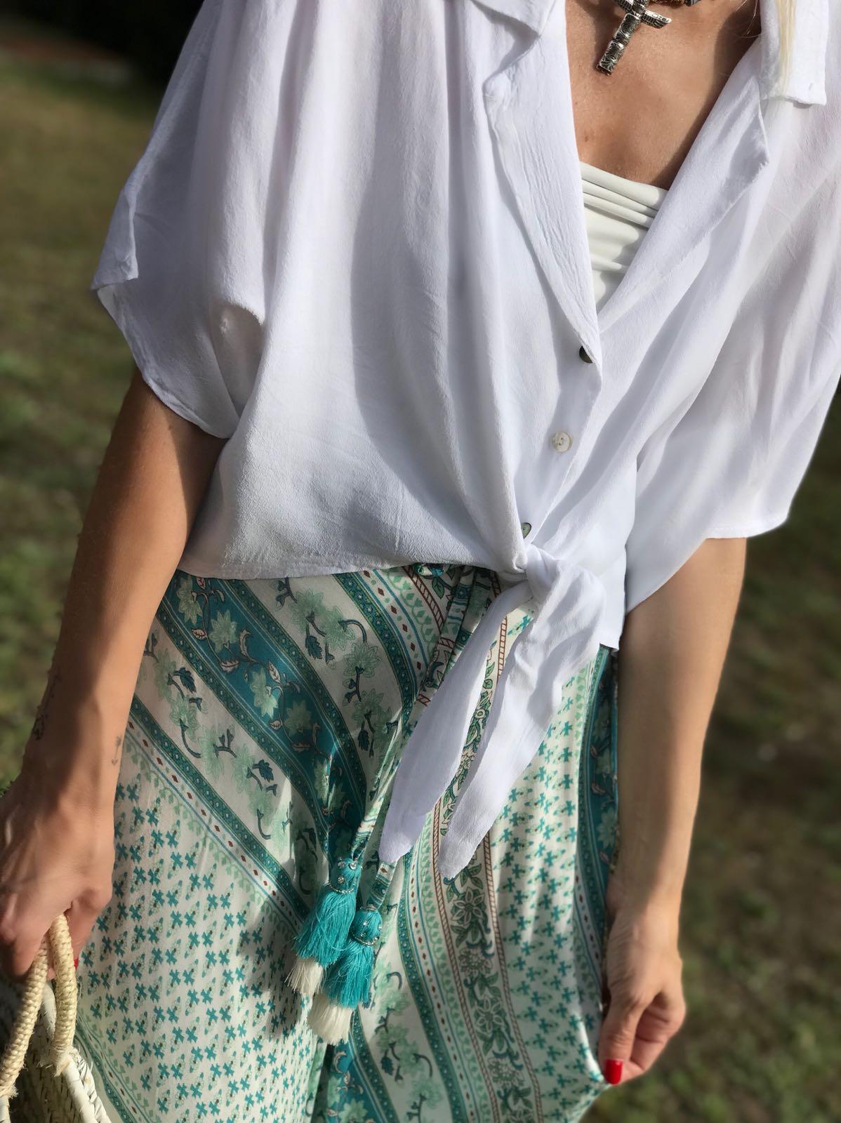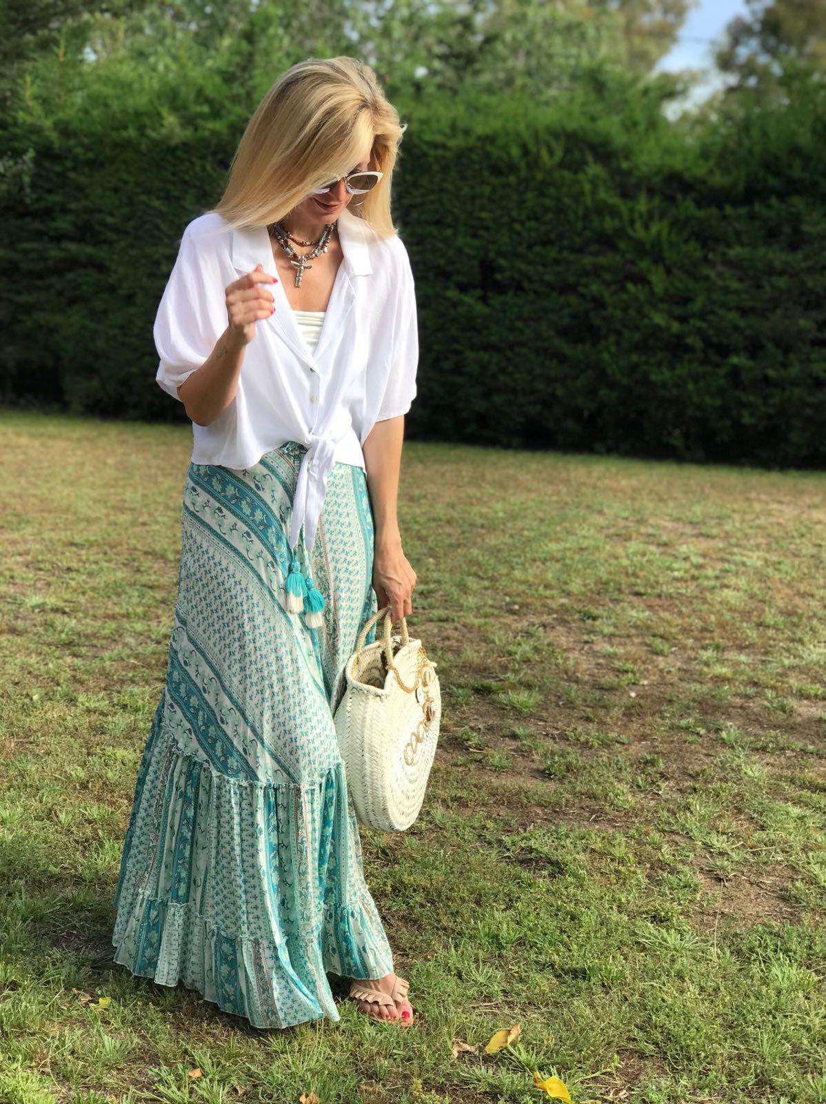 Falda larga de vuelo estampada con cintura elástica y cinta para anudar acabada en pompón. Los tonos verdes son preciosos.
