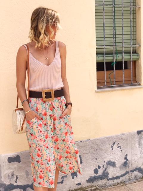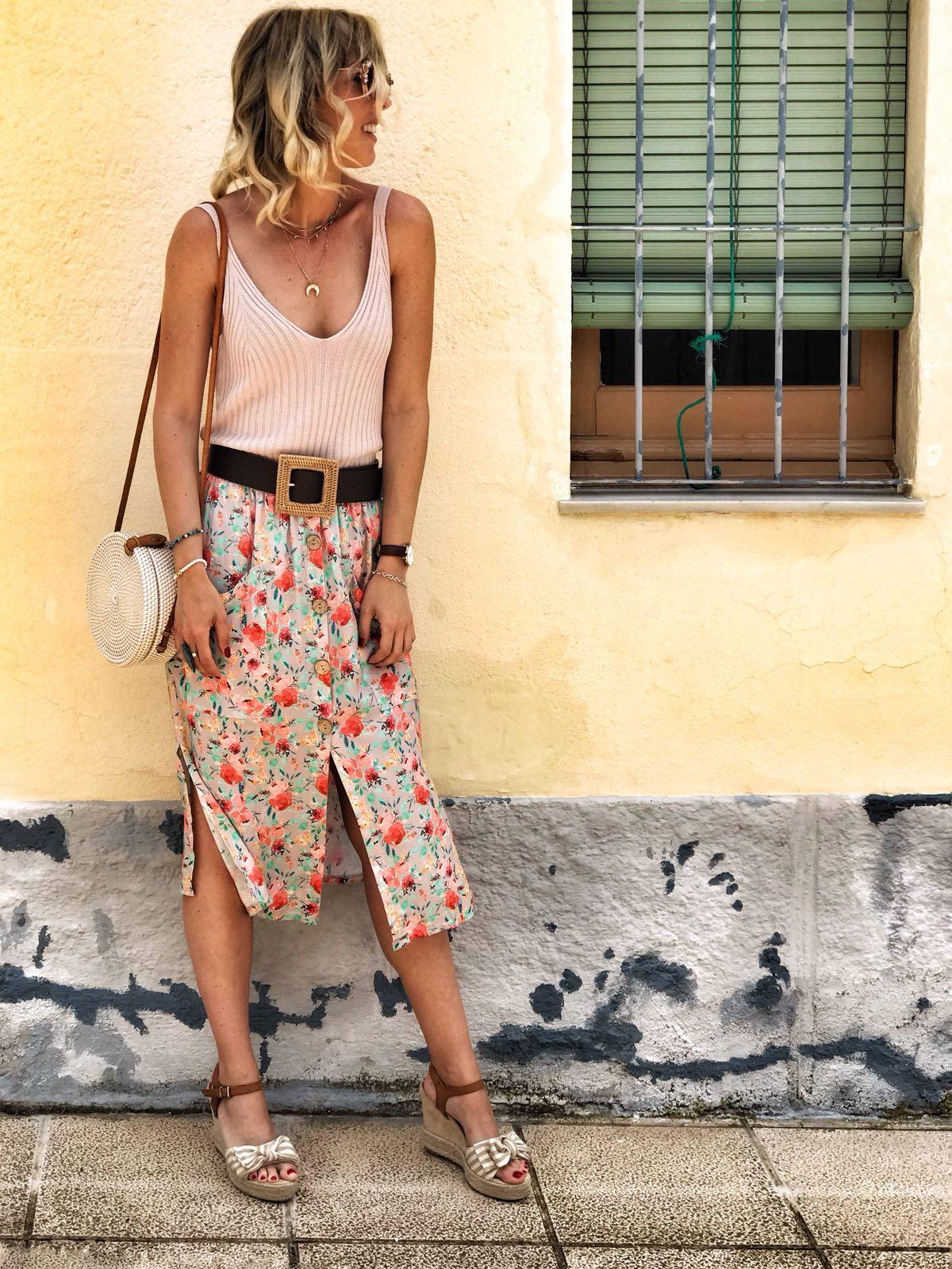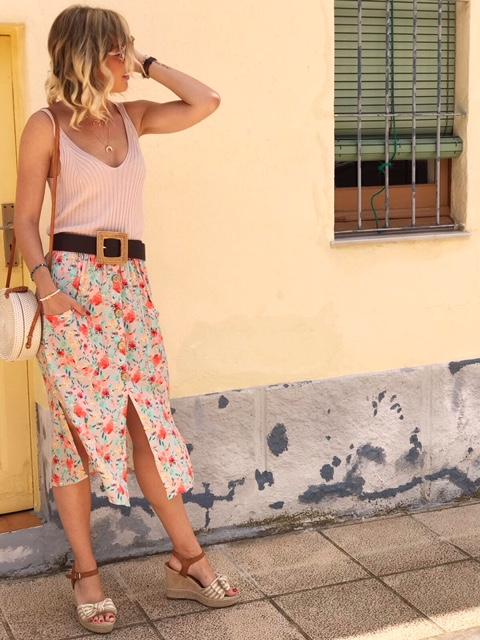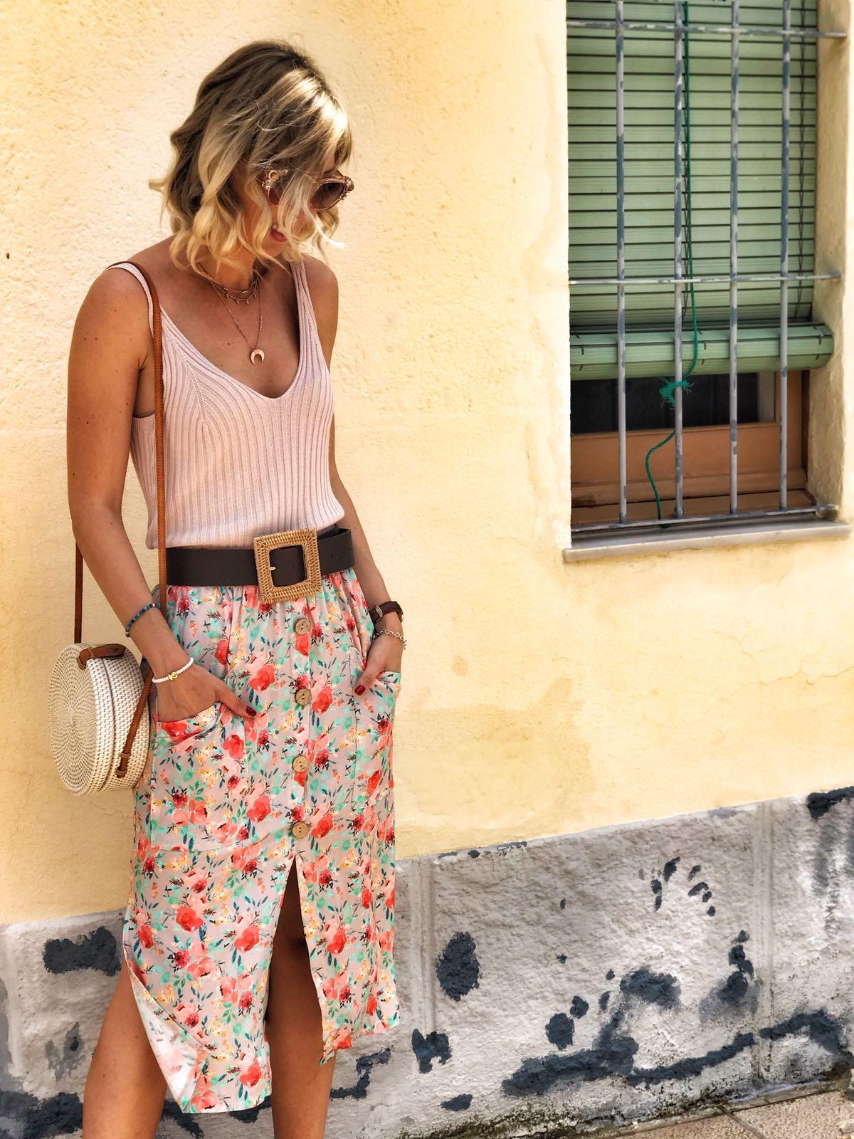 Falda de corte midi estampada de flores con bolsillos y botones de madera.