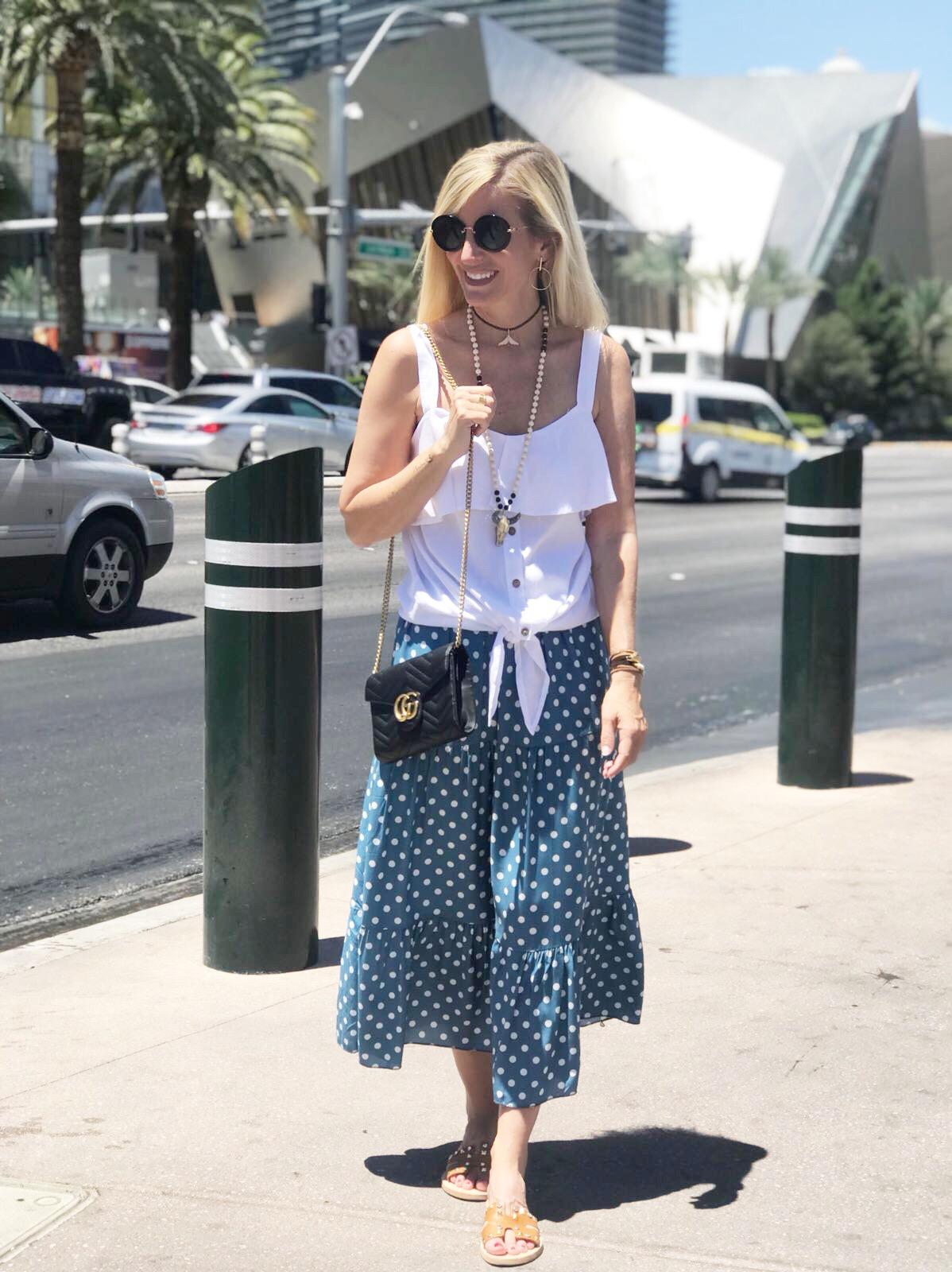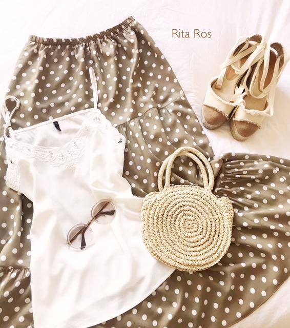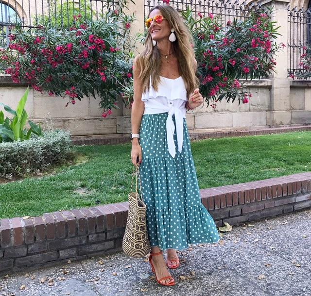 Falda larga estampada de lunares sobre fondo color turquesa. Detalle volante en el bajo. Una falda preciosa que hemos combinado con nuestro top volante con nudo y nos encanta.