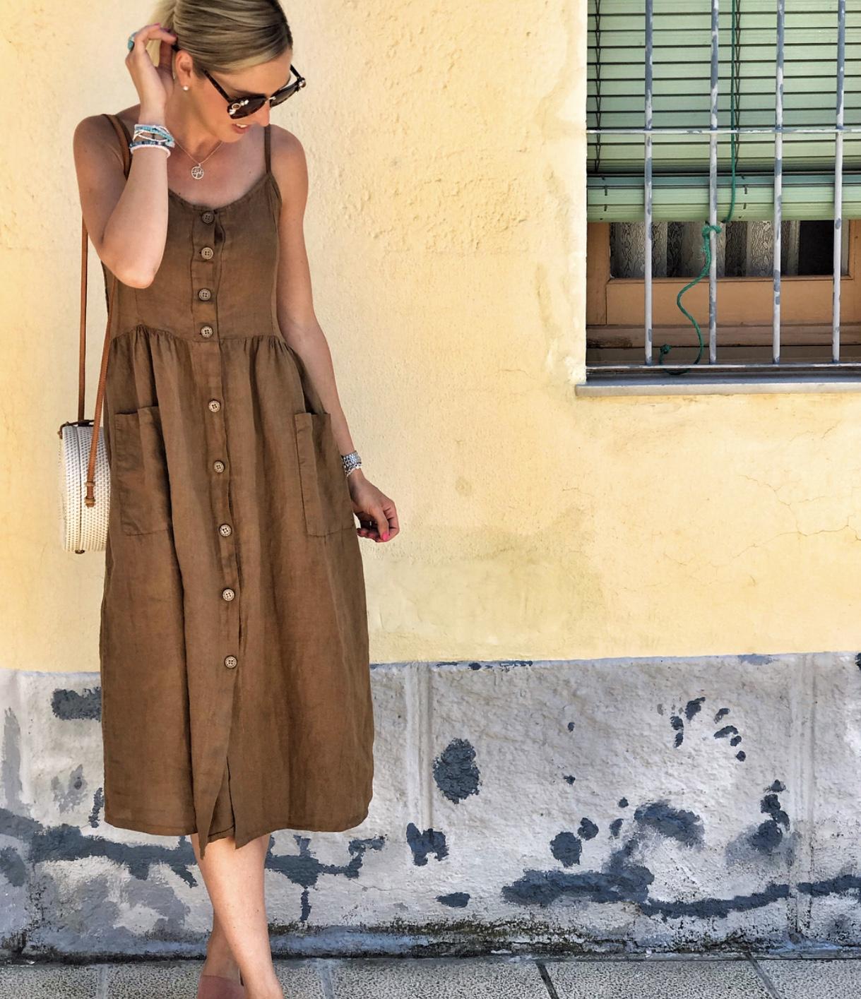 Vestido de lino de tirantes corte midi y detalle botones de madera. Un vestido precioso que estiliza un montón.