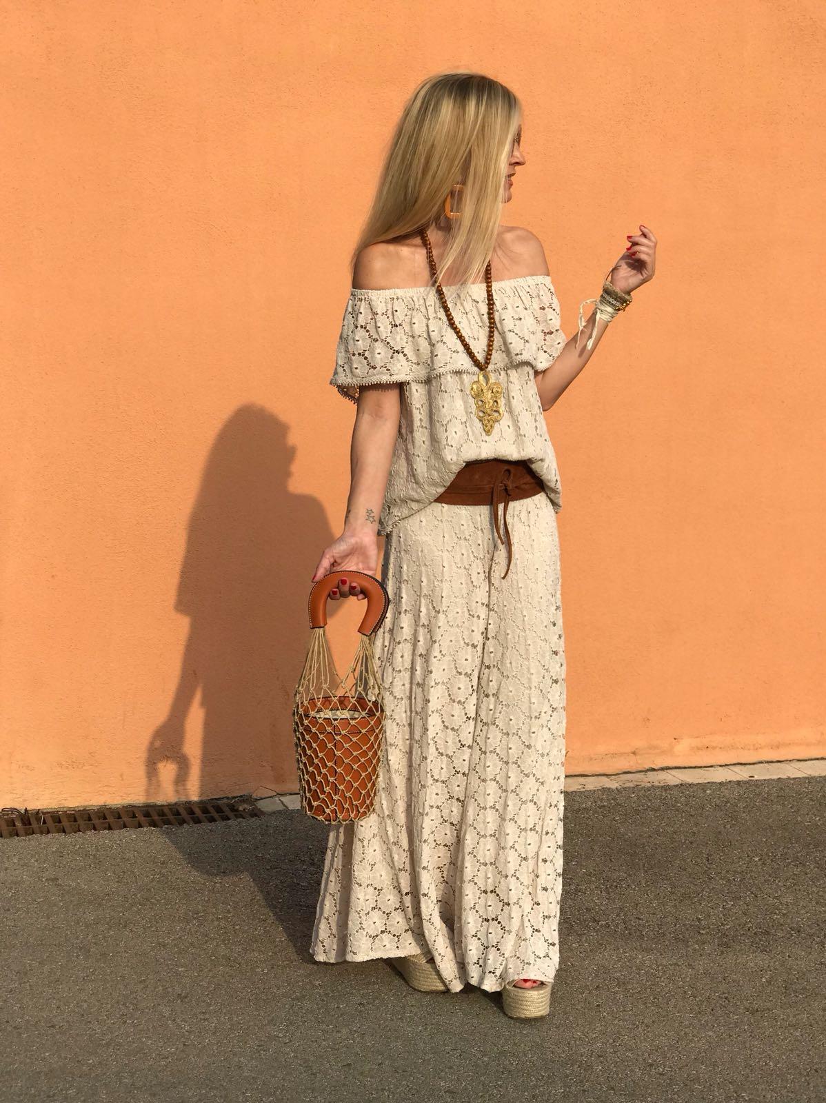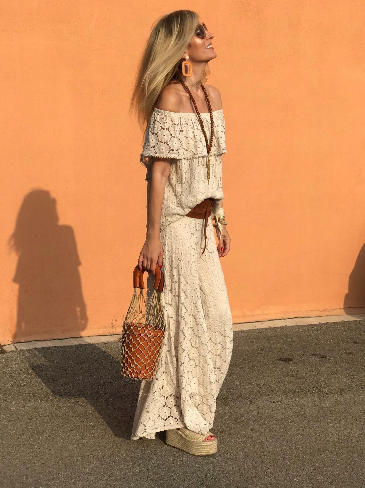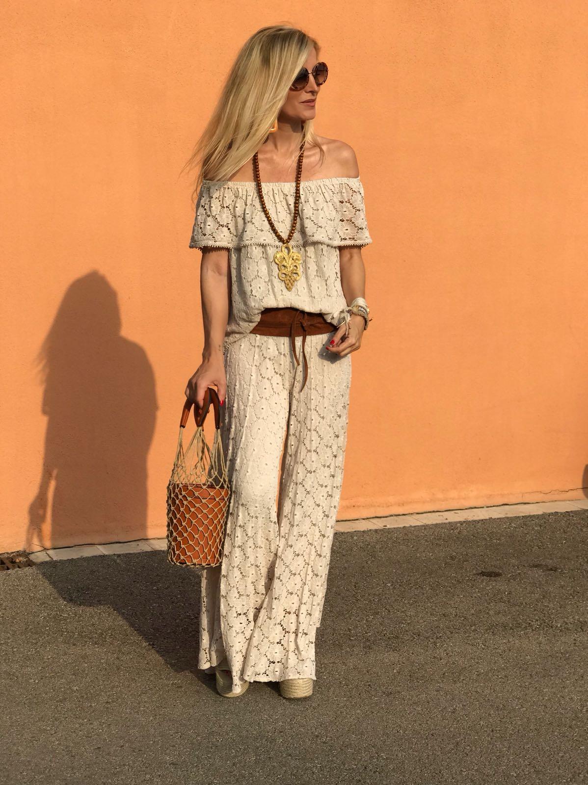 Top de encaje con hombros descubiertos súper favorecedor. Combínalo con el pantalón de conjunto y tendrás un look ideal.