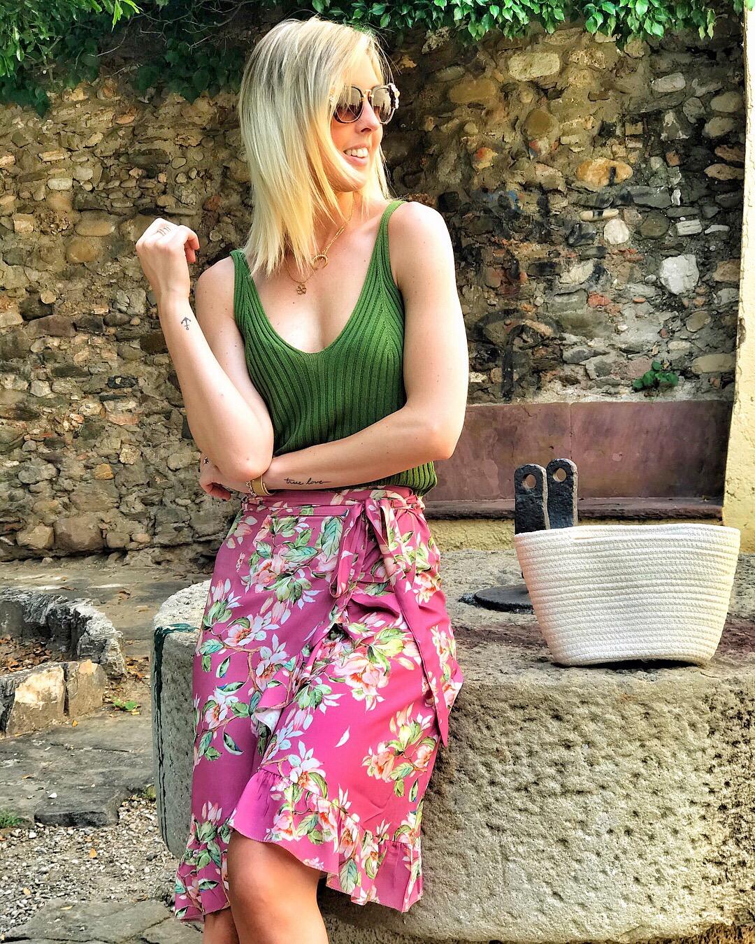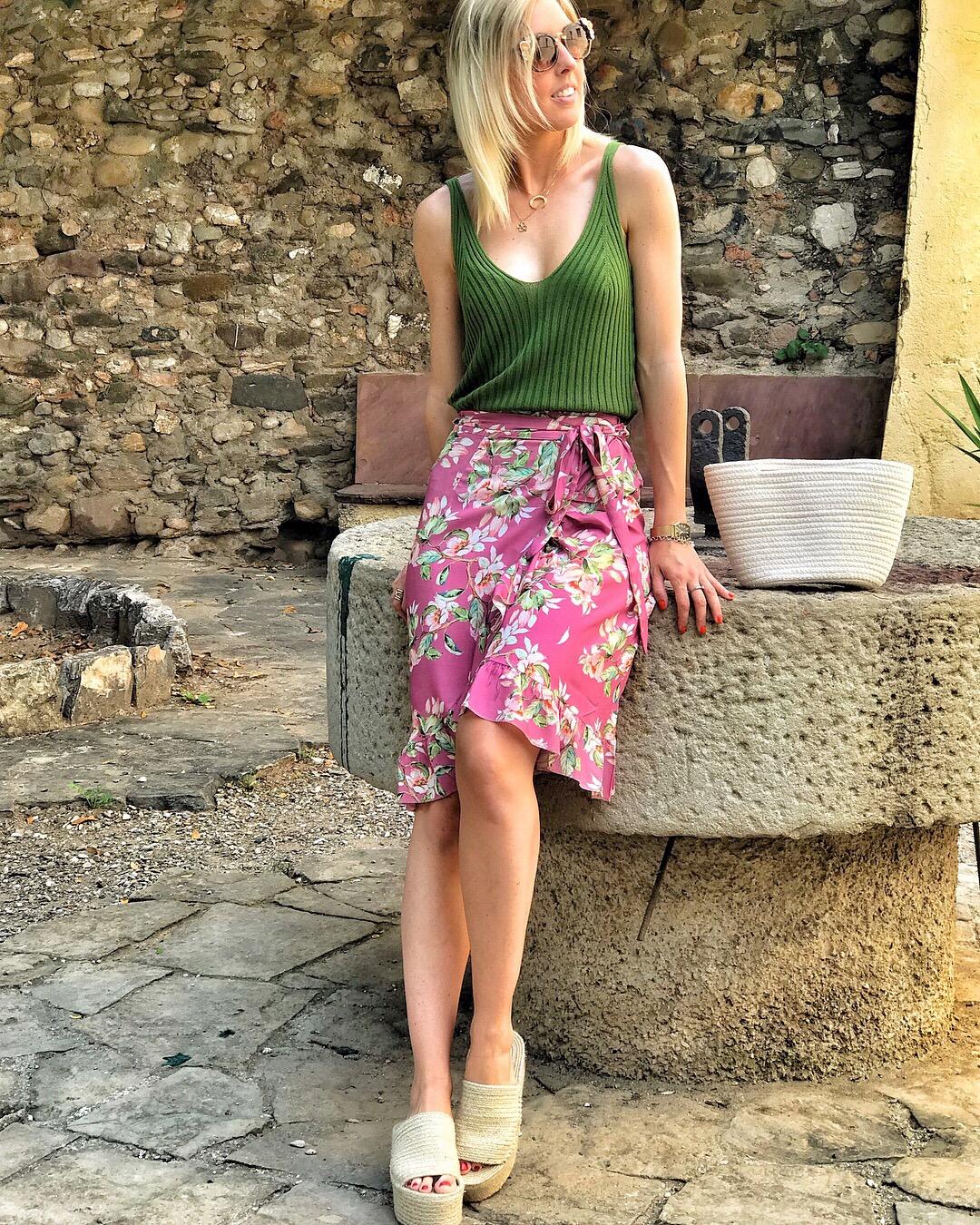 Falda fluida tipo pareo cruzado por delante estampada de flores.