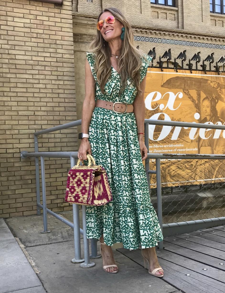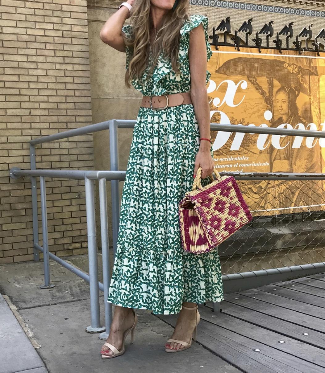 Vestido largo con un estampado precioso, escote en pico y detalle volante súper favorecedor. Bajo del vestido con volante.