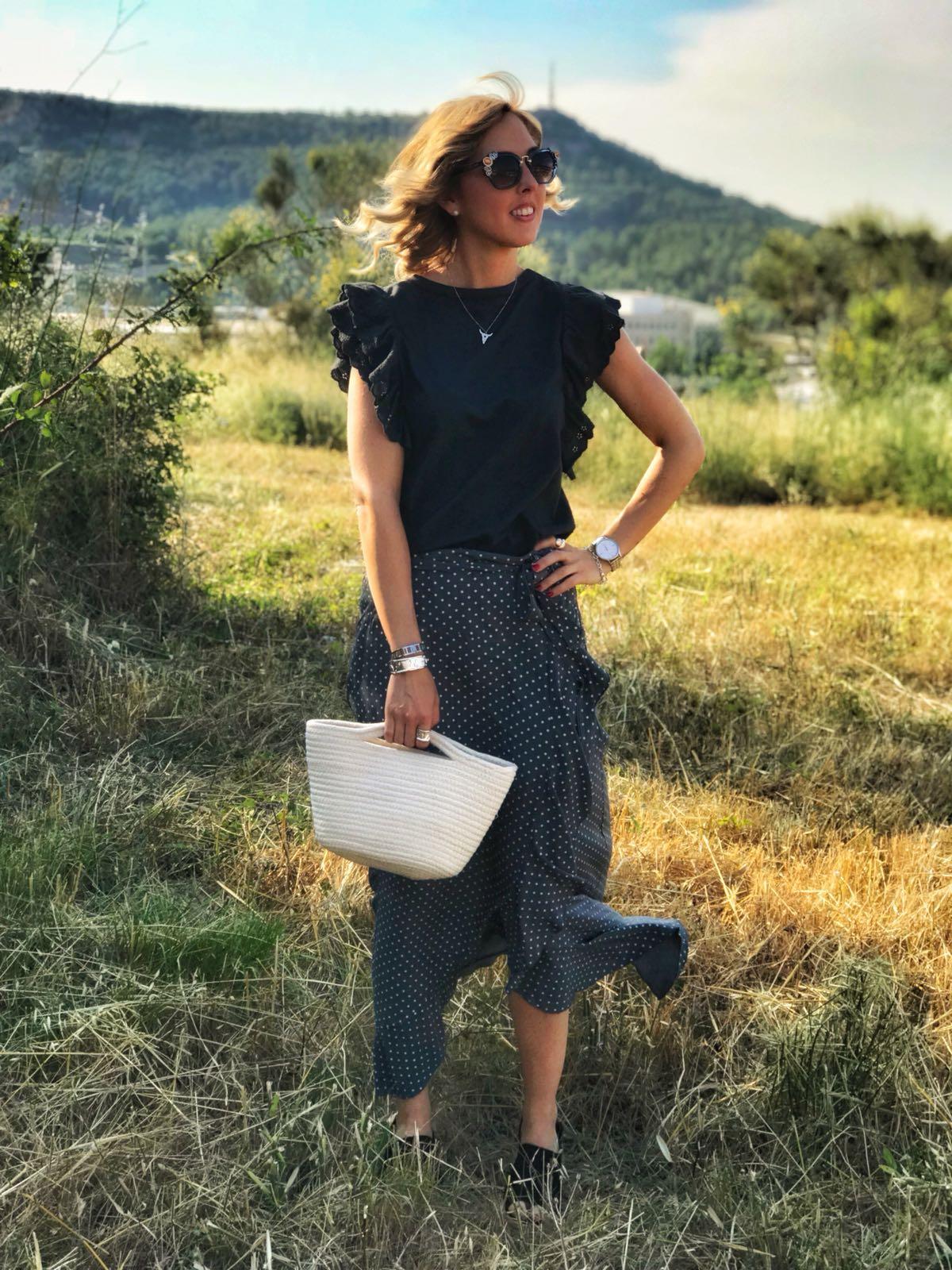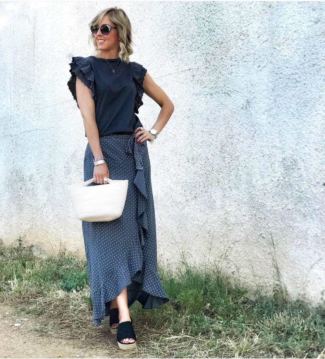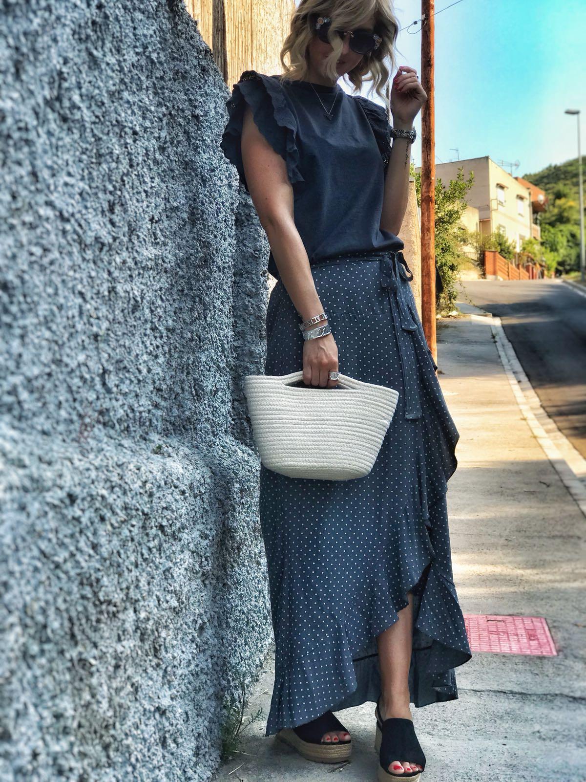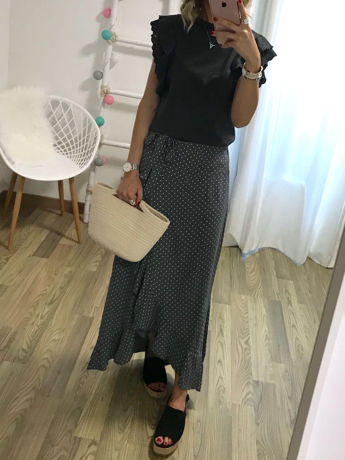 Falda larga cruzada con volante en el bajo estampada de mini lunares. Combínala con nuestra camista Astrid en color gris y quedará una composición ideal.