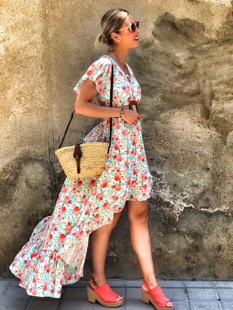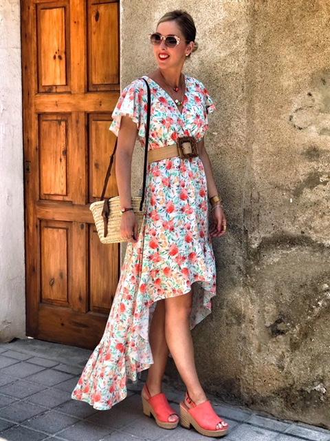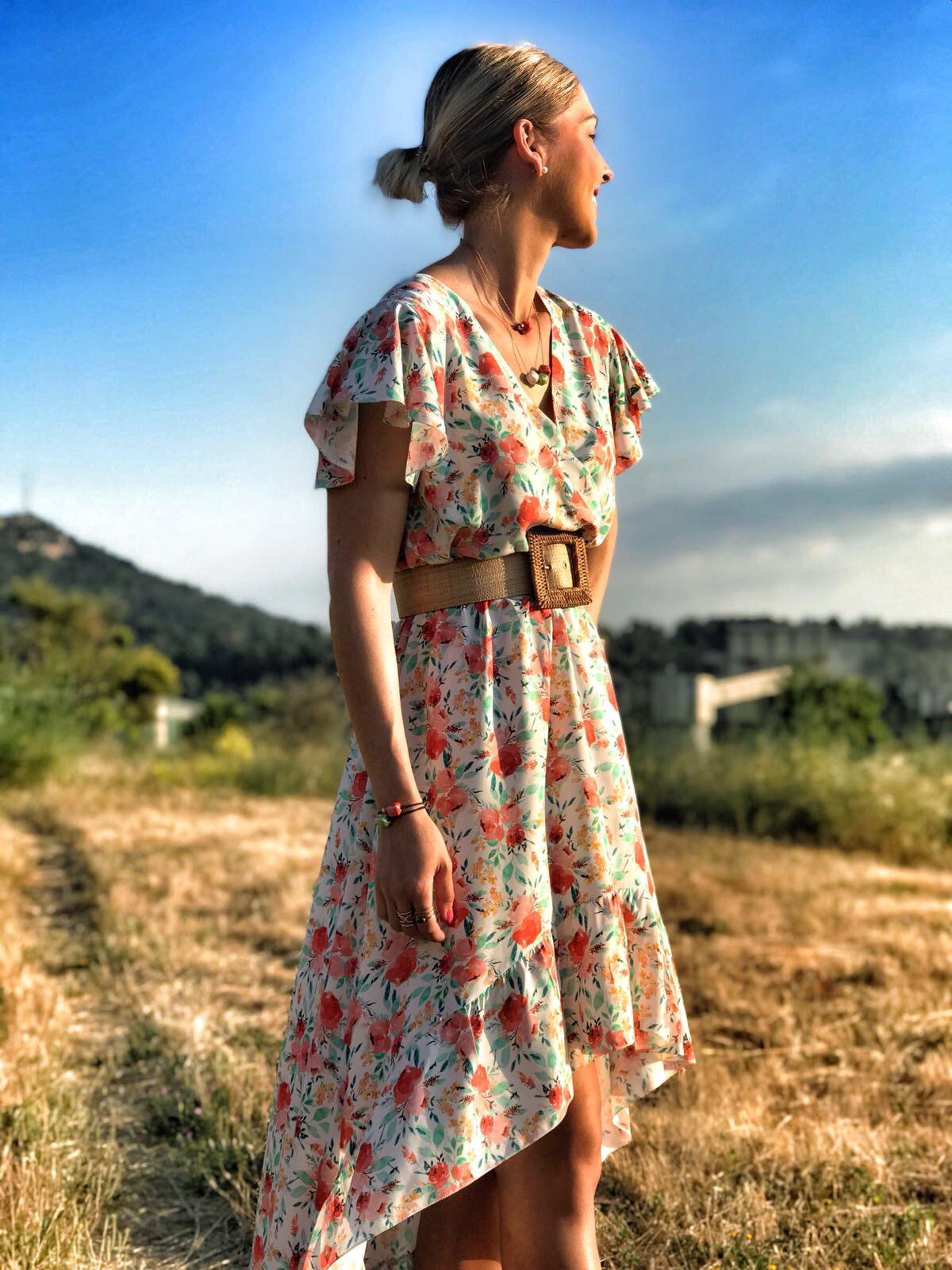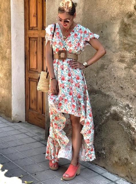 Vestido largo, escote cruzado y manga en volante estampado de flores. Una maravilla de vestido con una caída espectacular.