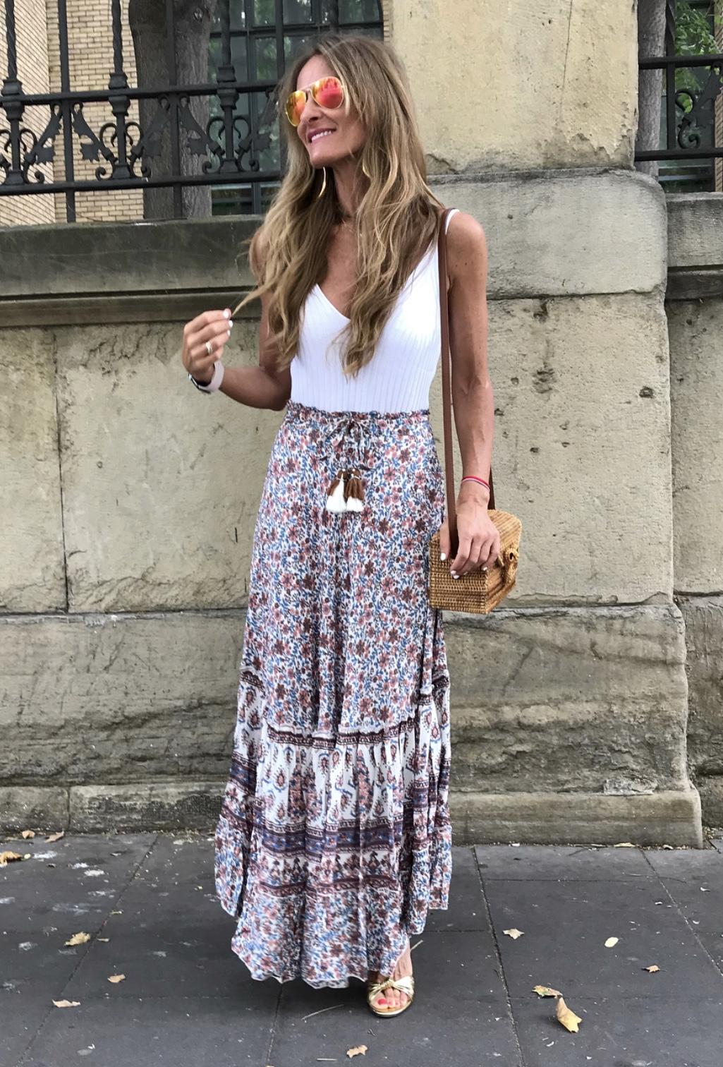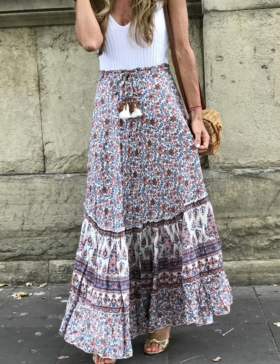 Falda larga de vuelo estampada con cintura elástica y cinta para anudar acabada en pompón. Los tonos son preciosos.