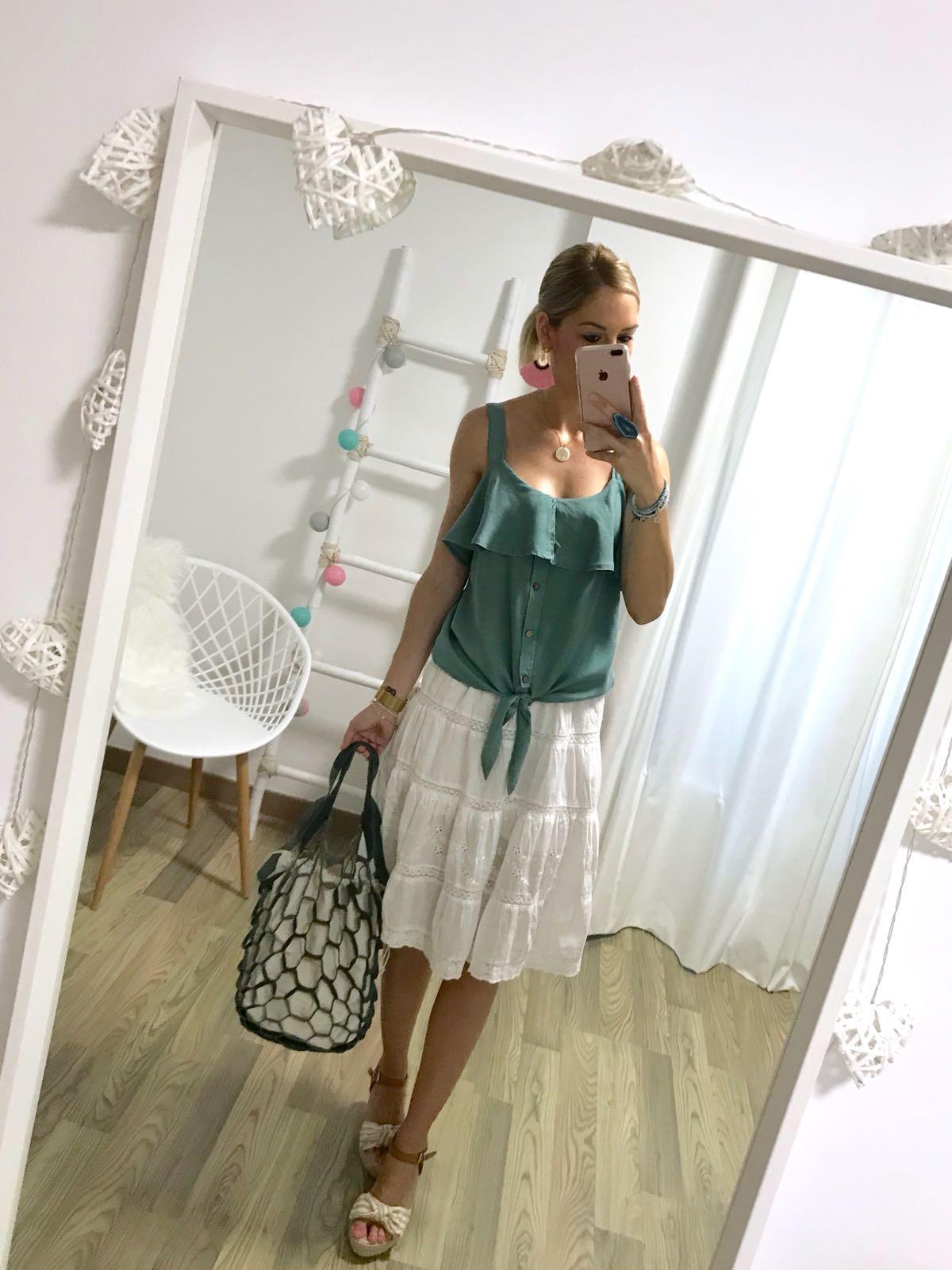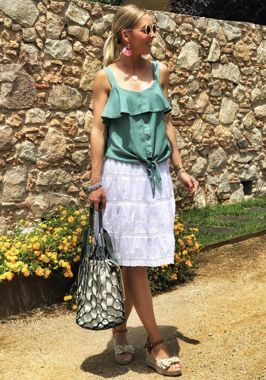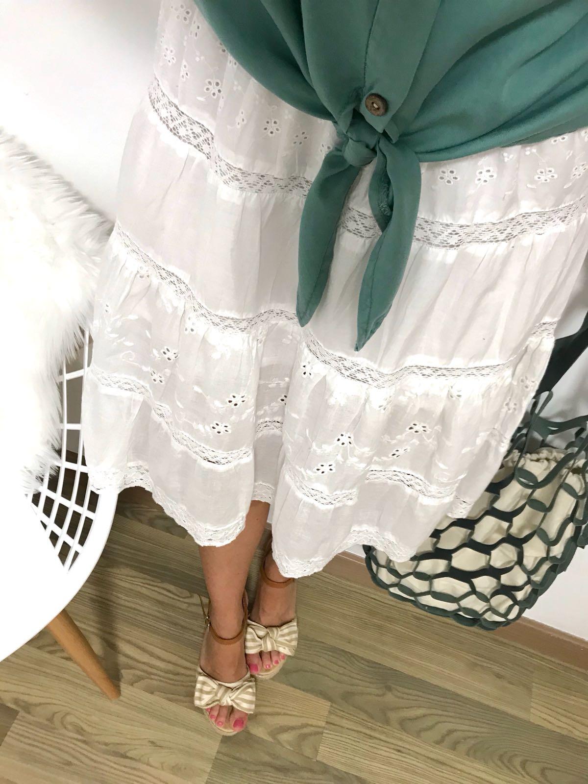 Falda de encaje midi en color blanco, una opción perfecta para combinar con la mayoría de tus tops. Nosotros la hemos combinado con nuestro top de tirantes y nudo en color verde, una combinación que nos encanta.