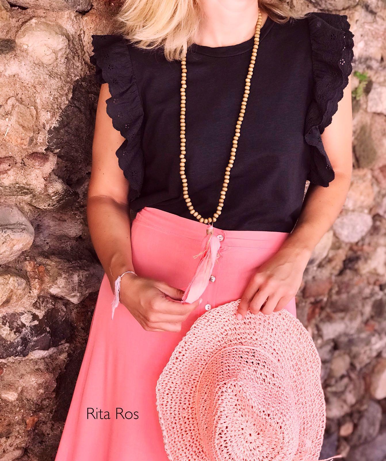 Una monnada de falda larga con una caída preciosa. La hemos combinado con nuestra camiseta Astrid en color gris, la combinación es genial.