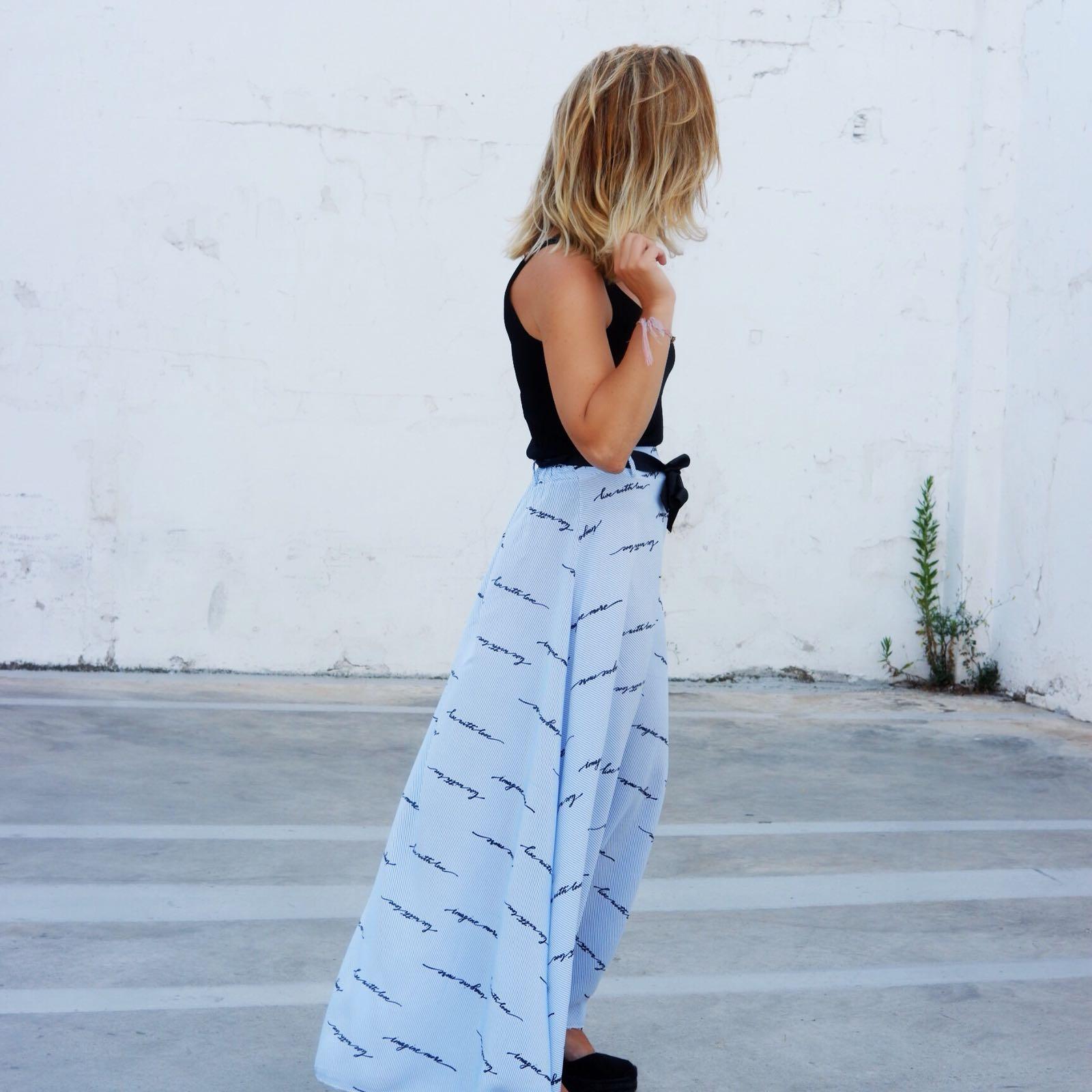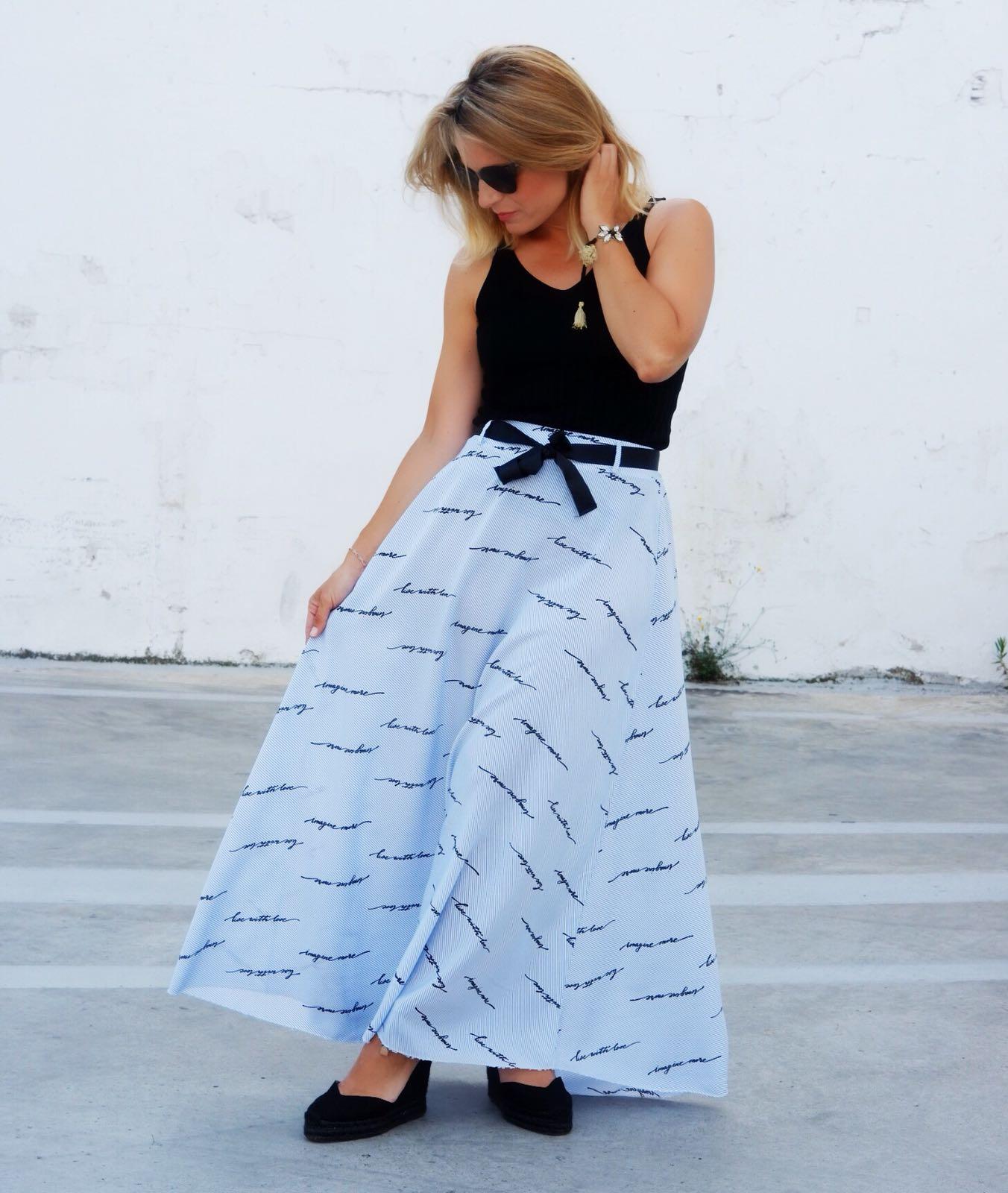 Elegante falda larga de vuelo estampada de rayas con detalle escrito y lazo en color negro. Es una falda preciosa con una caída que es una maravilla.