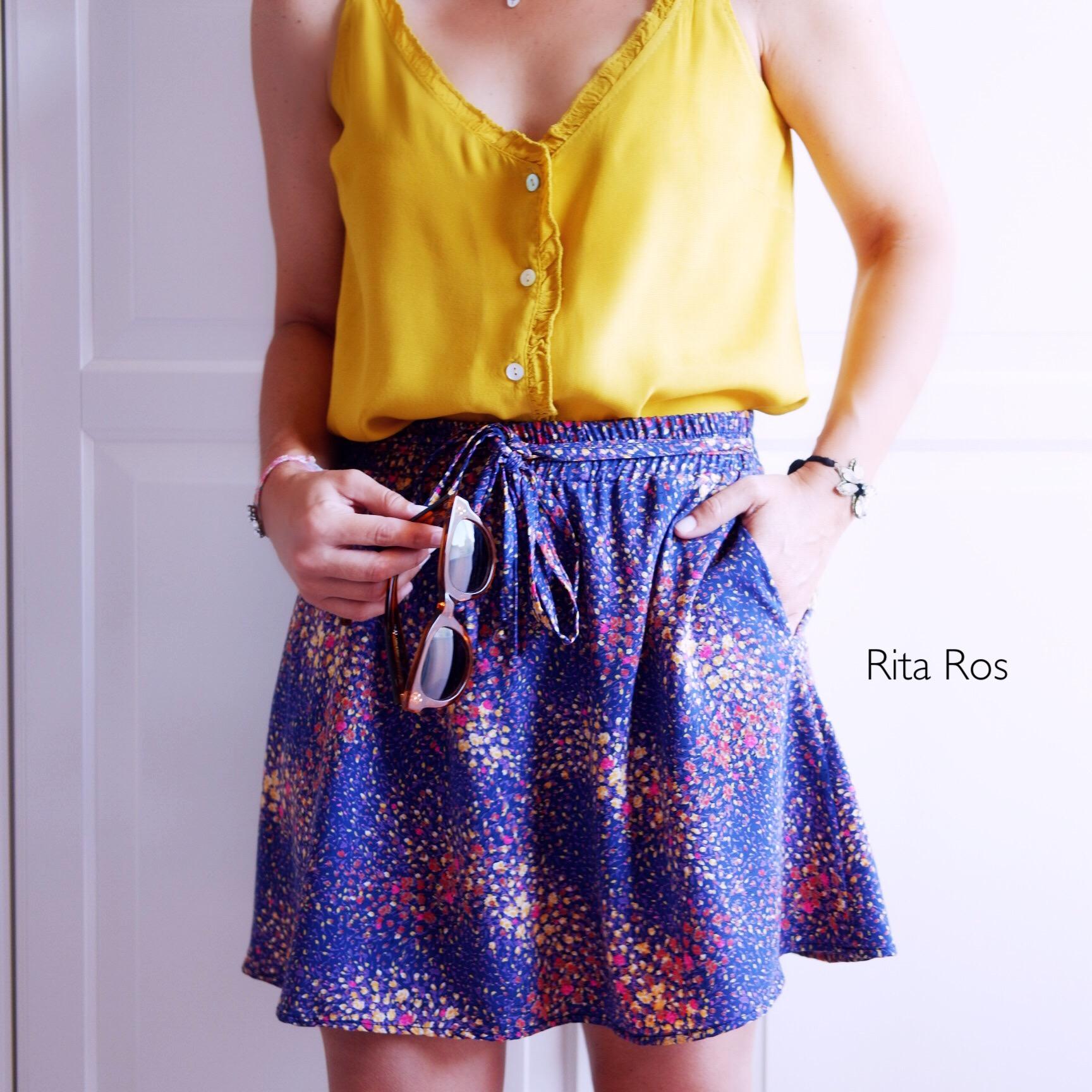 Falda corta estampada con una caída preciosa. La hemos combinado con nuestro top en color mostaza, la combinación te encantará.