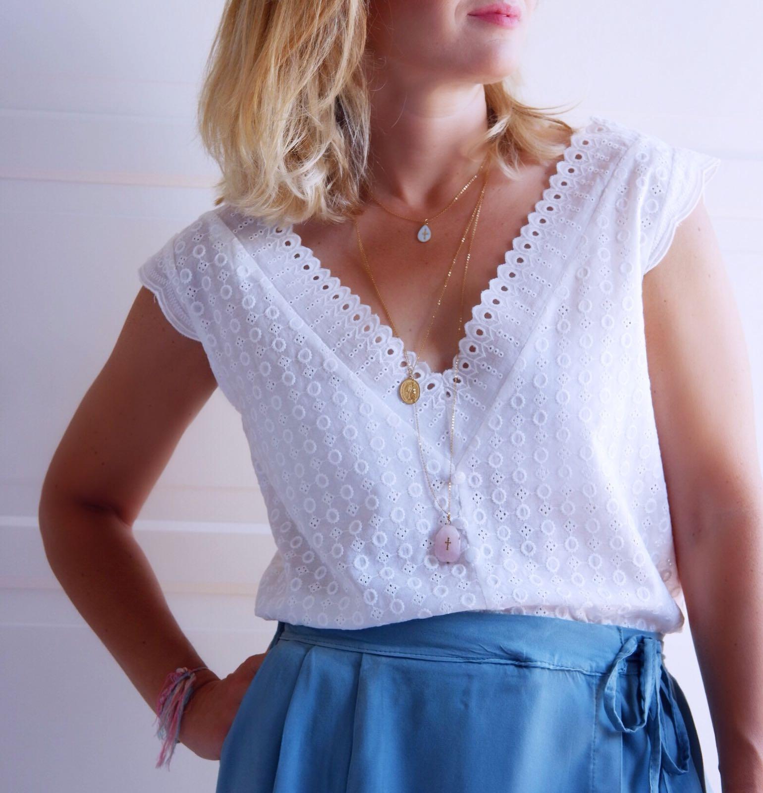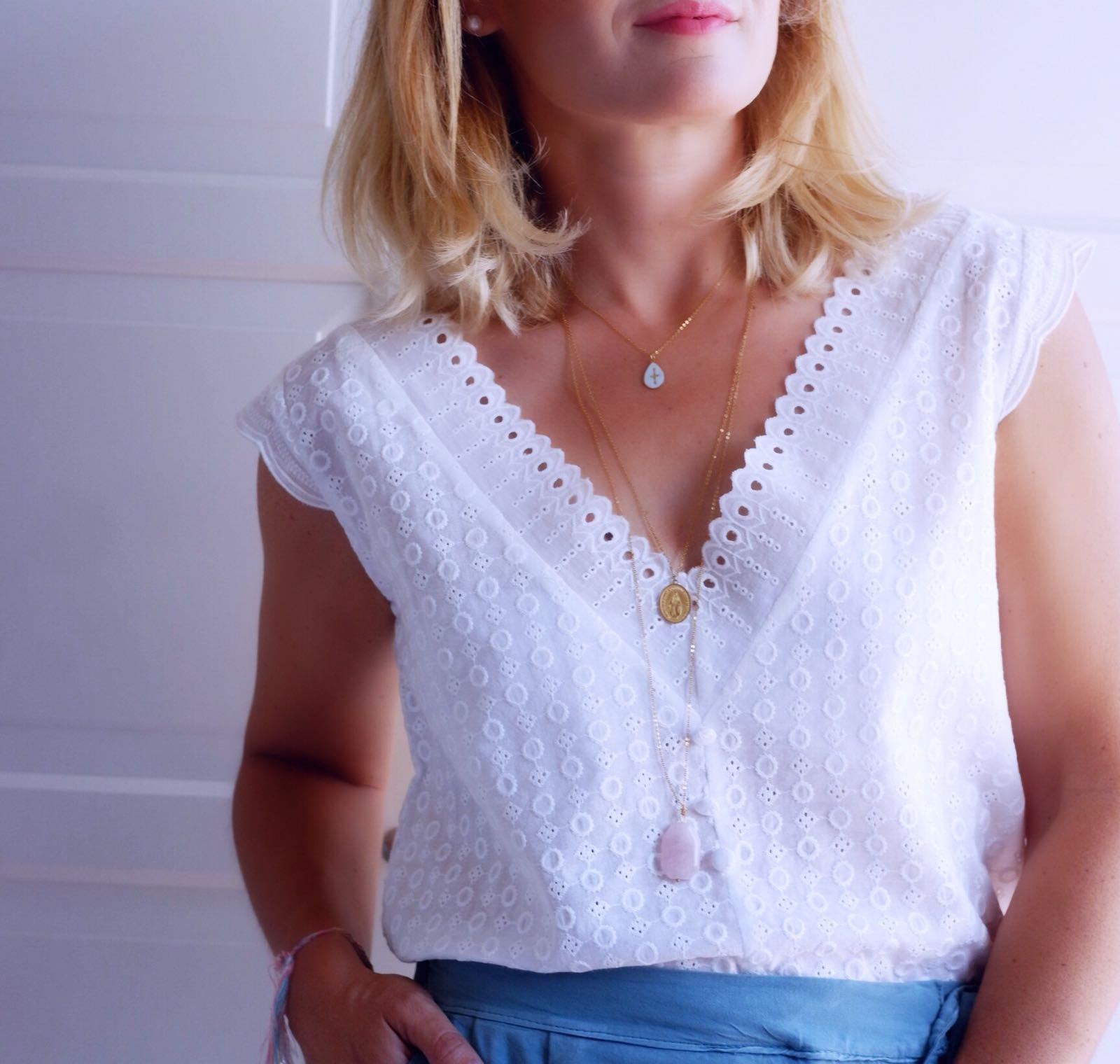 Blusa de algodón con bordados con doble pico en escote y espalda.