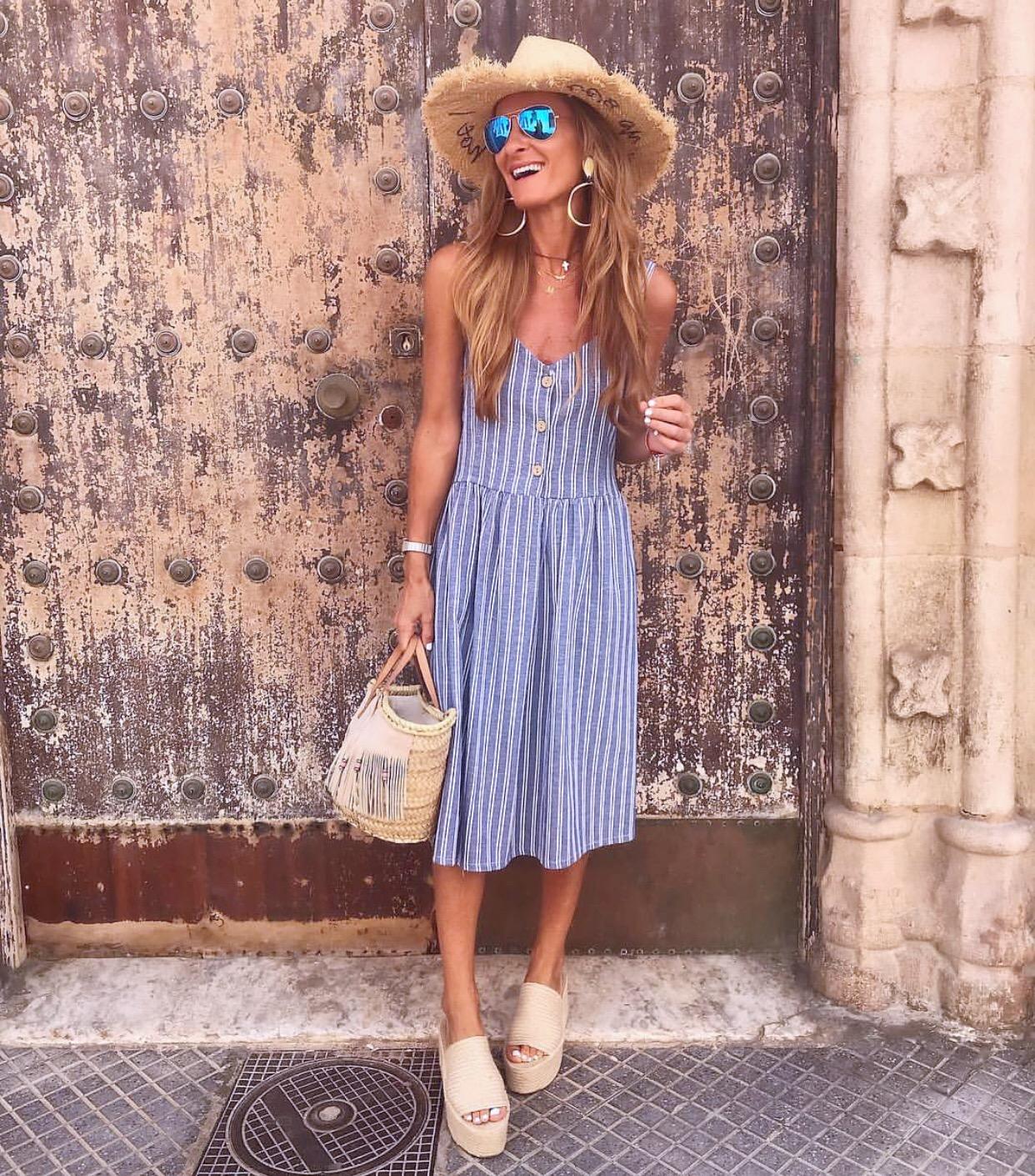 Vestido midi de tirantes estampado de rayas, escote de pico y detalle de botones de madera. Un vestido que sienta perfecto!!!
