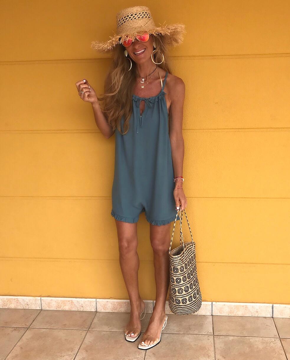 Mono corto de tirantes finos en tejido viscosa con una caída preciosa. Detalle lazo anudado en escote y volante en el bajo del pantalón.