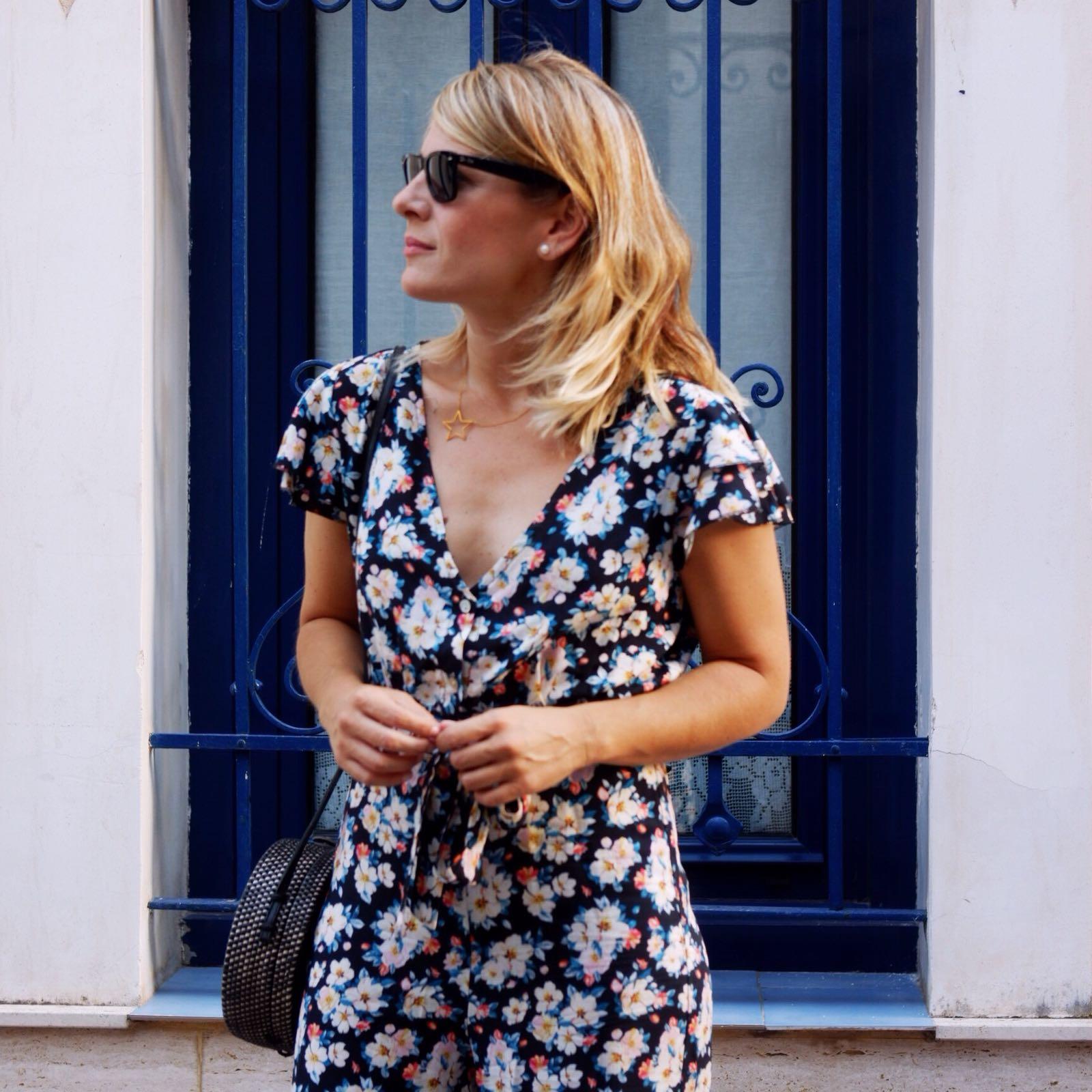 Mono largo tipo pesquero estampado de flores, manga corta y escote de pico.