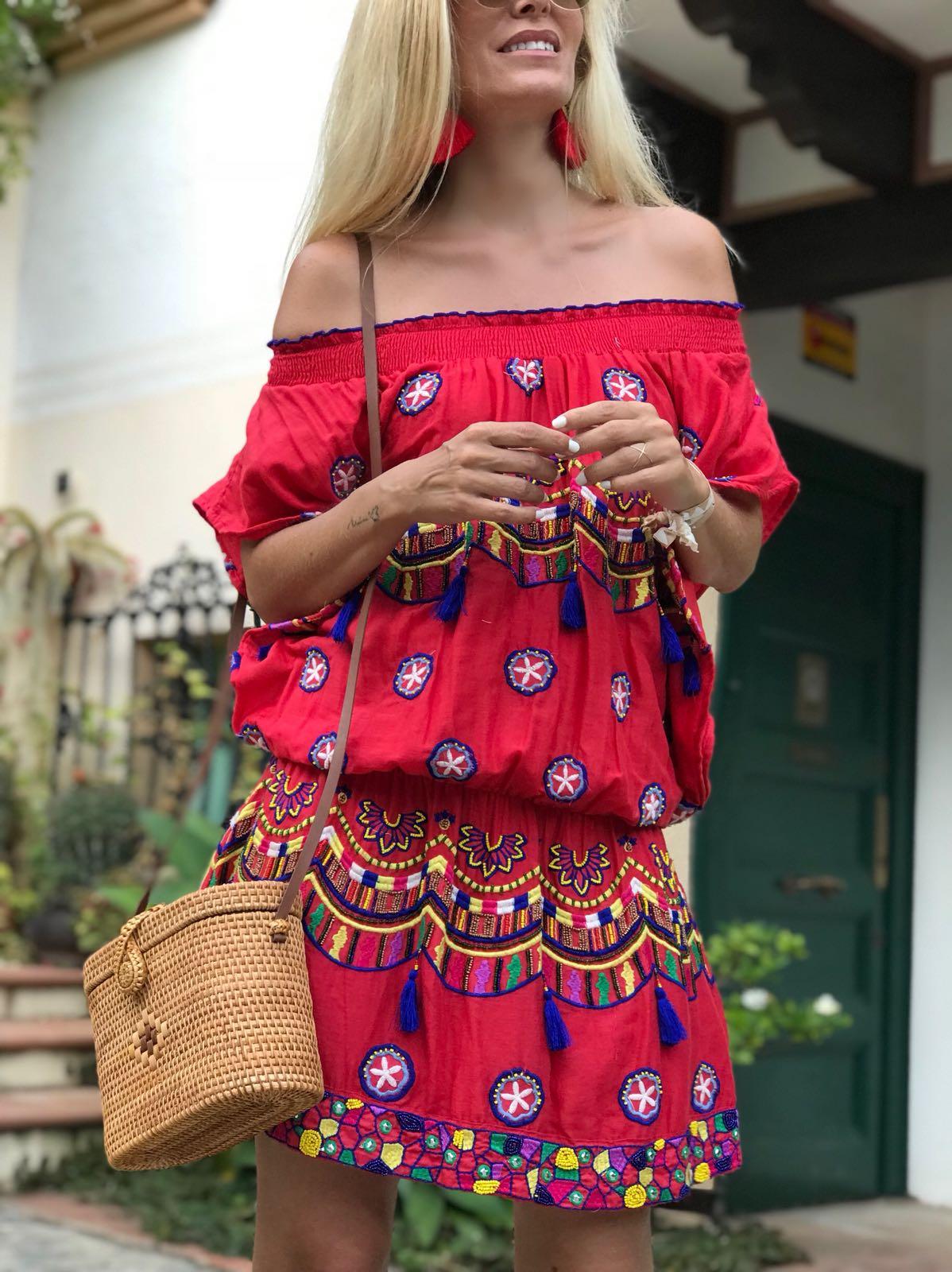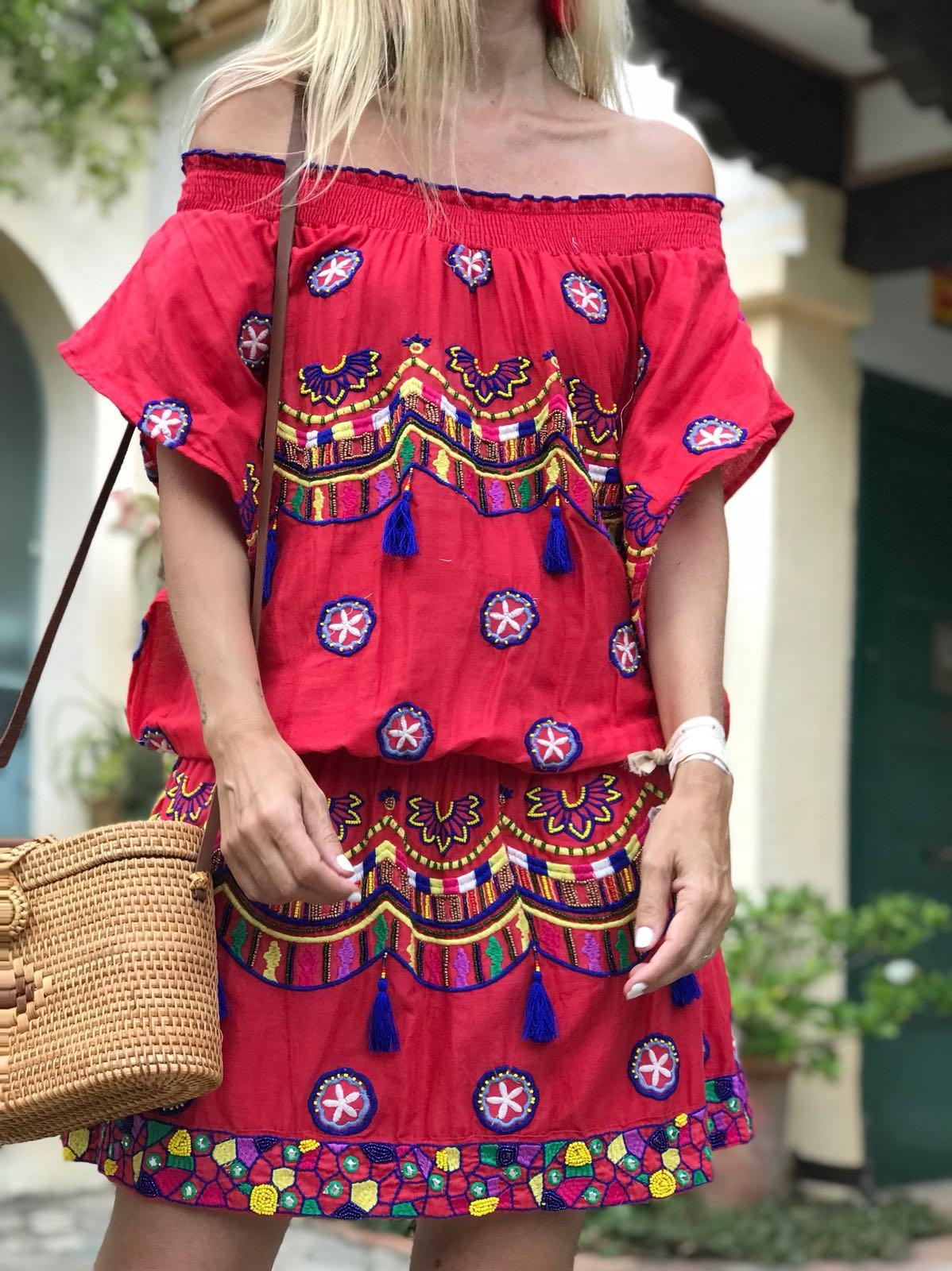 Precioso vestido corto de escote elástico y manga corta ancha con detalle bordados y pedrería en todo el vestido.