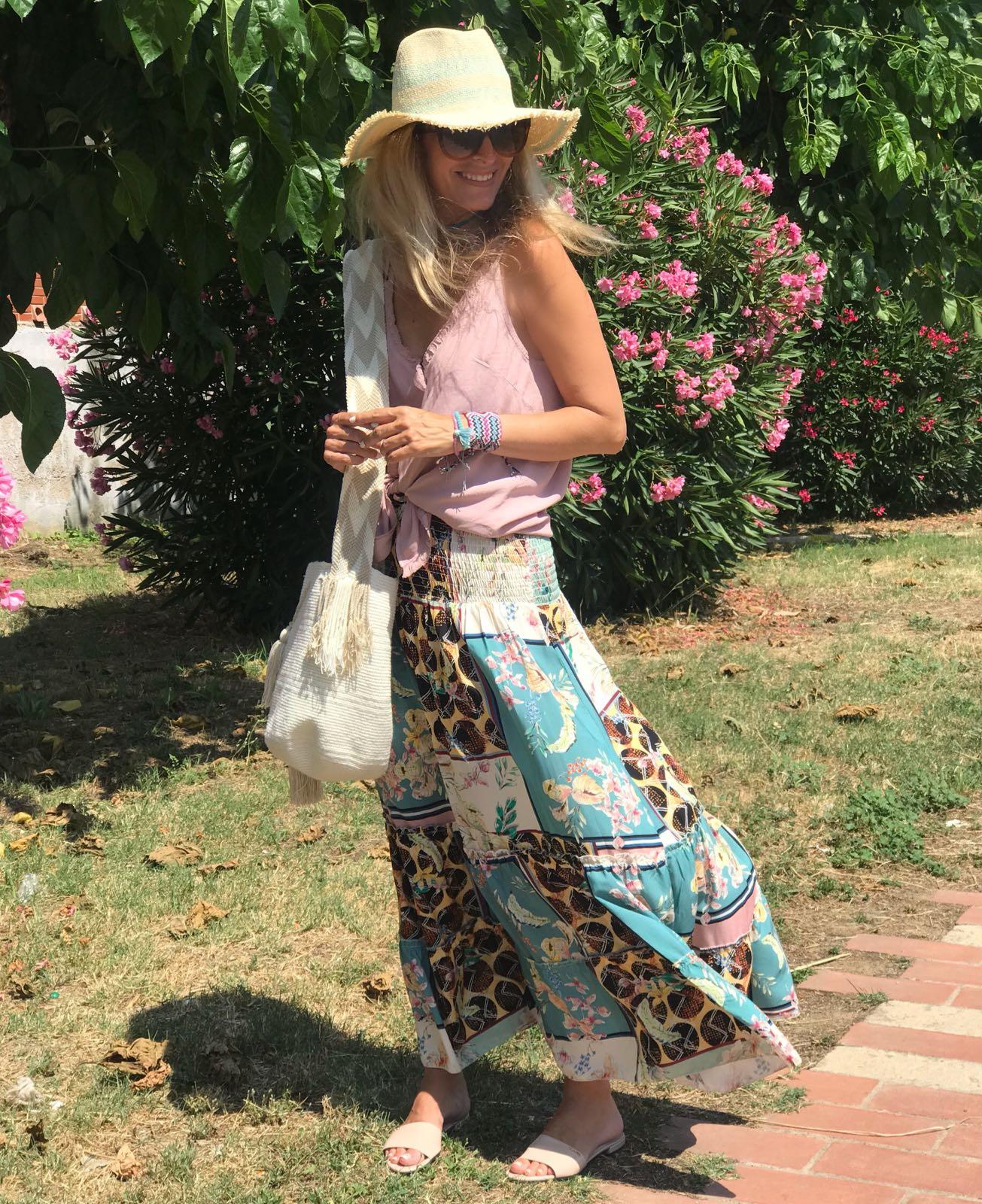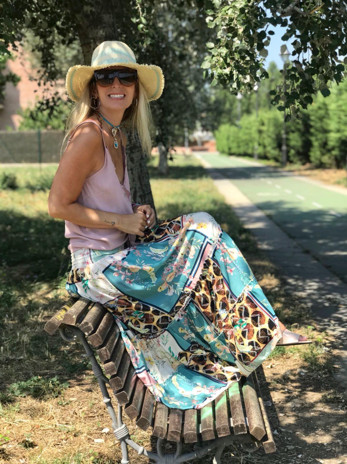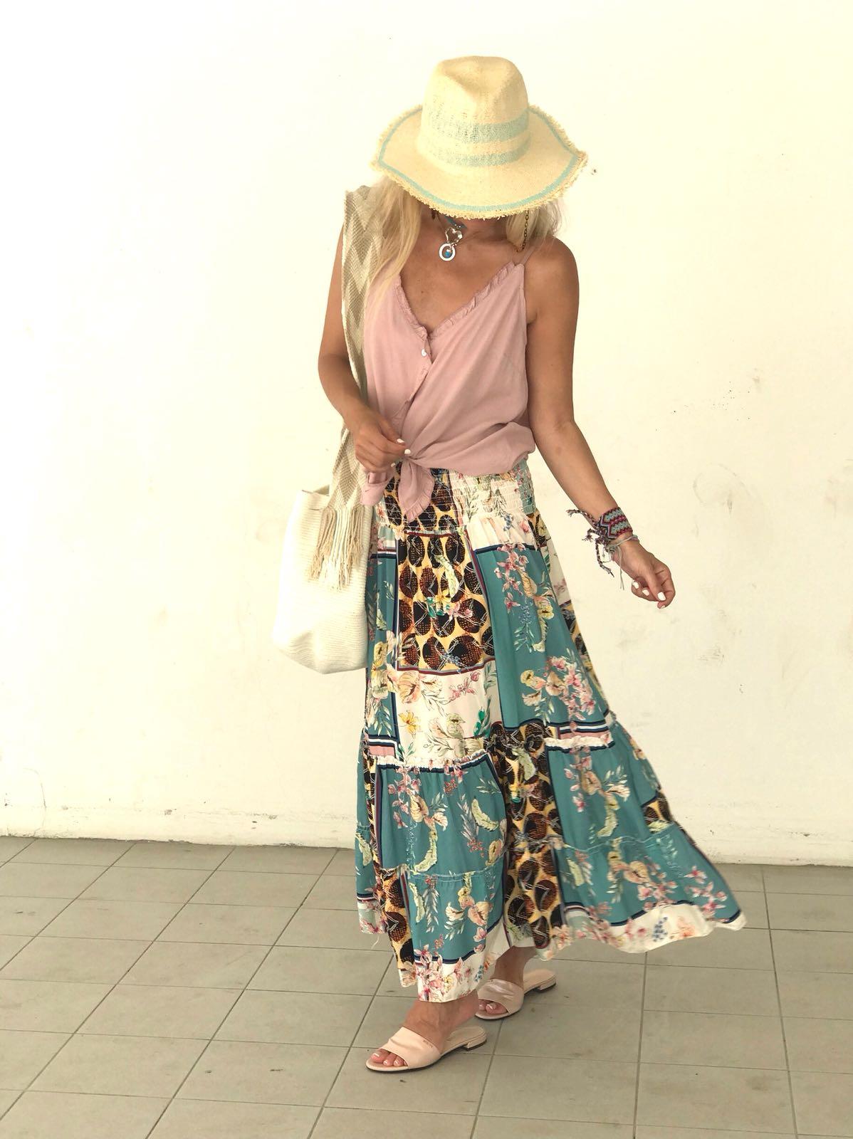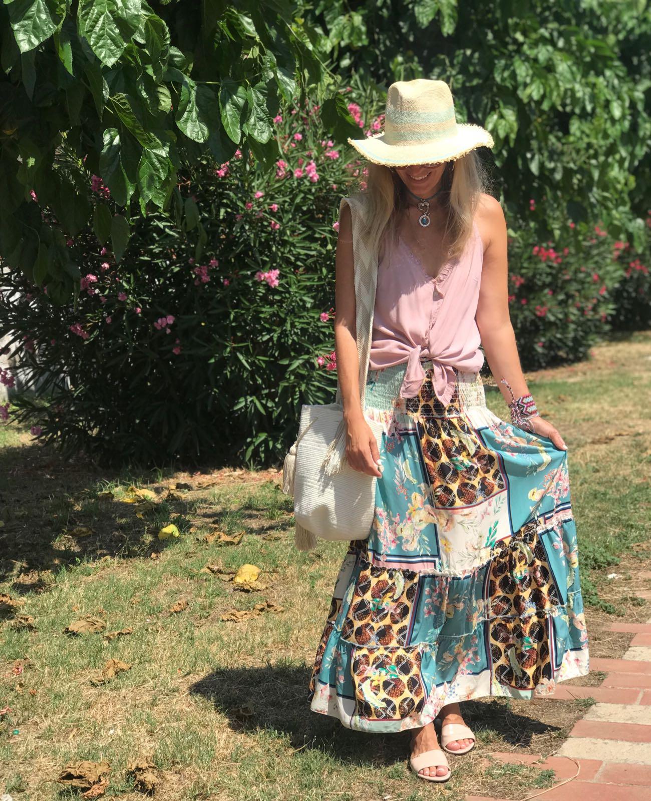 Falda larga de vuelo y cintura ancha de nido de abejacon un estampado precioso. La hemos combinado con nuestro top Grace en rosa palo y la combinación es perfecta.